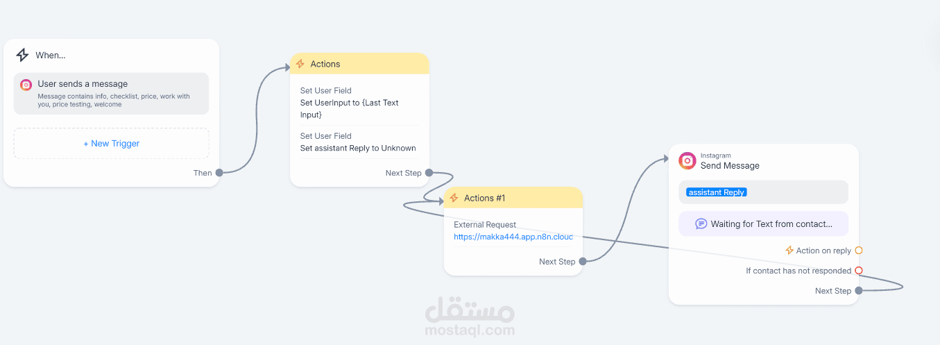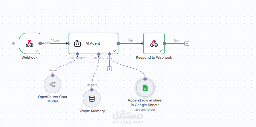 قمت بتنفيذ وكيل ذكاء اصطناعي ذكي يتفاعل آليًا مع رسائل عملاء إنستجرام عبر ManyChat، مع دمجه في منصة n8n لتنفيذ مهام مخصصة مثل حفظ البيانات في Google Sheets أو الردود الذكية باستخدام OpenRouter Chat Model.