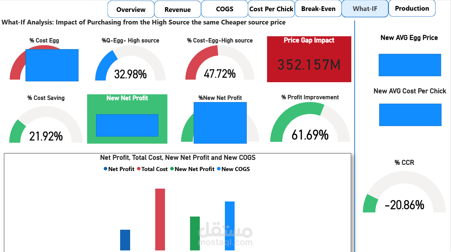 مع عرض مرئي لتغير التكاليف عبر الشهور وتحليل أسباب ارتفاعها، إلى جانب مقارنة الأسعار للبيض عبر الشهور لكل مصدر ومؤشرات تكلفة التفريخ لكل بيضةخلال المعامل.