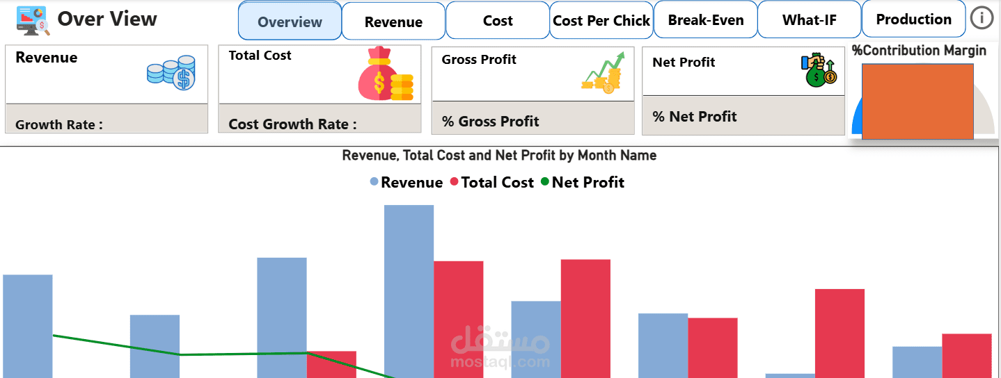 Overview: عرض أهم مؤشرات الأداء مثل الإيرادات، معدل النمو الشهري، إجمالي التكاليف، الأرباح الإجمالية والصافية، وهامش المساهمة، مع مخطط زمني يوضح العلاقة بين الإيرادات والتكاليف والأرباح وتحليل أسباب التراجع في بعض الفترات.