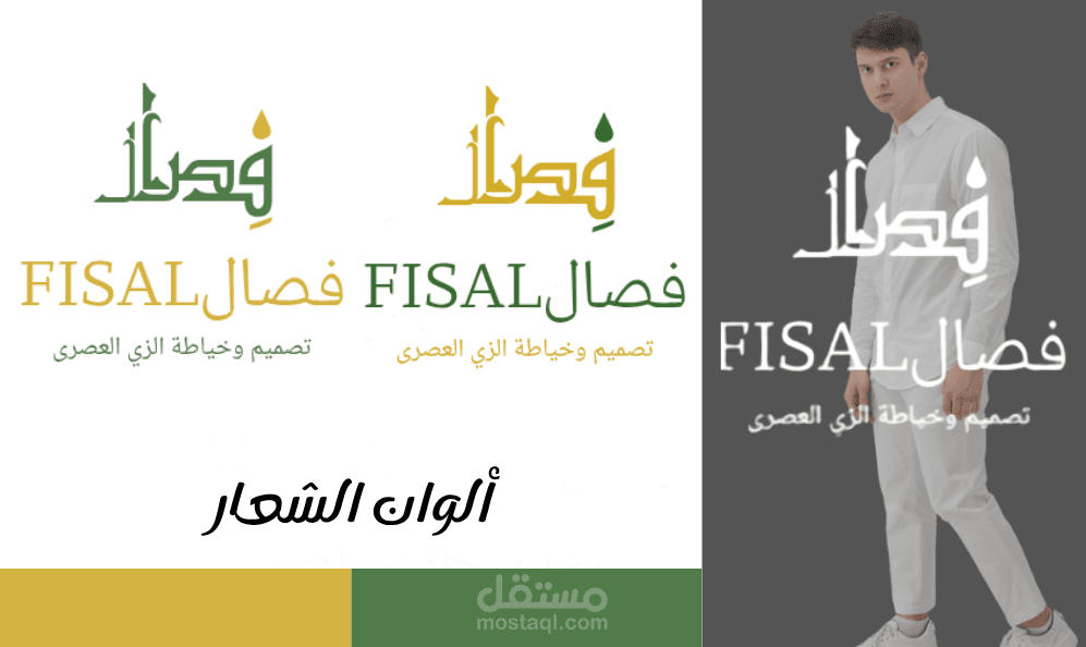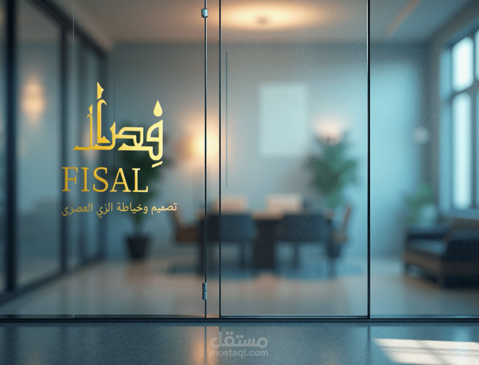 التوازن والفخامة البصرية: تم تحقيق تناسق بصري دقيق بين الخط العربي والاسم اللاتيني "FISAL" والنص الوصفي، مع اختيار موفق للألوان (الذهبي والأخضر الداكن) لتعزيز إحساس الرقي والفخامة الذي يتناسب مع مجال الأزياء الراقية.