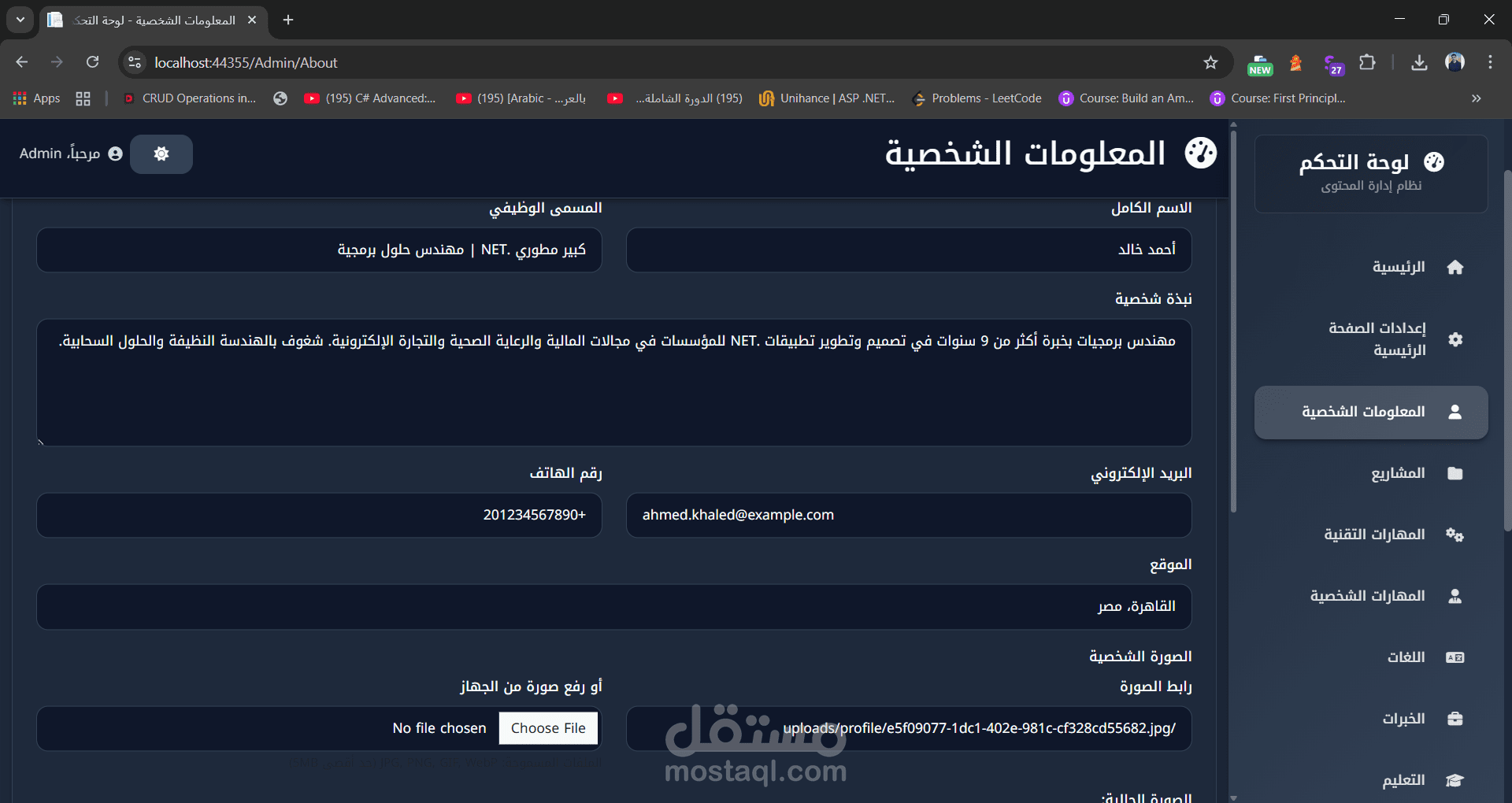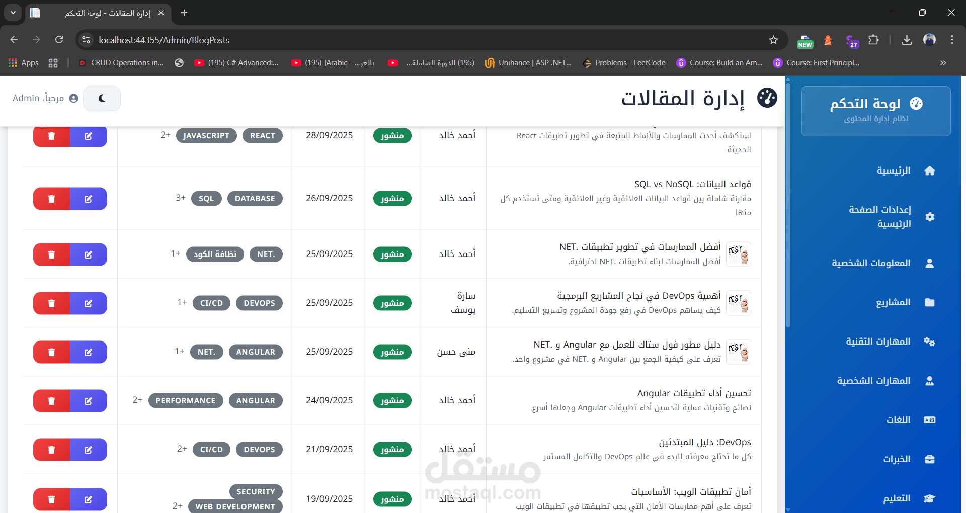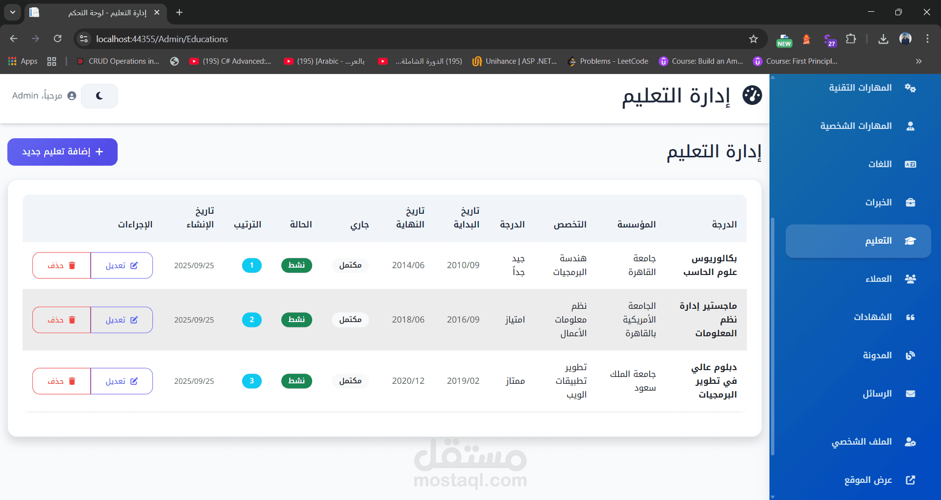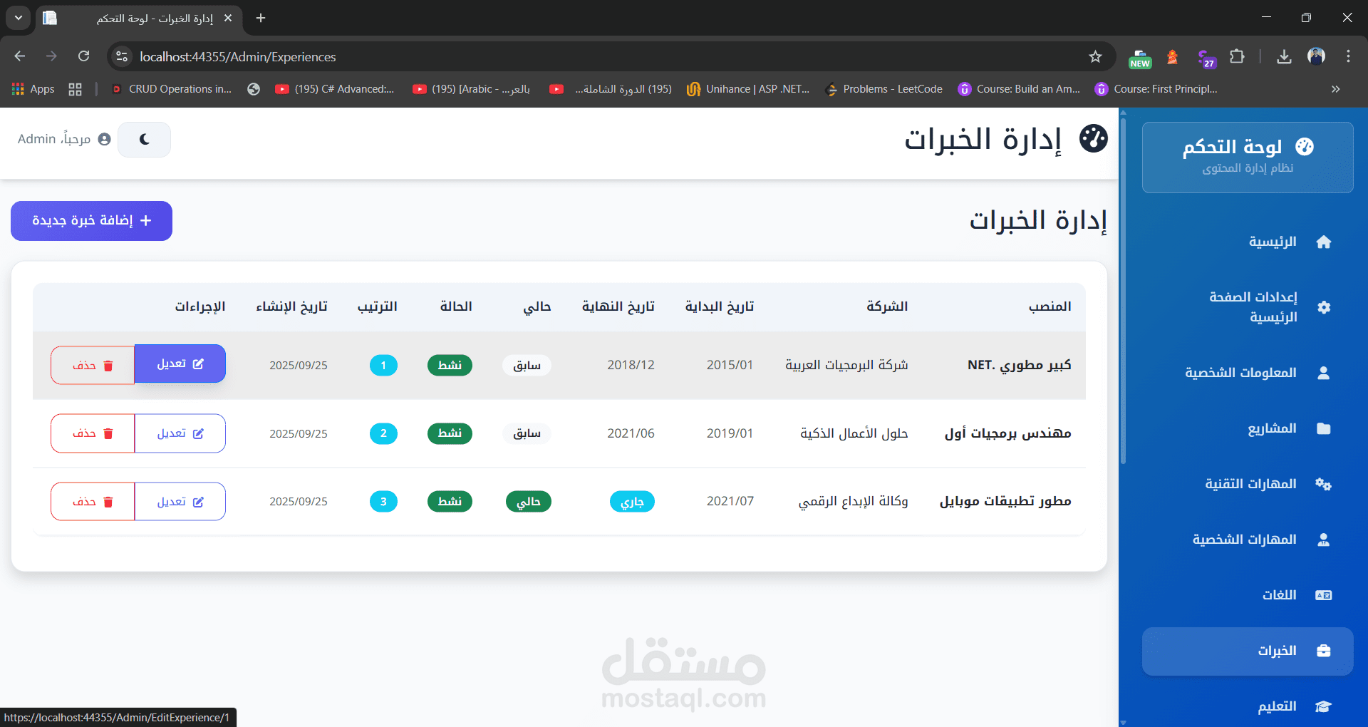 إدارة المحتوى: المشاريع، المهارات، الخبرات، التعليم