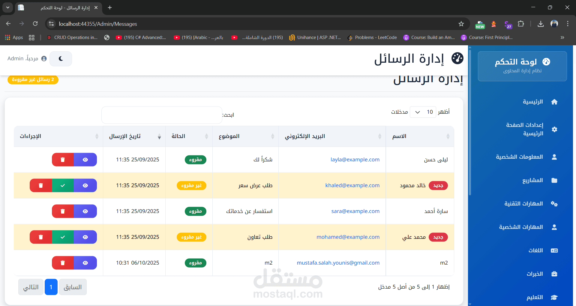 إدارة الرسائل: استقبال وقراءة رسائل الزوار