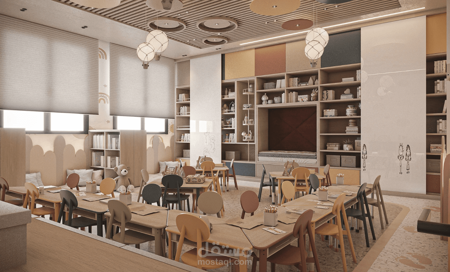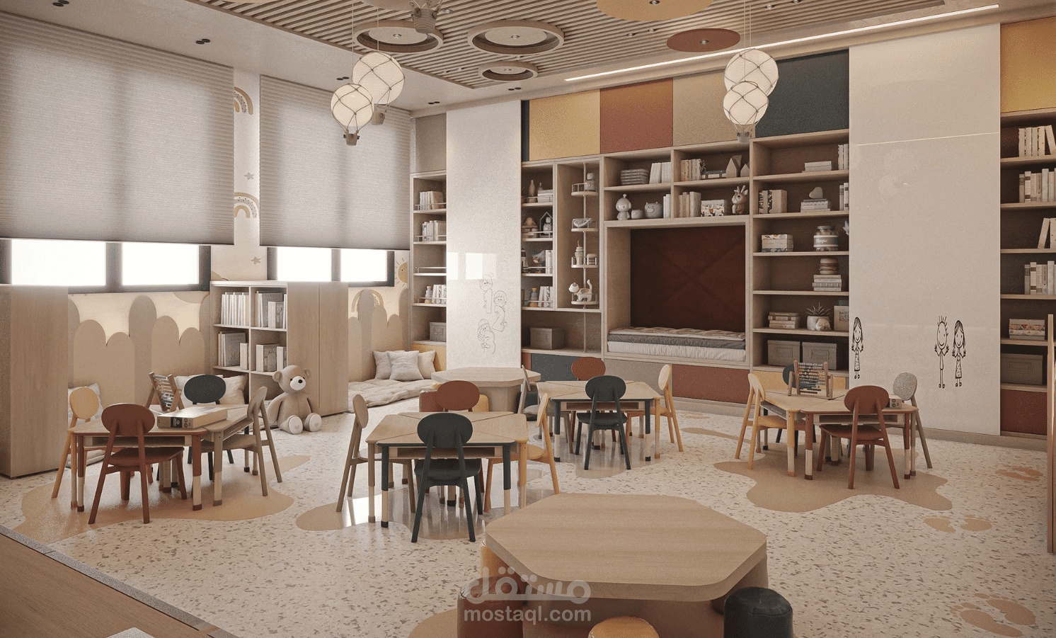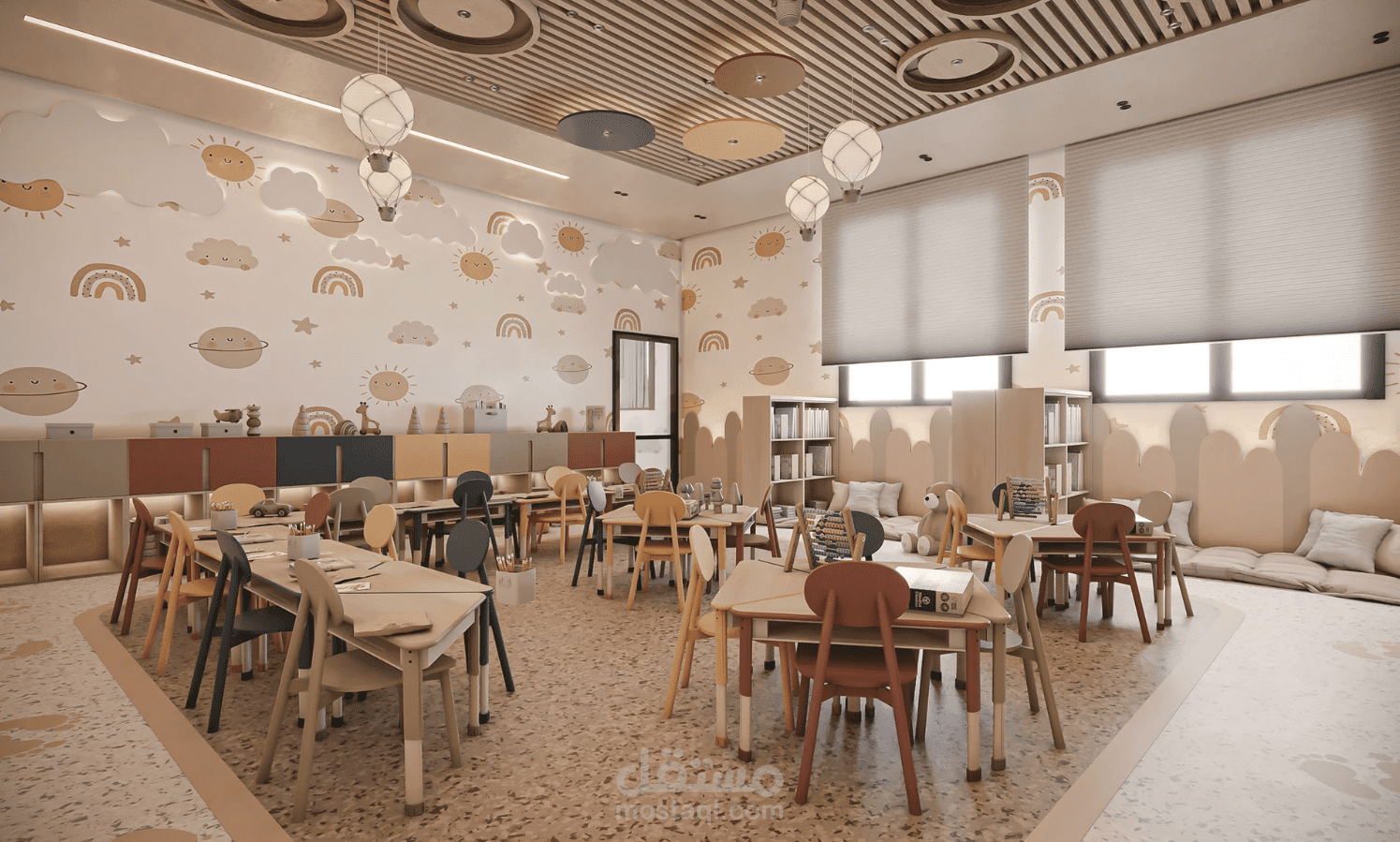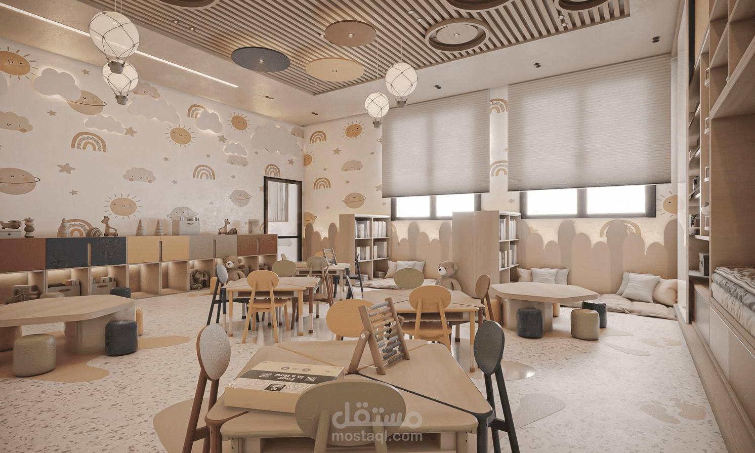 صُممت هذه الحضانة ضمن حرم مدرسة ثانوية، وتضمّ مساحات متعددة مخصصة للعب والتعلم والإبداع والراحة. ركّزتُ على خلق بيئة مشرقة ومبهجة وآمنة، حيث يمكن للأطفال الاستكشاف والتفاعل والتطور من خلال أنشطة متنوعة. صُمّمت كل منطقة - من ركن القراءة إلى محطات الأنشطة - لتحقيق التوازن بين المتعة والراحة والعملية.