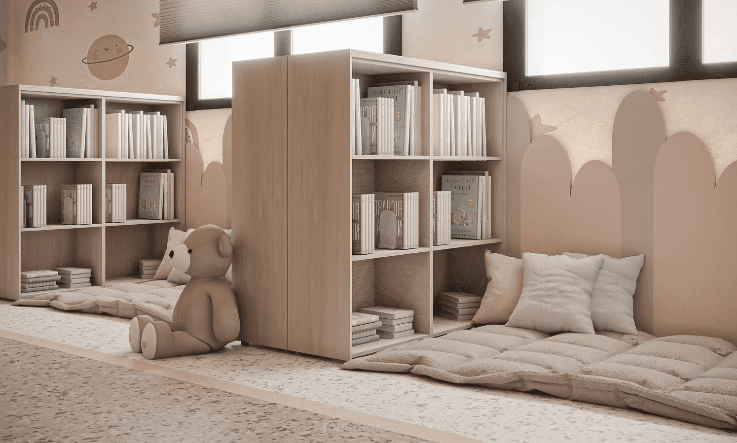 This nursery space, designed within a high school campus, includes multiple areas dedicated to play, learning, creativity, and rest. I focused on creating a bright, cheerful, and safe environment where children can explore, interact, and develop through different activities. Each zone—from the reading corner to the activity stations—was planned to balance fun, comfort, and functionality.