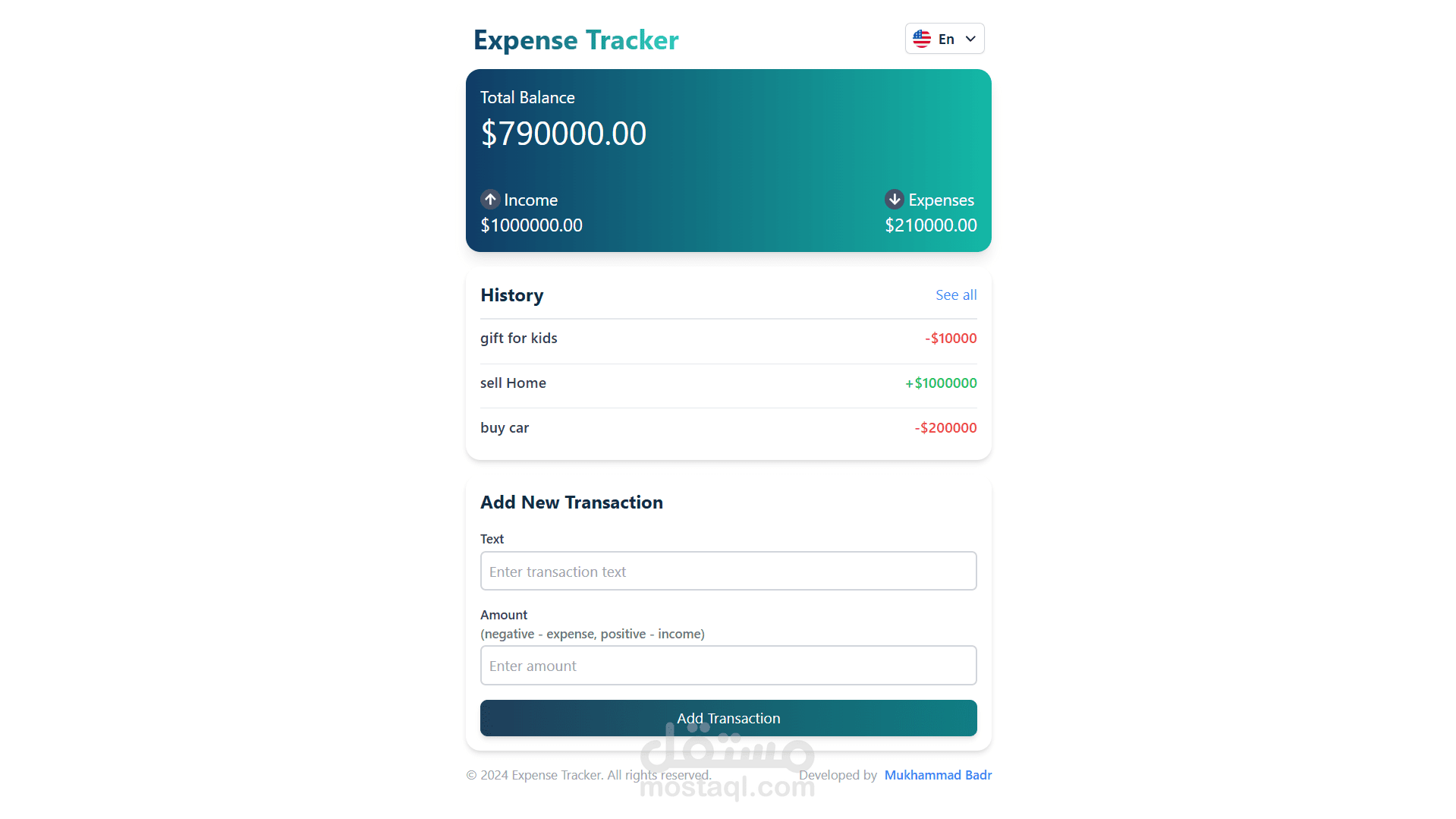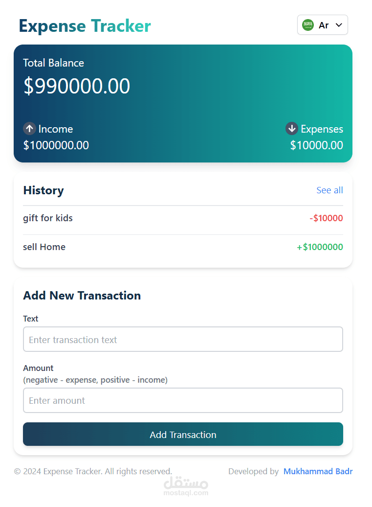 Expense Tracker هو تطبيق ويب تفاعلي مبتكر تم تطويره باستخدام مكتبة React لتقديم تجربة سلسة وبسيطة في تتبع المصاريف والإدارة المالية الشخصية. يهدف الموقع إلى تمكين المستخدم من تسجيل معاملاته المالية اليومية بكل سهولة ومتابعة حركة الأموال بدقة، الأمر الذي يساعده على التحكم في ميزانيته واتخاذ قرارات مالية أكثر وعيًا.