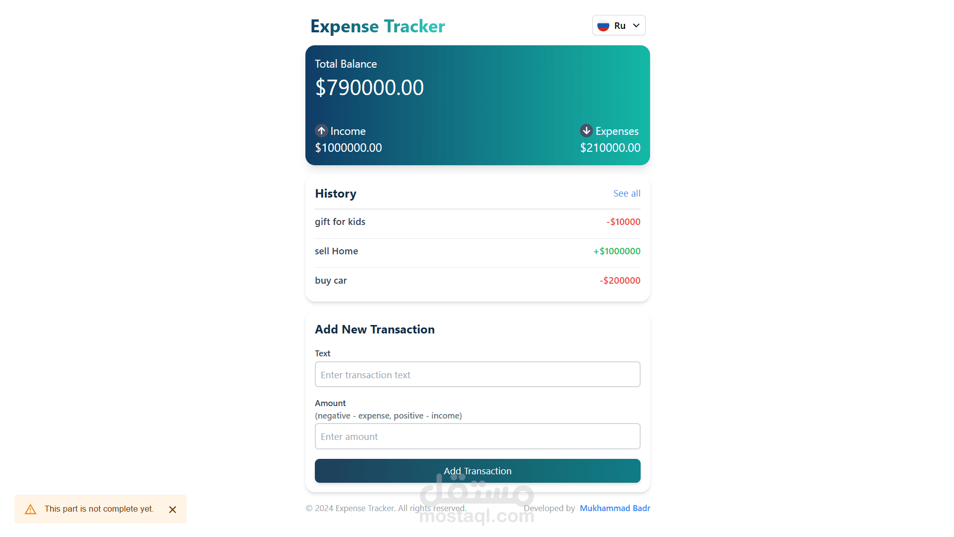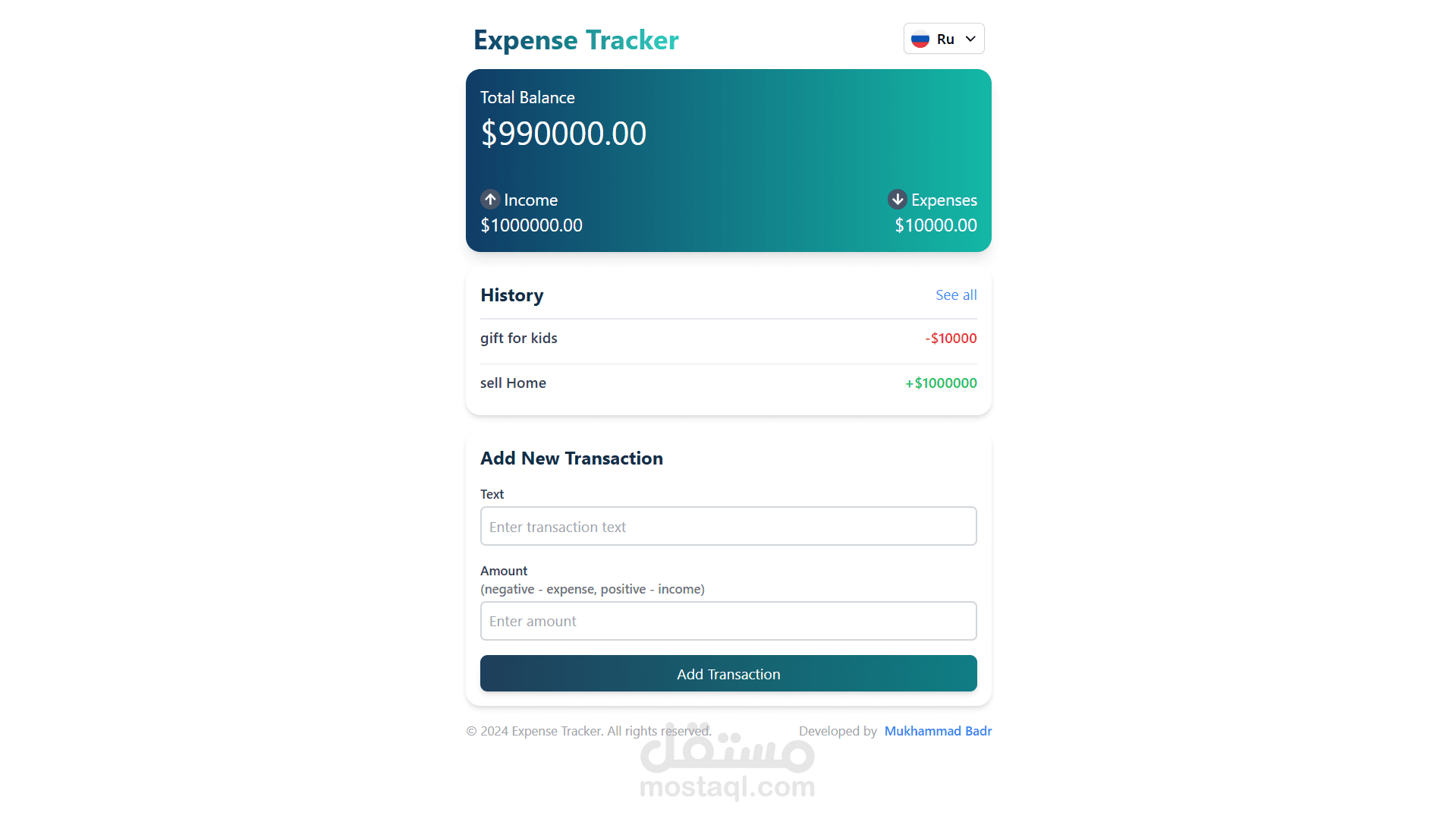 Expense Tracker is an innovative and interactive web application built using React to deliver a smooth and simple experience in managing personal finances and tracking expenses. The goal of the site is to empower users to easily record their daily financial transactions and accurately monitor their cash flow, helping them take better control of their budget and make more informed financial decisions.