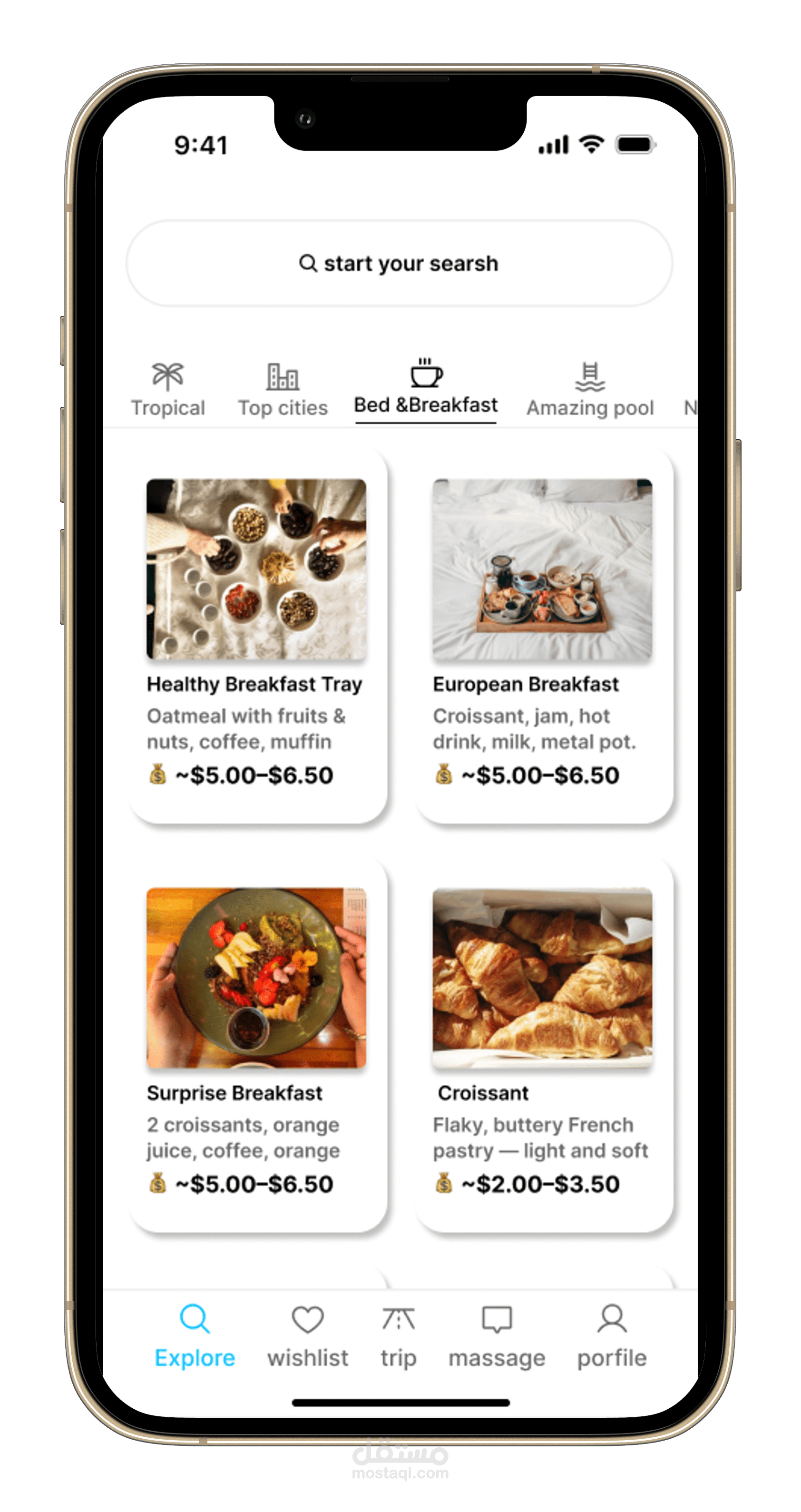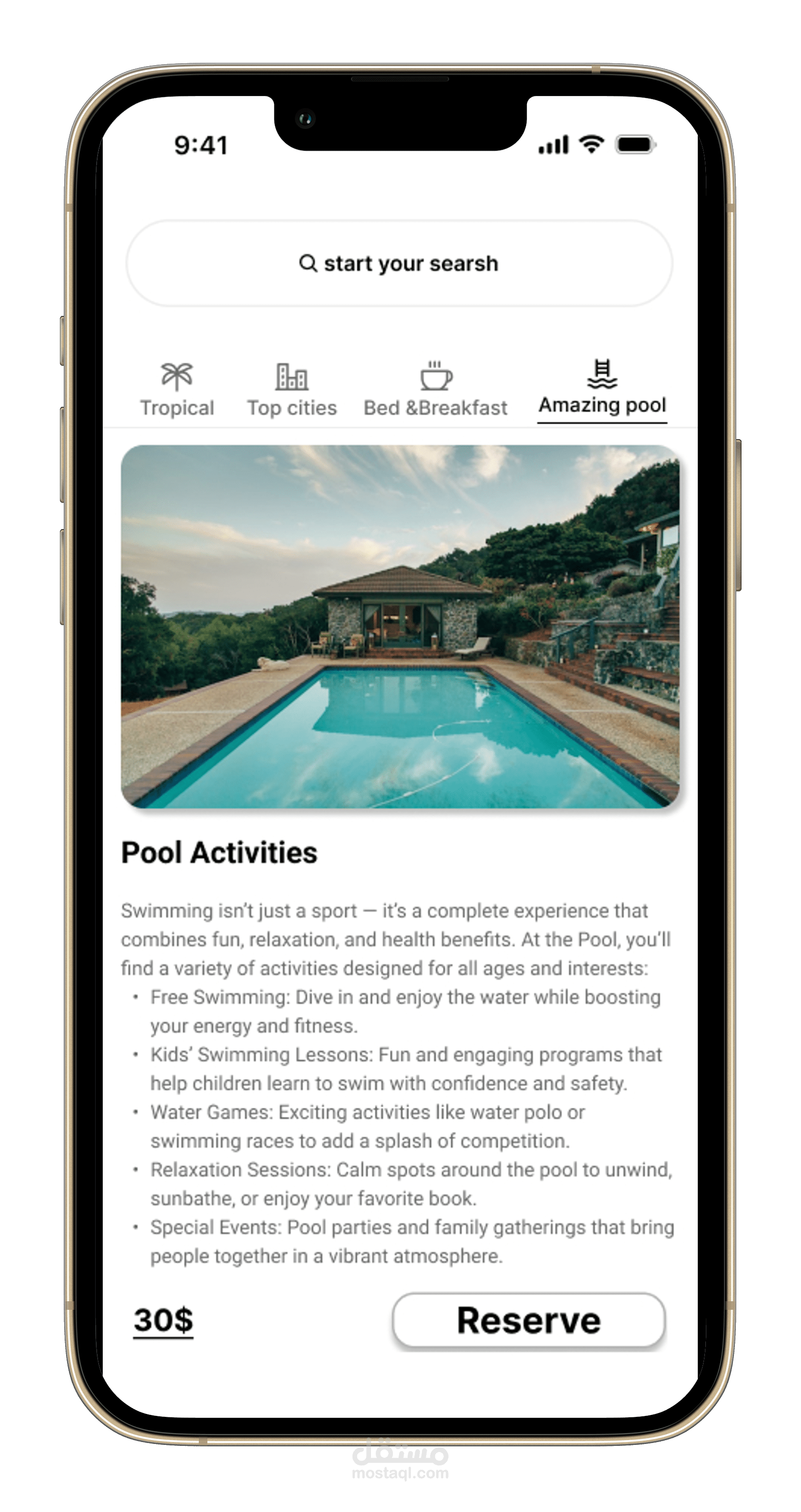 يشمل المشروع تصميم الشاشة الترحيبية، الصفحة الرئيسية، صفحات الوجهات (Tropical / Top Cities / Bed & Breakfast / Pool Activities) بالإضافة إلى صفحة التسجيل والدخول.