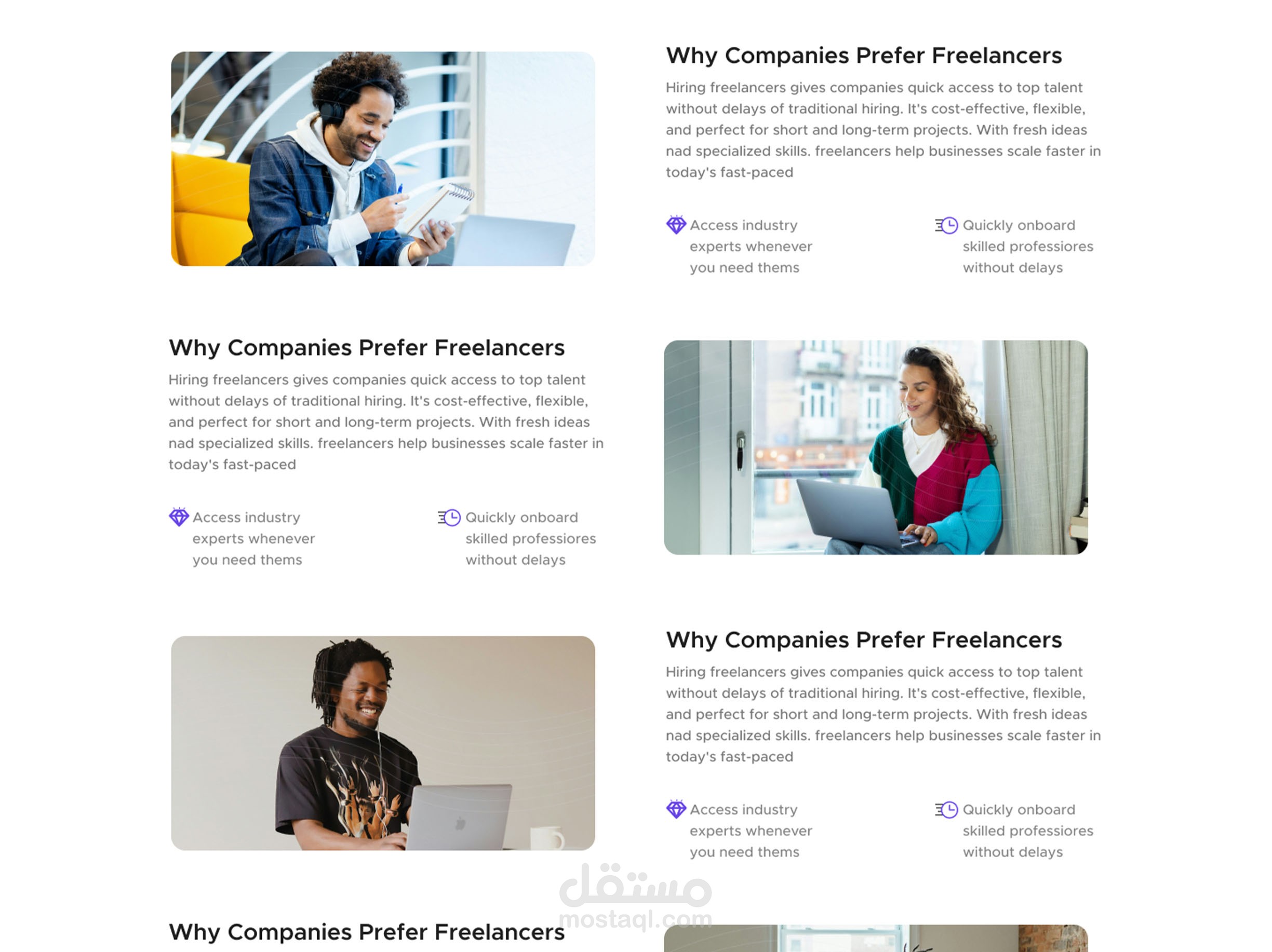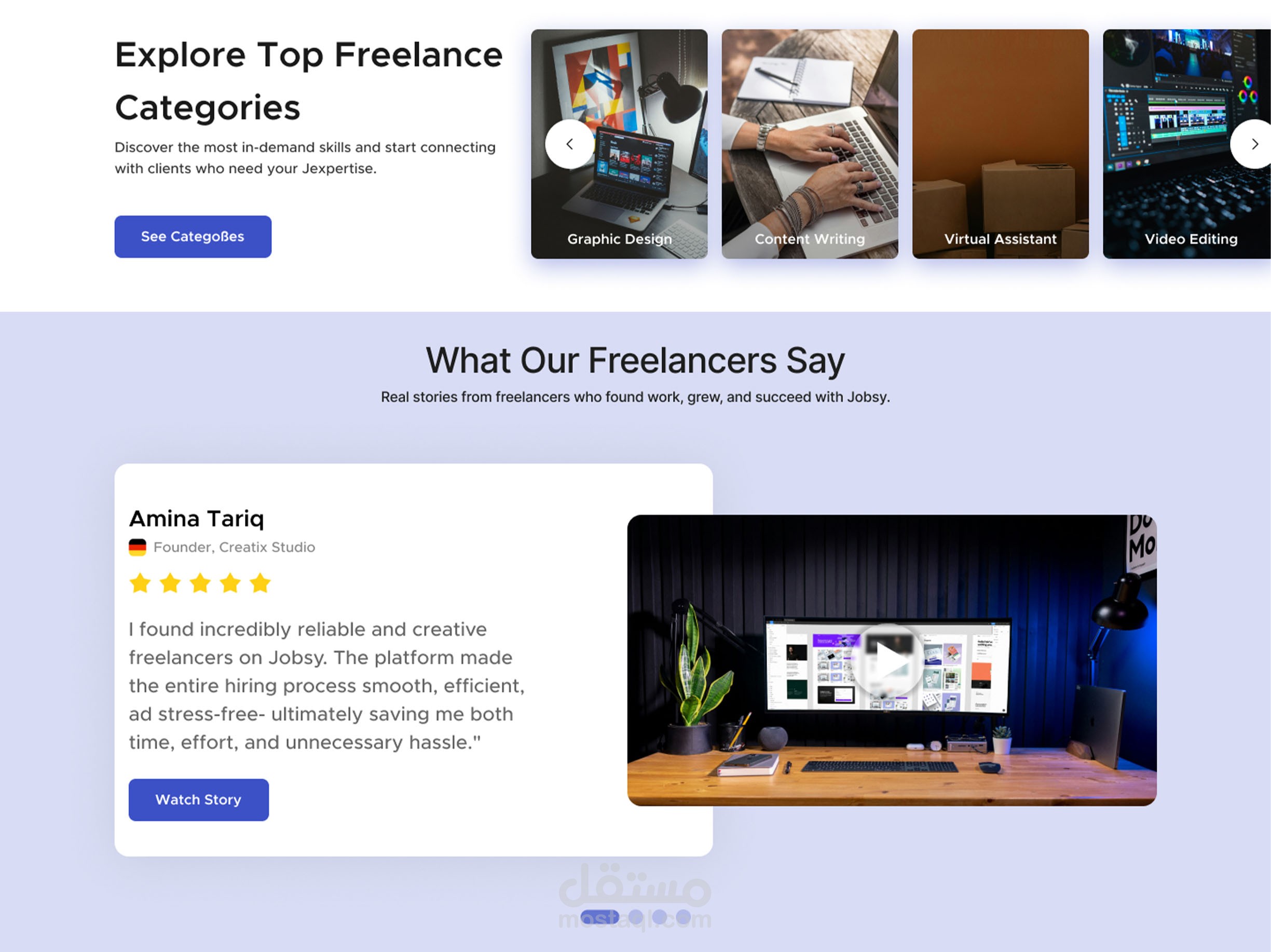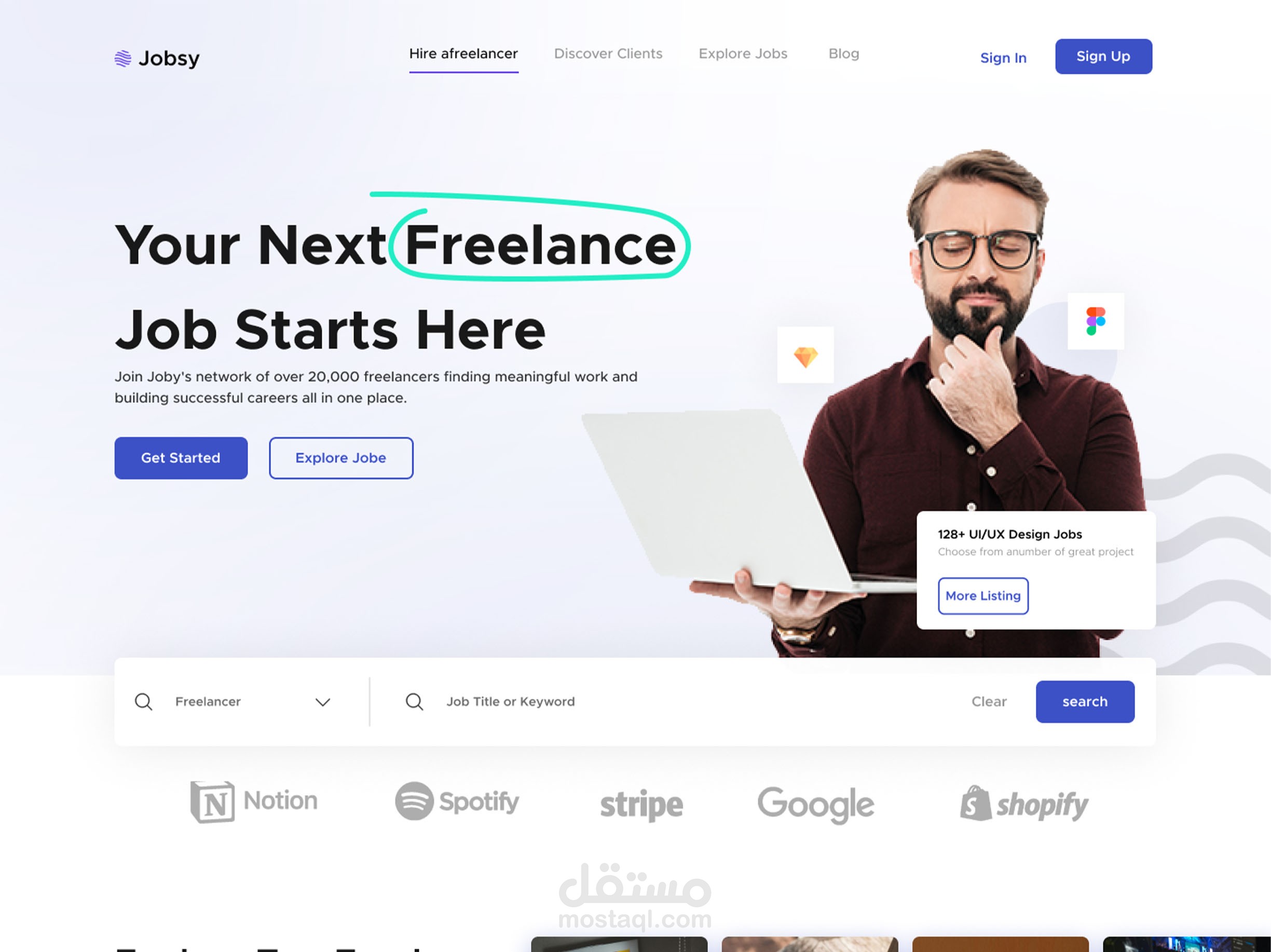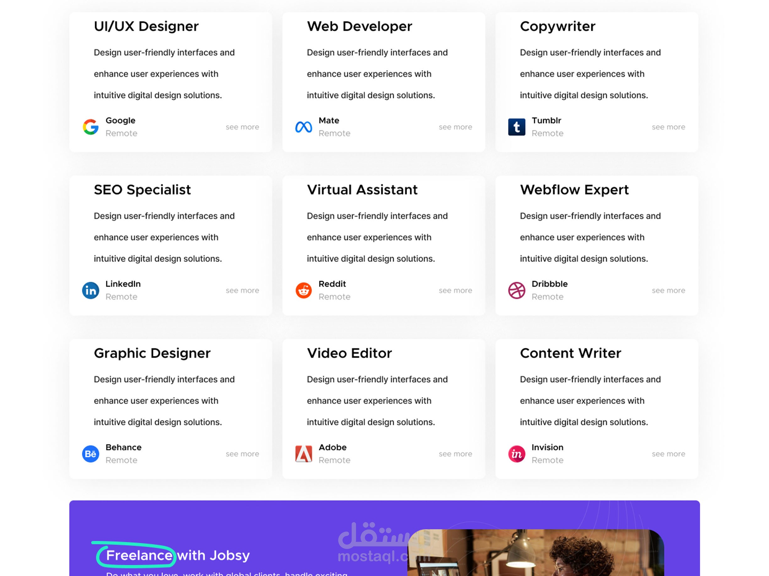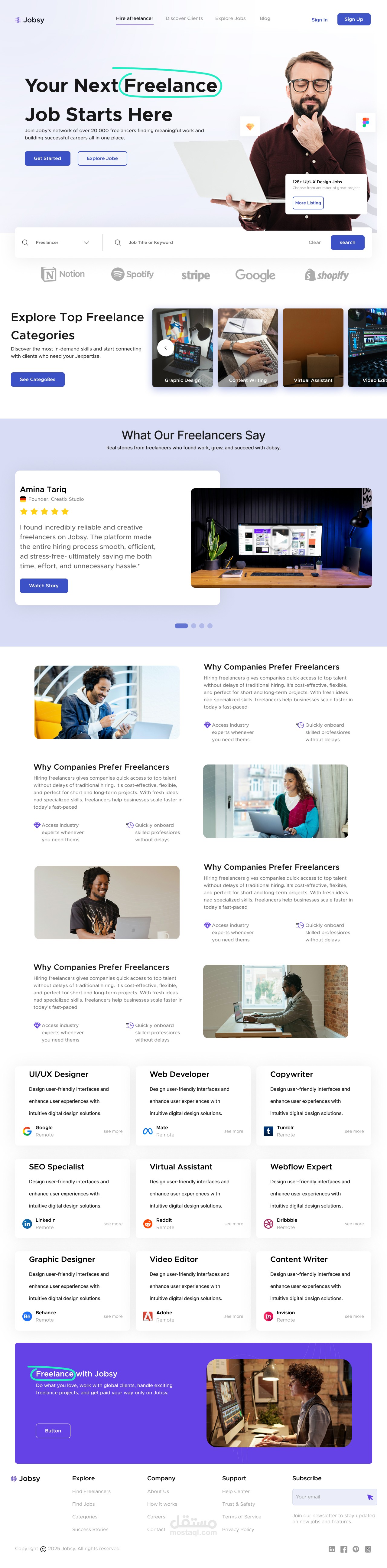 يشمل المشروع تصميم صفحات رئيسية مثل: الصفحة الرئيسية، نتائج البحث، ملف المستقل، تسجيل الدخول، لوحة التحكم، ونموذج إضافة المشاريع.