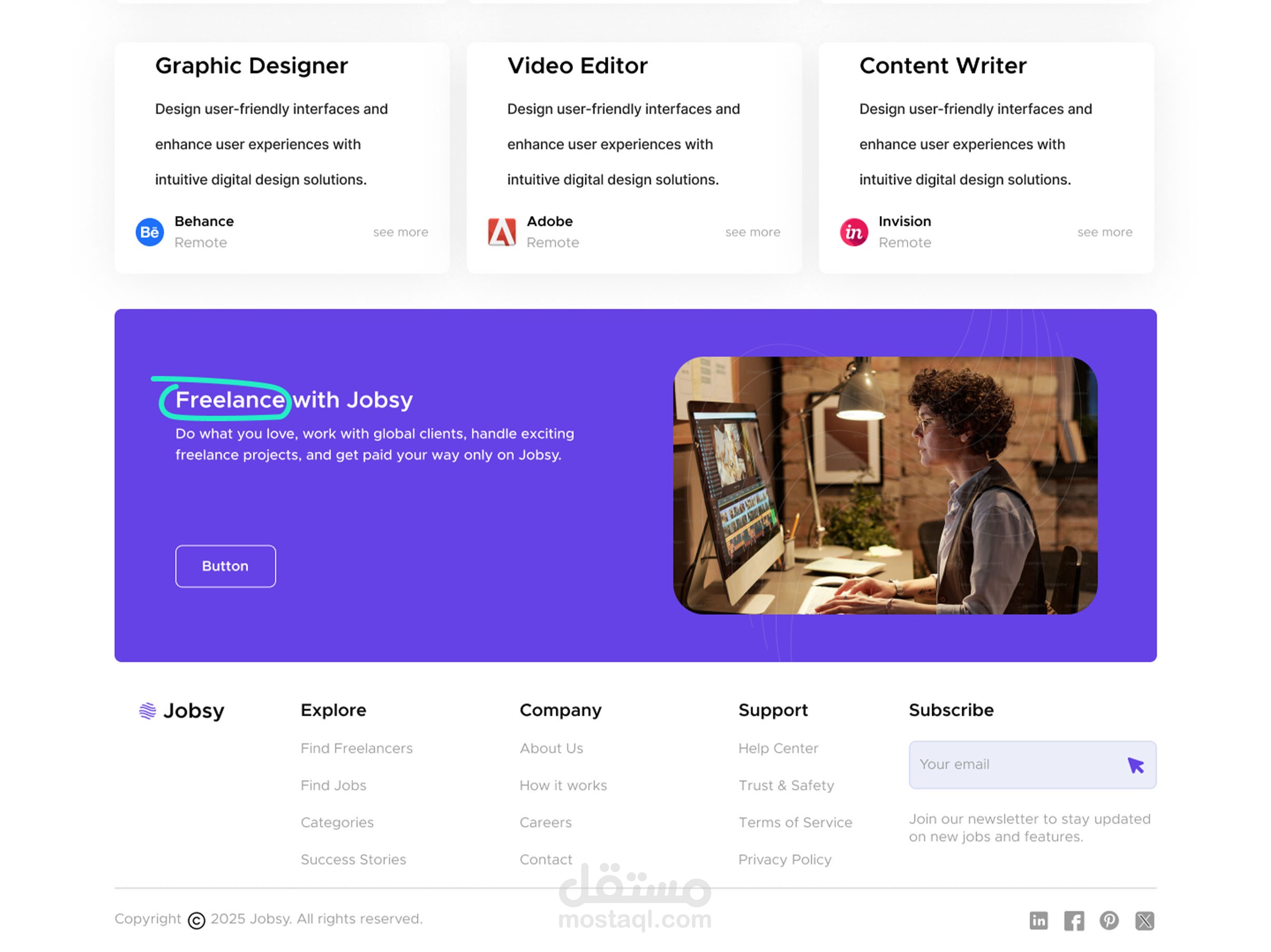 مشروع تصميم واجهات وتجربة مستخدم (UI/UX) لمنصة عمل حر تُعرف باسم Jobsy، تهدف إلى ربط المستقلين بالعملاء بطريقة سهلة وعصرية.