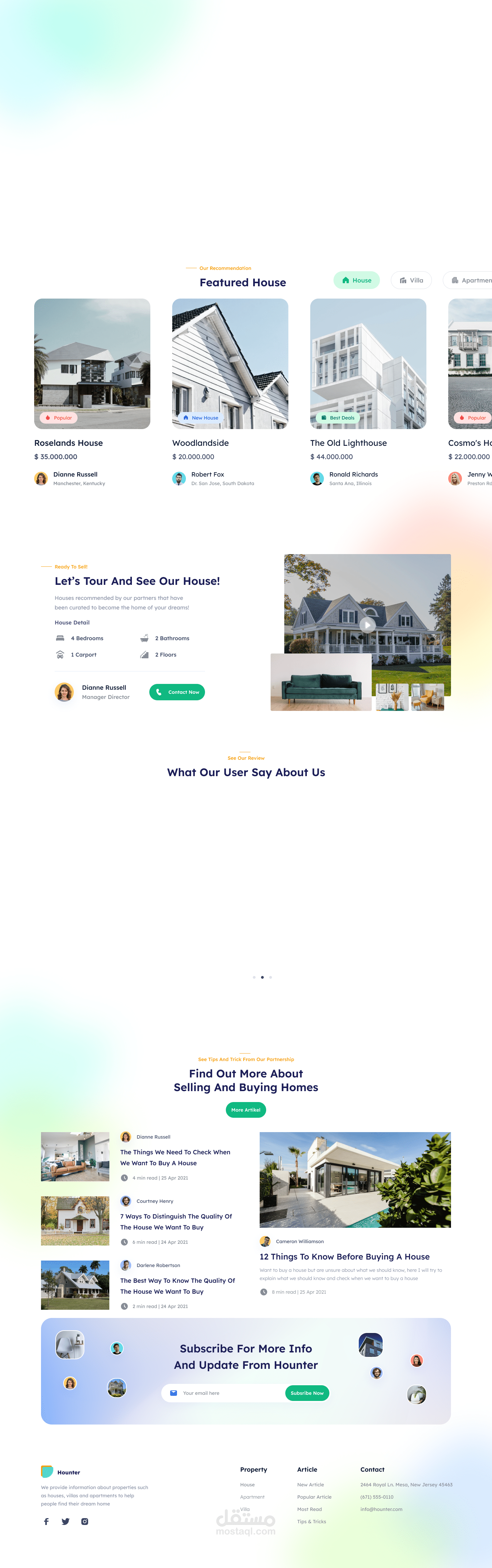 يشمل التصميم الصفحة الرئيسية التي تحتوي على خاصية البحث عن المواقع والعقارات، بالإضافة إلى عرض العقارات المميزة والمقالات والنصائح الخاصة بشراء المنازل. كما تم التركيز على إبراز الثقة والمصداقية من خلال عرض الشركاء والعملاء والمراجعات بشكل واضح ومنسق.