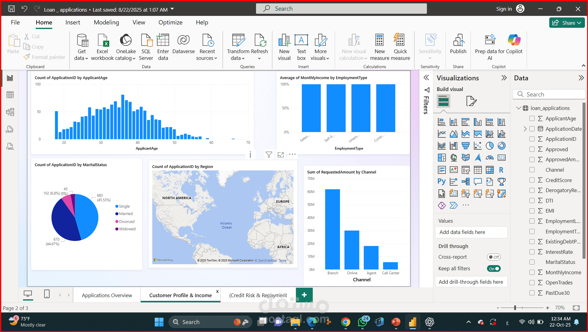 عملت داشبورد تفاعلية في Power BI مكوّنة من 3 صفحات تحليلية، الهدف منها إنها تقدم رؤية شاملة وواضحة لكل مراحل عملية الإقراض.