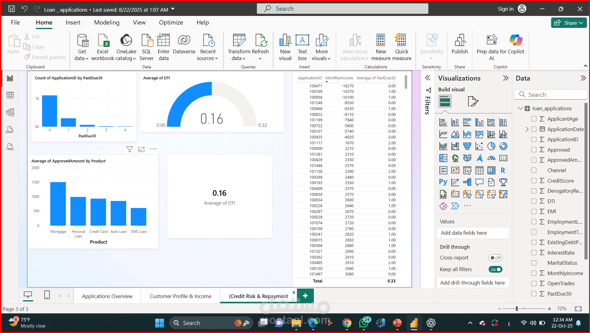 فيها مؤشرات مهمة زي متوسط نسبة الدين للدخل (DTI) اللي وصلت لـ0.16، وكمان متابعة تاريخ التأخير في السداد.