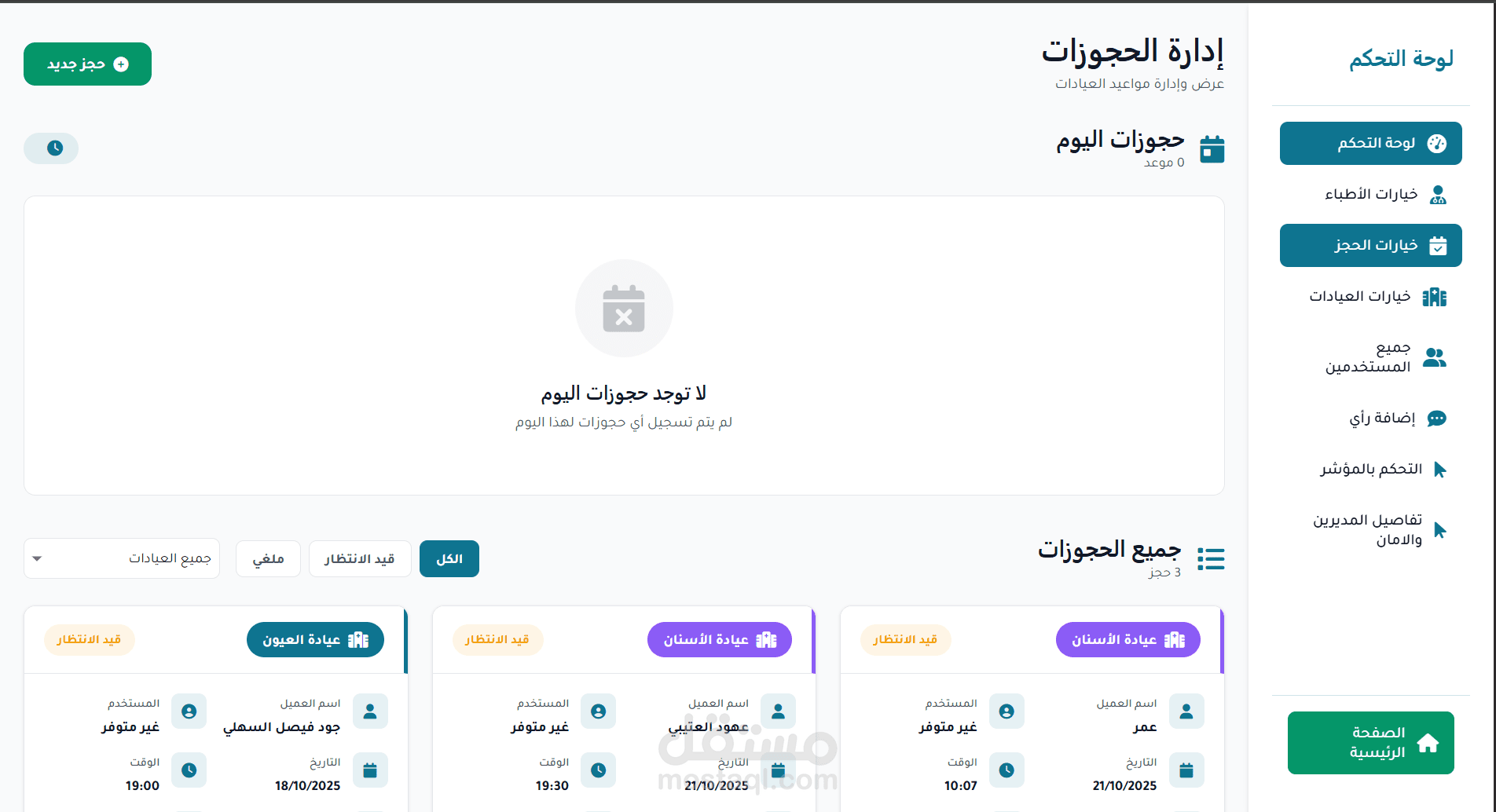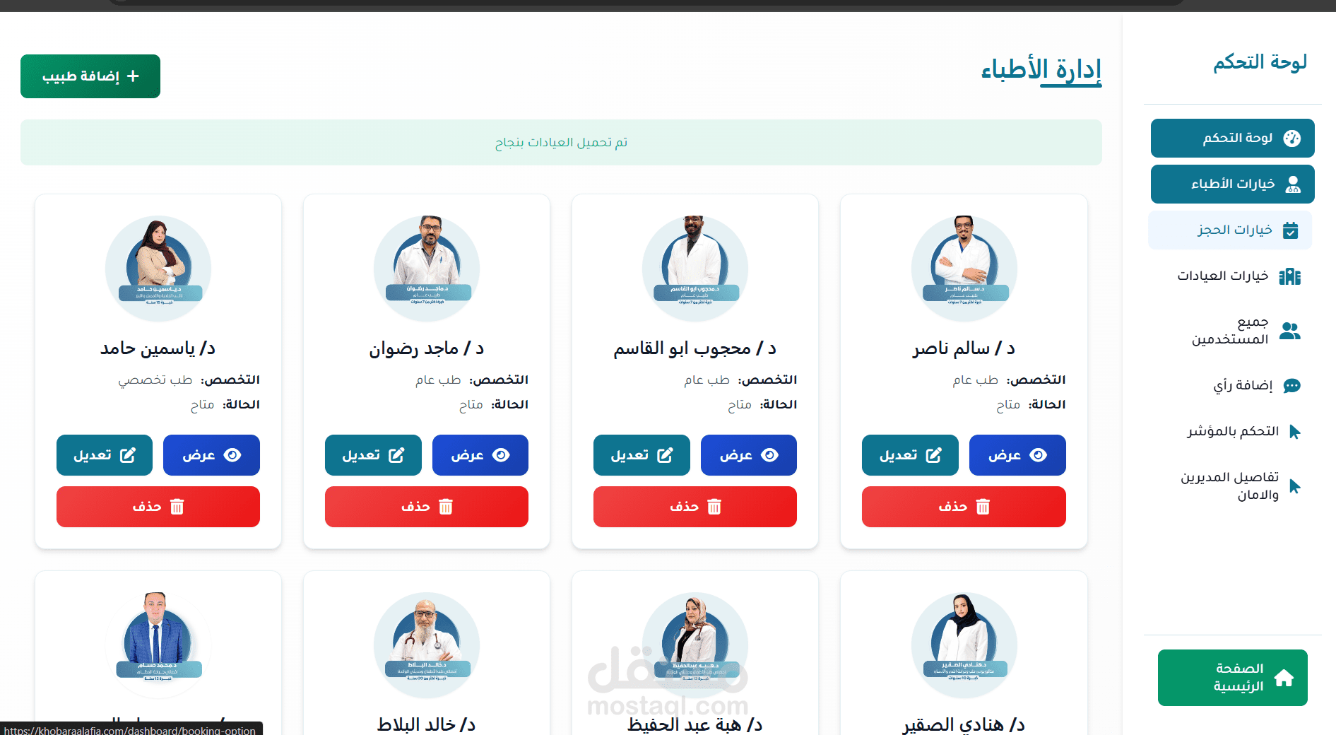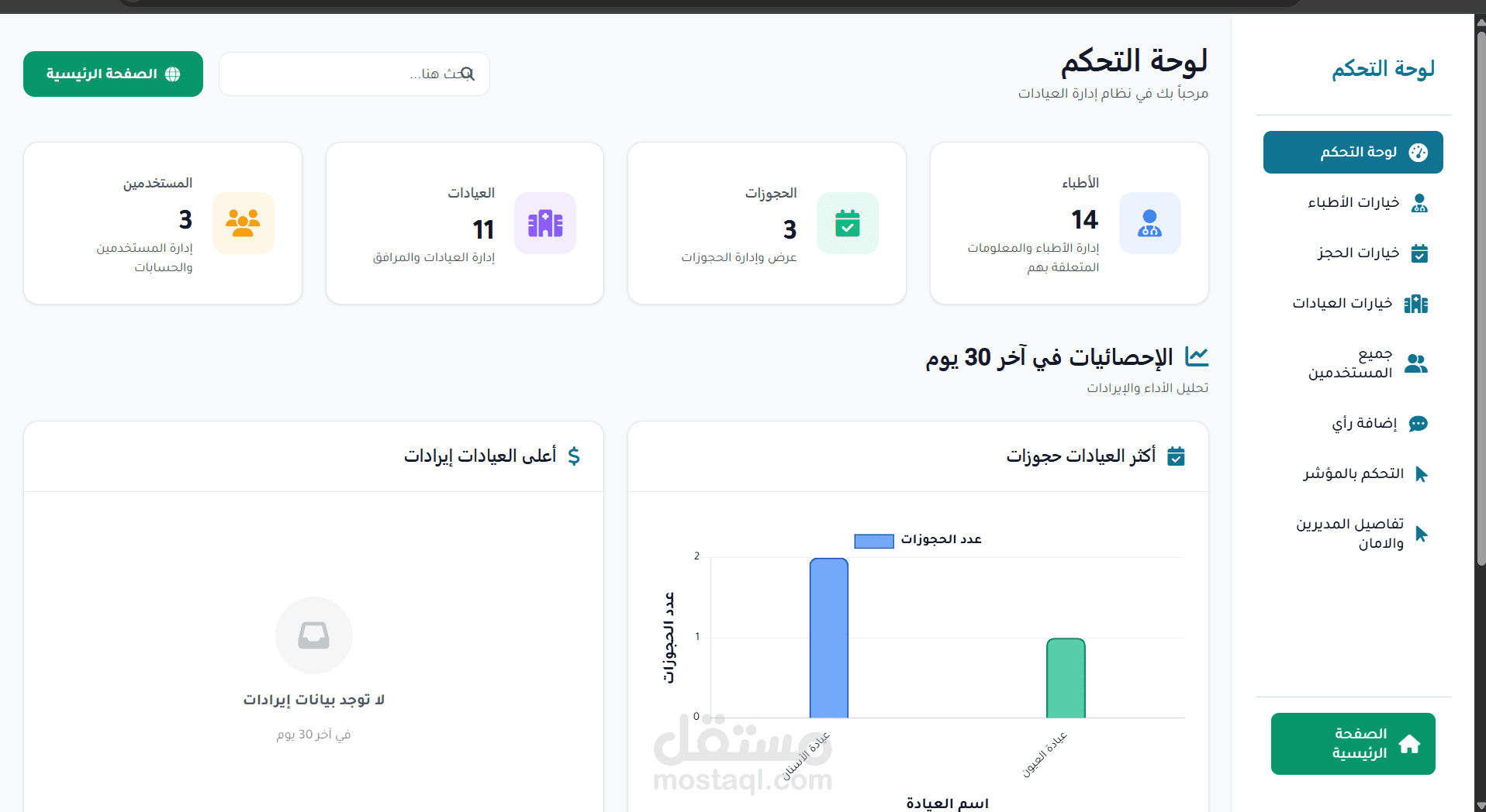 كما يتضمن الموقع لوحة تحكم شاملة لإدارة المحتوى مثل الصور والنصوص، بالإضافة إلى تحليلات دقيقة للحجوزات خلال فترات زمنية مختلفة (مثل الأسبوع أو الشهر الماضي) لمتابعة الأداء وتحسين إدارة العيادات.