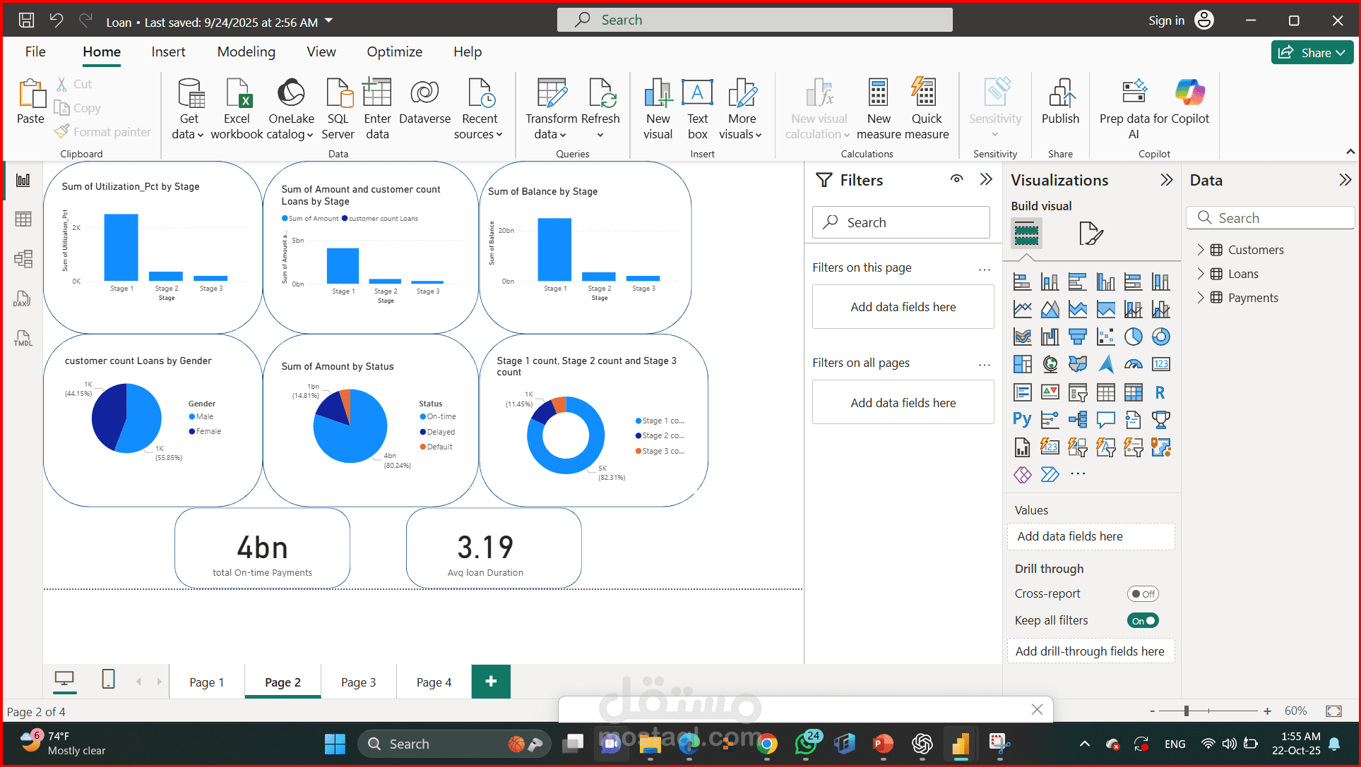 صمّمت داشبورد Power BI متكاملة بتشتغل كـ “مركز قيادة” لمتابعة محفظة القروض اللي قيمتها 30 مليار. الهدف منها إنها توضح الصورة بشكل ديناميكي وسهل الفهم لكل المستويات داخل المؤسسة.
