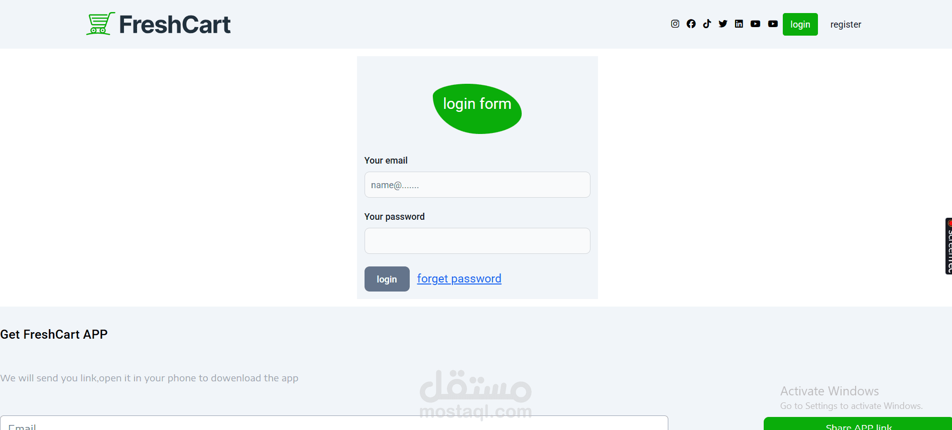 مشروع E-Commerce ماركت إلكتروني لبيع المنتجات الغذائية والسلع اليومية، يسمح للمستخدمين بتصفح المنتجات، إضافتها لعربة التسوق، وإتمام عملية الشراء بشكل سهل وسريع.