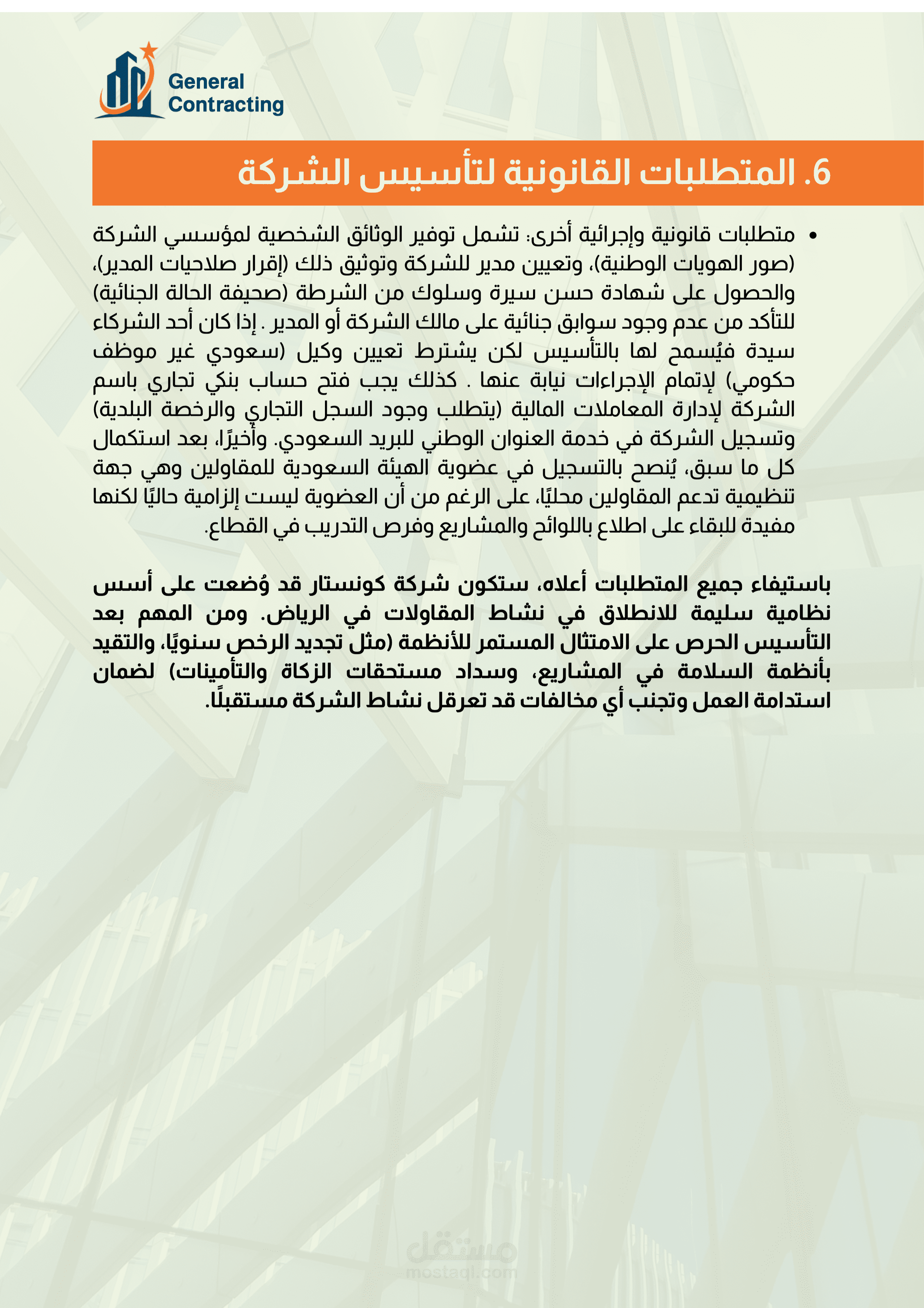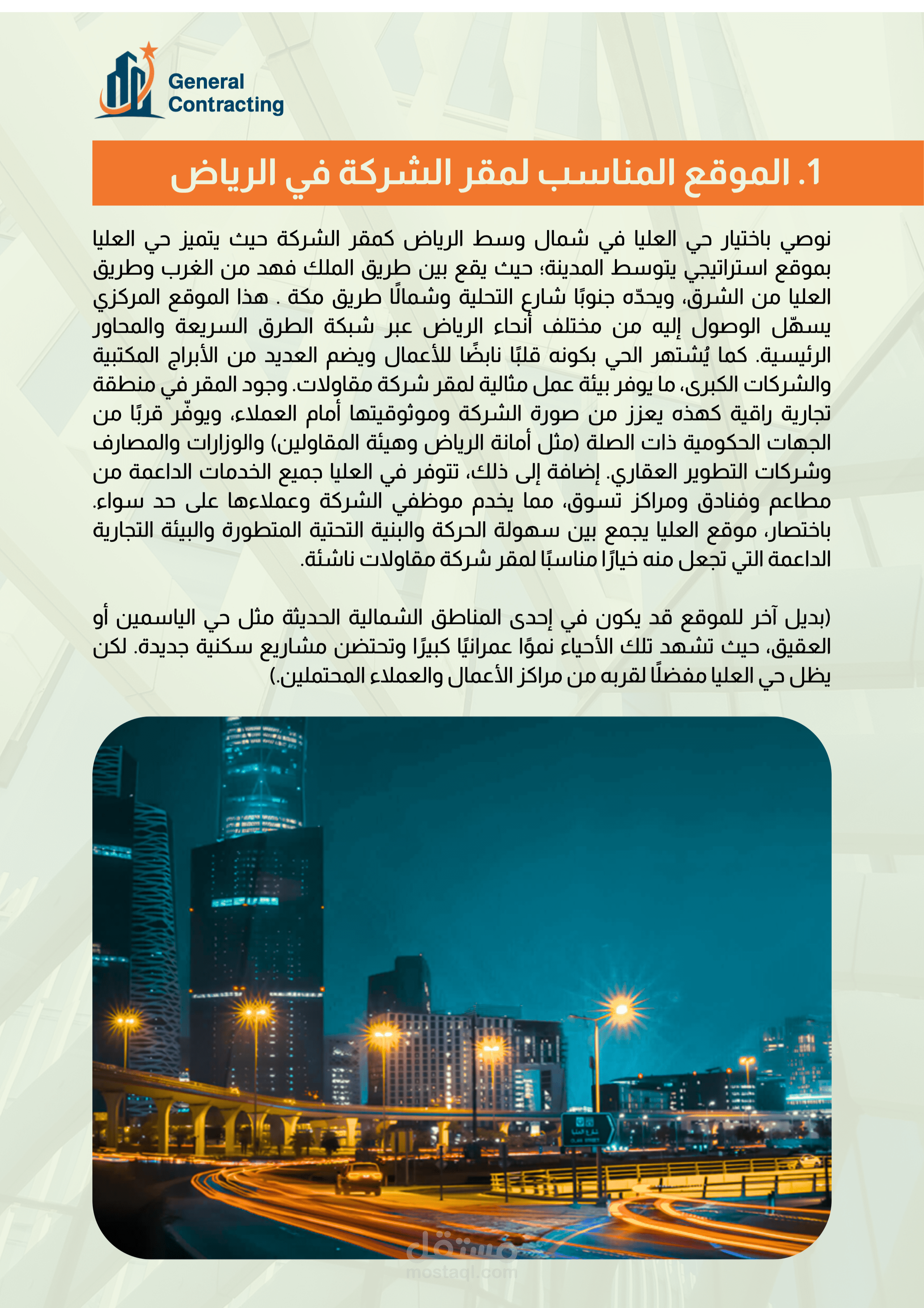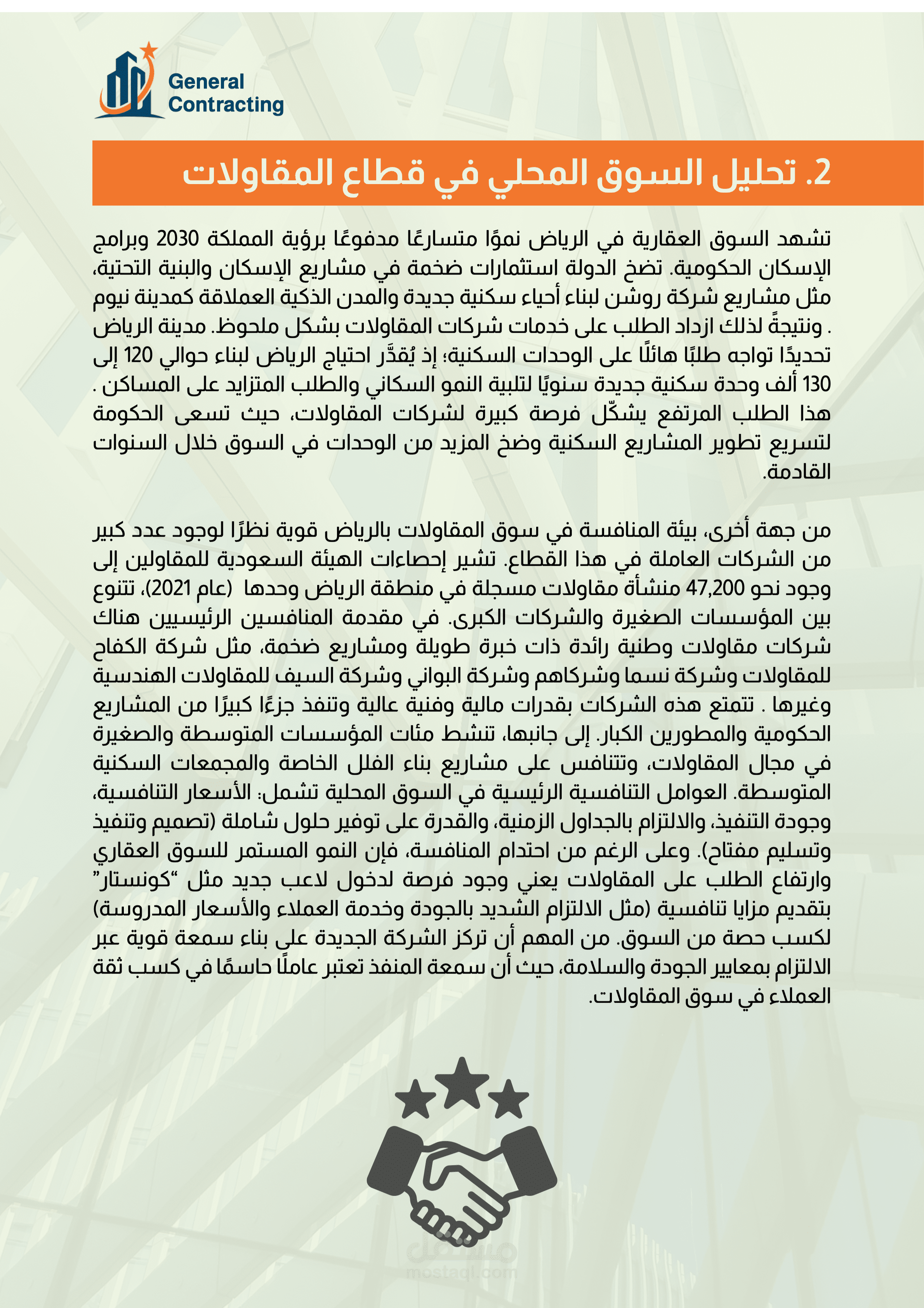 It presents a realistic vision for establishing a general contracting company in Riyadh, Saudi Arabia, supported by an in-depth study of the administrative, financial, legal, and operational aspects required to launch such a company successfully.