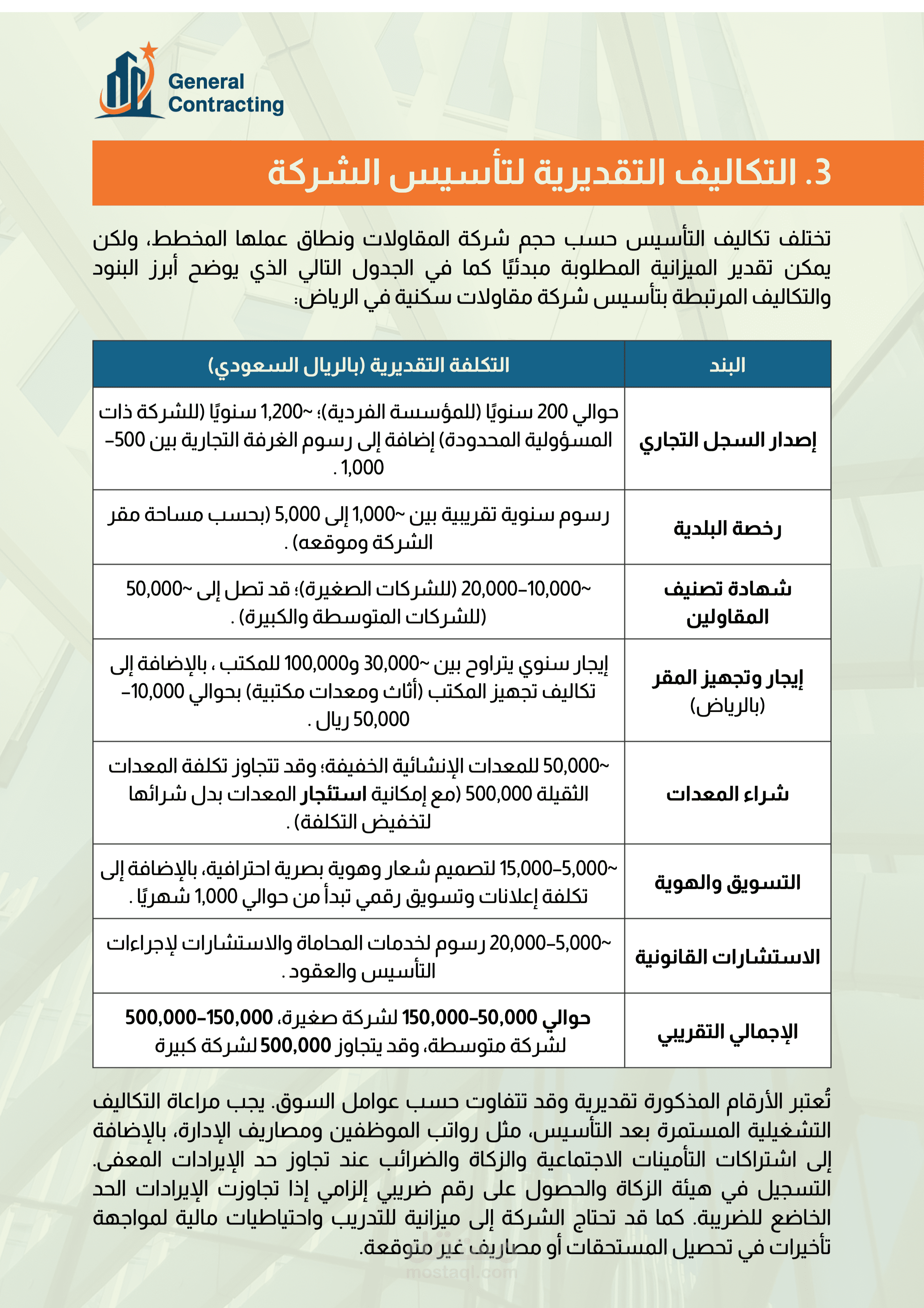 •جدول تفصيلي للتكاليف التقديرية لتأسيس وتشغيل شركة مقاولات متوسطة الحجم.