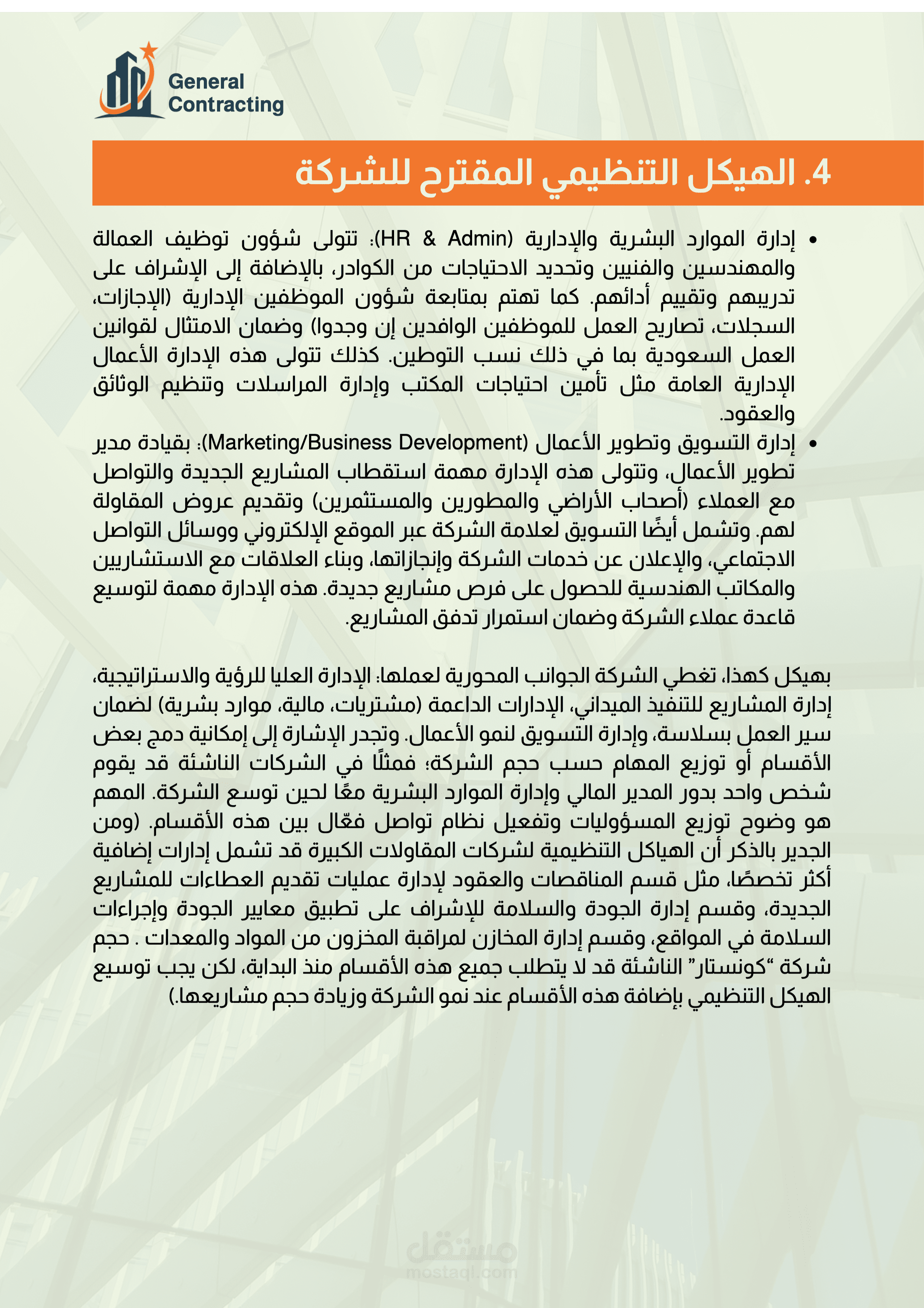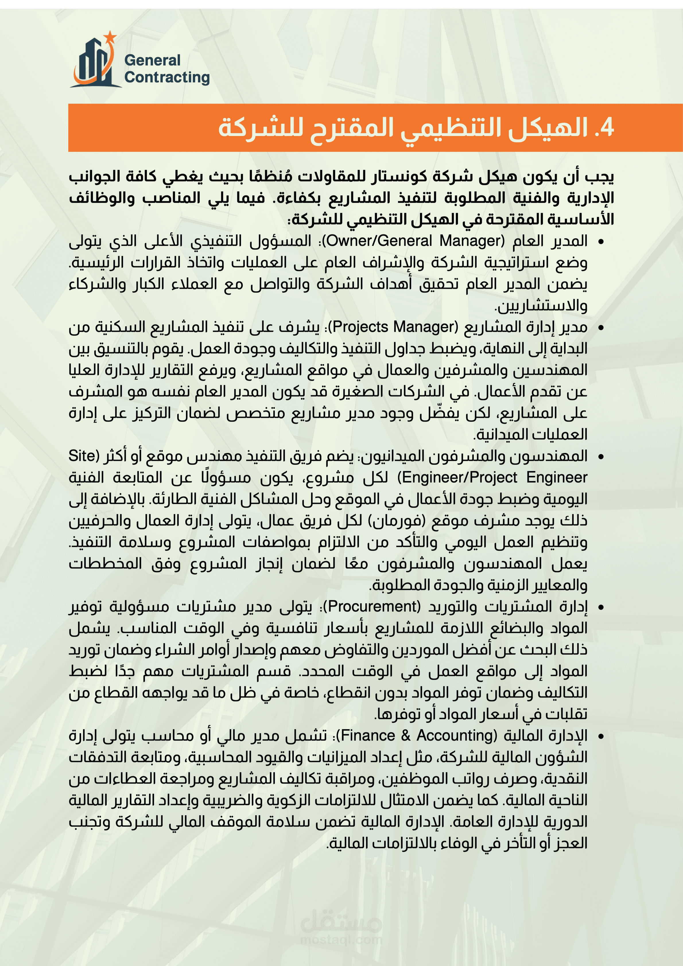 •هيكل تنظيمي احترافي يغطي جميع الإدارات الأساسية (المشاريع، المشتريات، المالية، الموارد البشرية، التسويق).