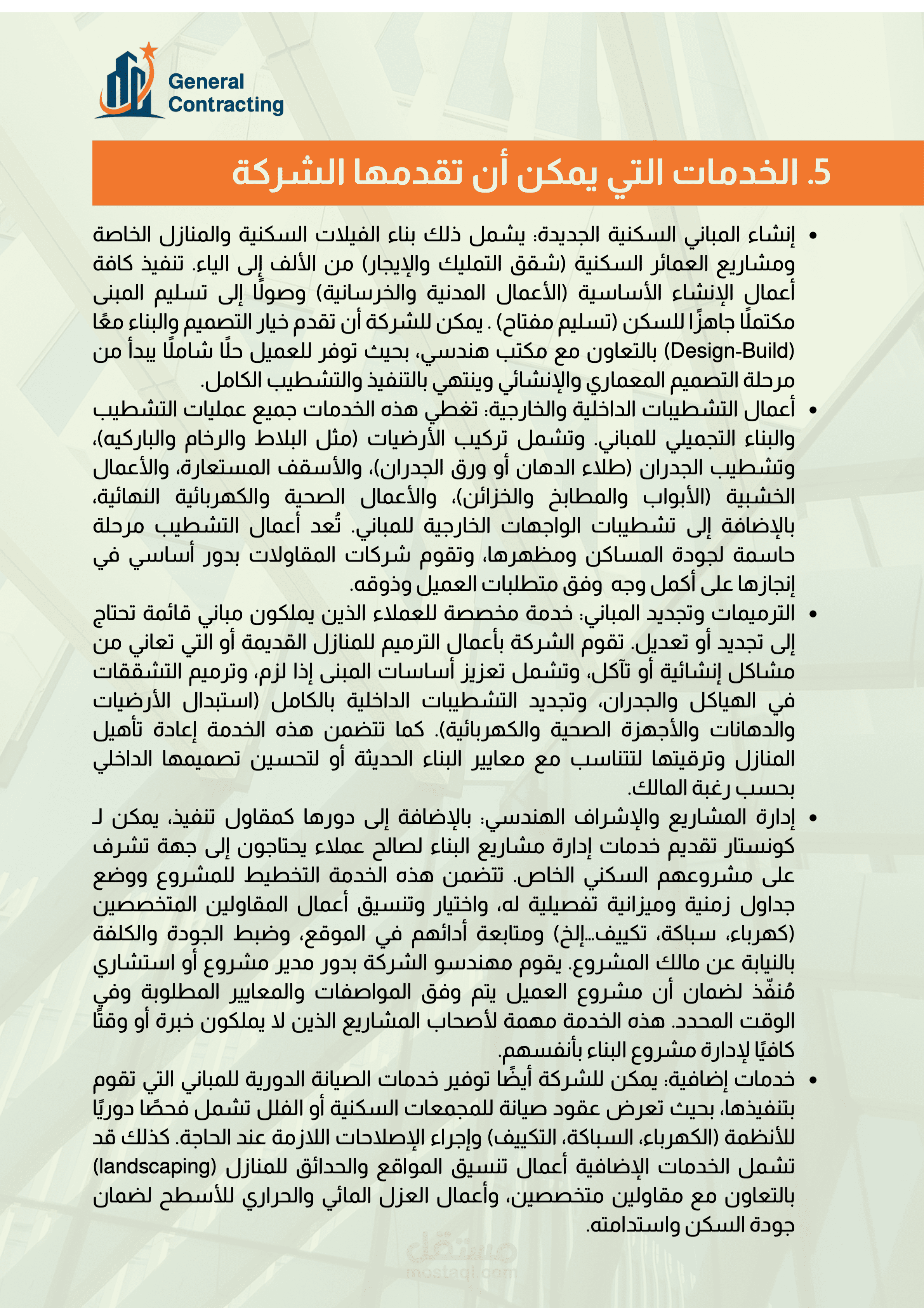 •عرض للخدمات التي يمكن أن تقدمها الشركة (الإنشاء، التشطيب، الترميم، الإدارة الهندسية، الصيانة).