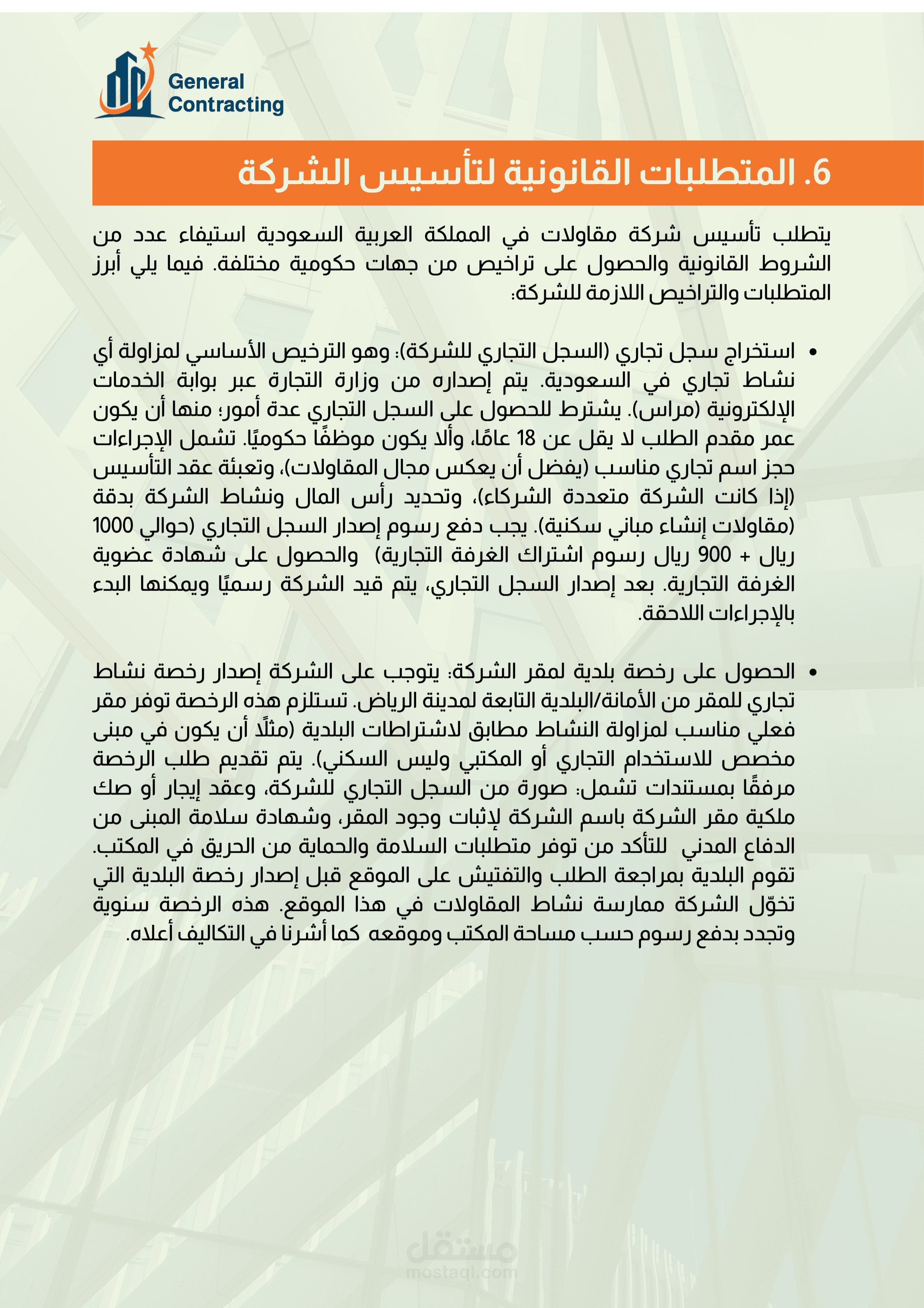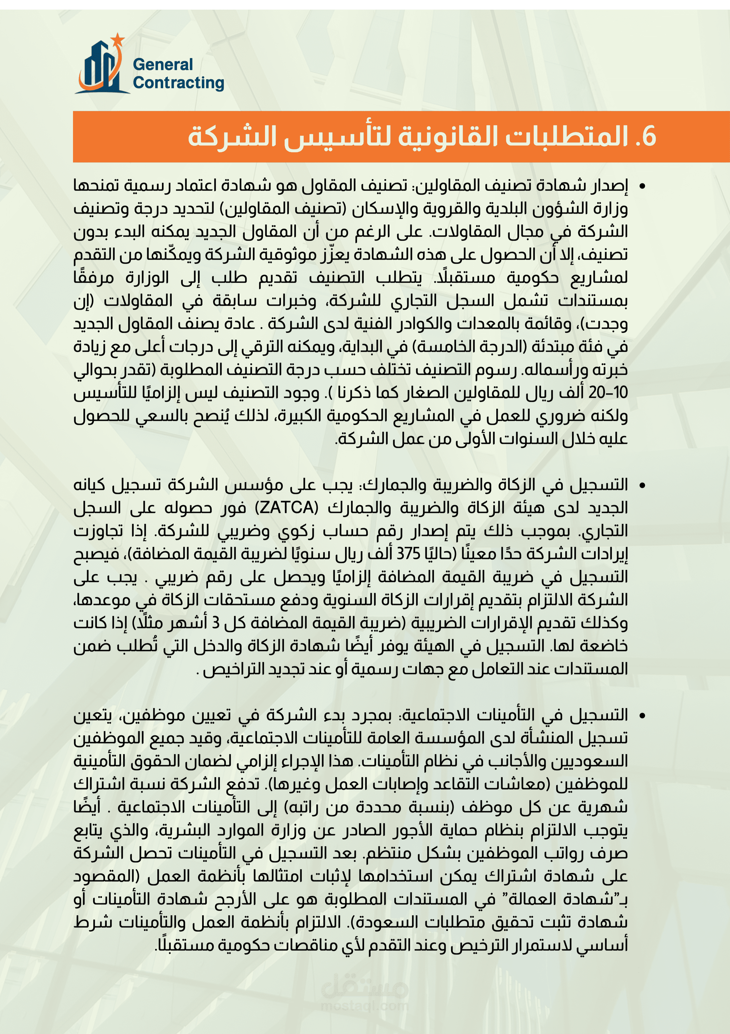 •توضيح كامل للإجراءات القانونية المطلوبة للحصول على السجل التجاري، رخصة البلدية، وشهادة تصنيف المقاولين.