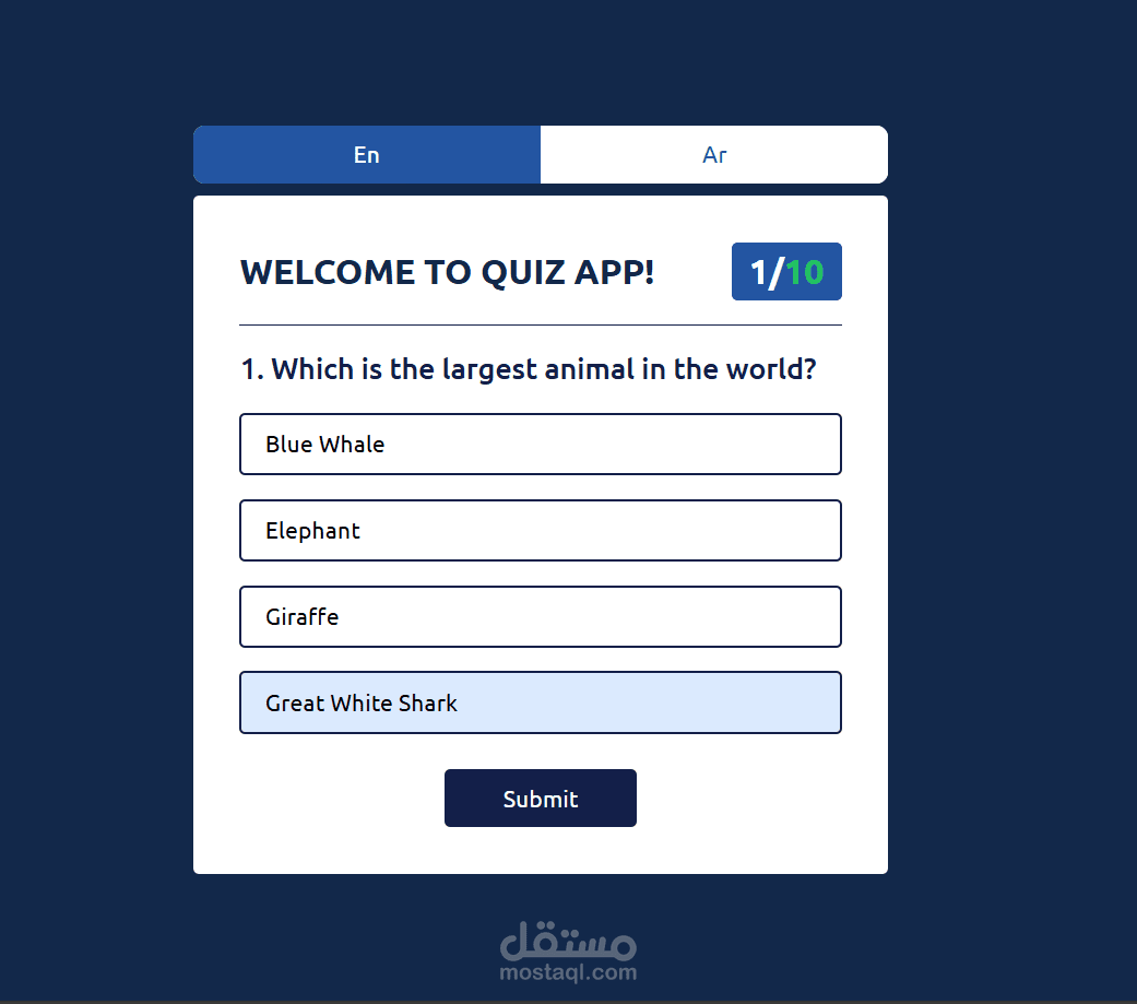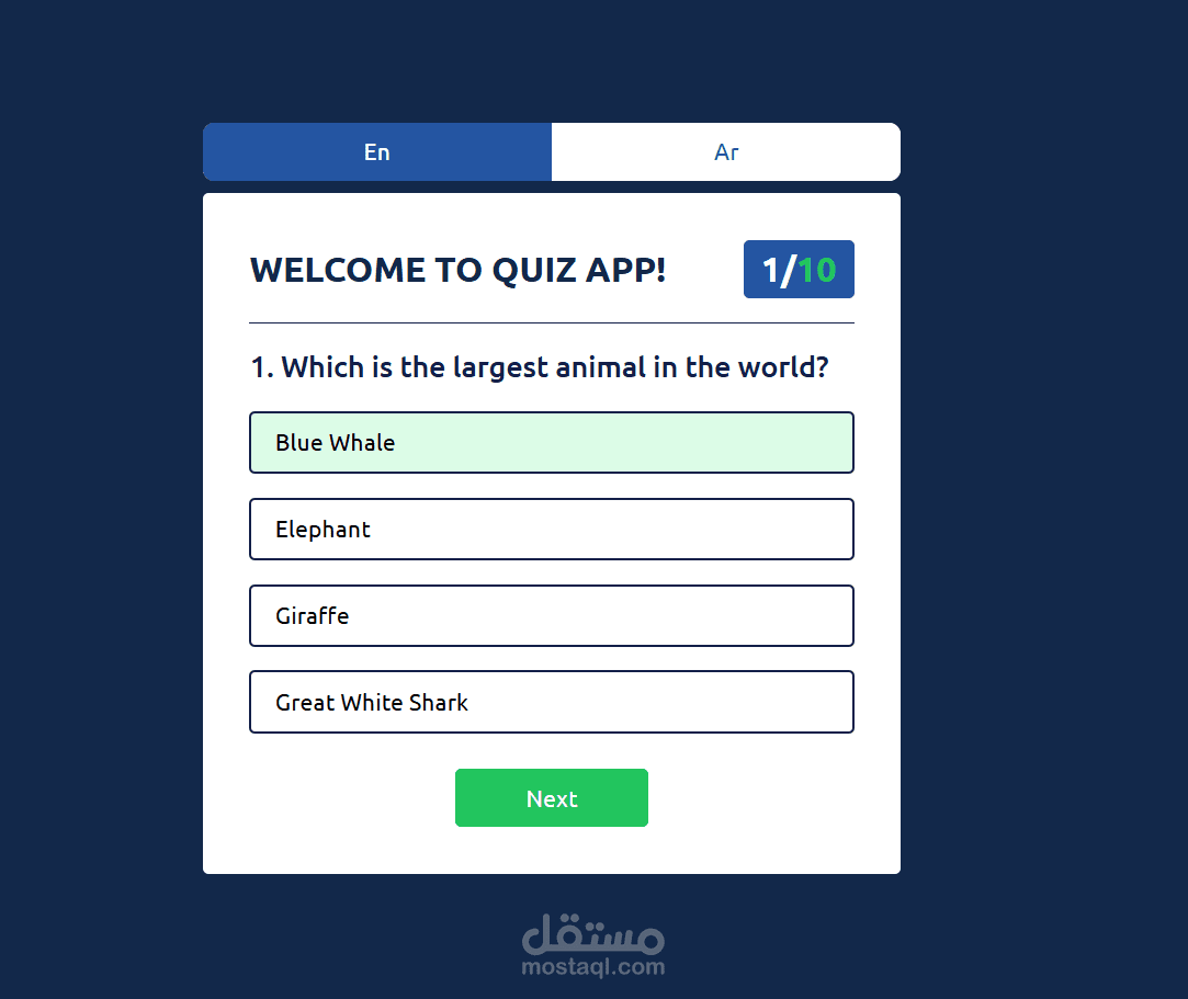 مشروع Quiz App هو تطبيق بسيط لتقديم اختبارات تفاعلية يعمل بالكامل على جانب المتصفح، ويعتمد على HTML وTailwind CSS وJavaScript Vanilla. يوفّر للمستخدم تجربة أسئلة اختيار من متعدد يتم جلبها مباشرة من واجهة برمجة تطبيقات خارجية خاصة بالأسئلة العامة. يمكن للمستخدم اختيار الإجابة الصحيحة، ومعرفة النتيجة فورًا عبر تمييز الإجابة باللون الأخضر أو الأحمر، ثم الانتقال إلى السؤال التالي بضغطة زر.