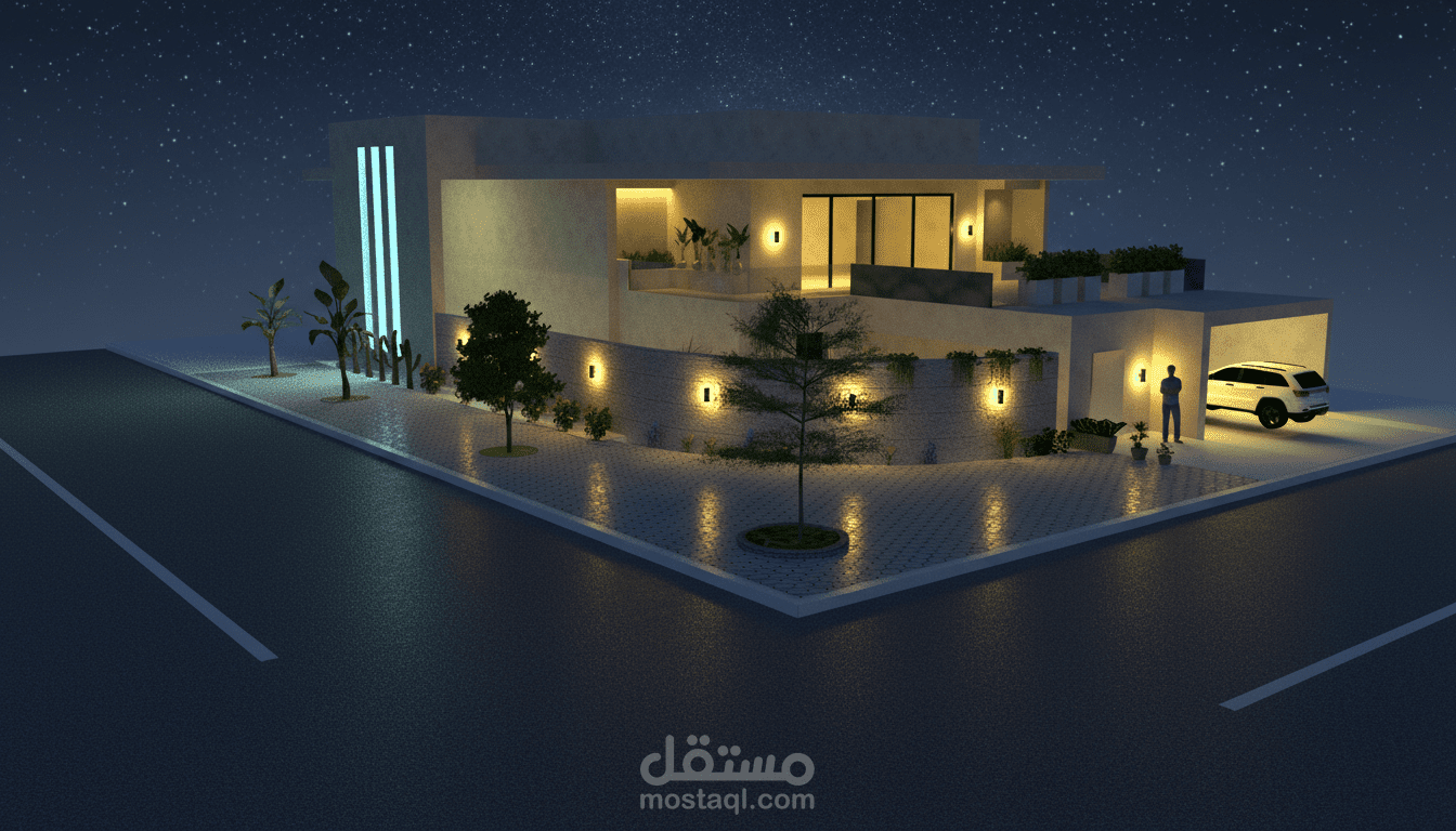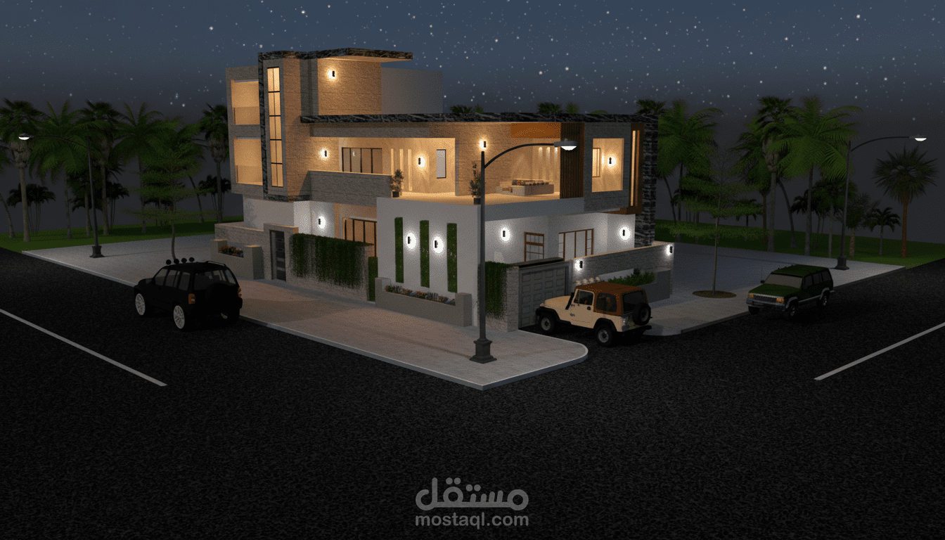 هذا العمل ثلاثي الأبعاد يقدم تصميماً لحمام عصري وواسع يجمع بين الخامات الحديثة واللمسات العضوية الدافئة.