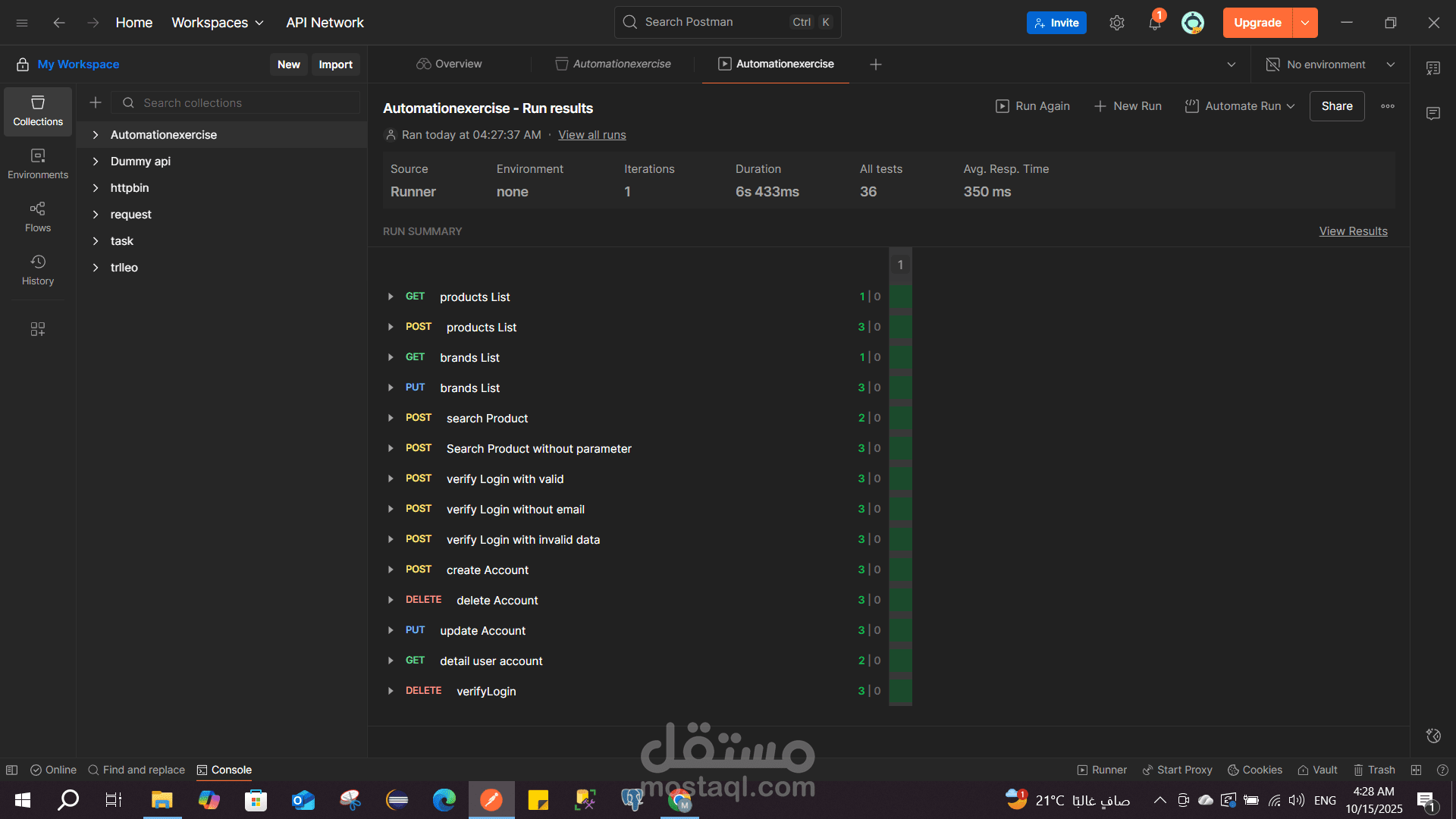 This project uses the publicly-available APIs from Automation Exercise for practicing API testing. The collection includes requests such as getting product lists, searching products, user registration/login, and user account operations.