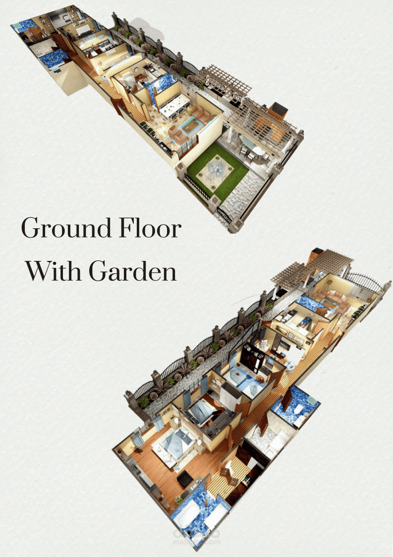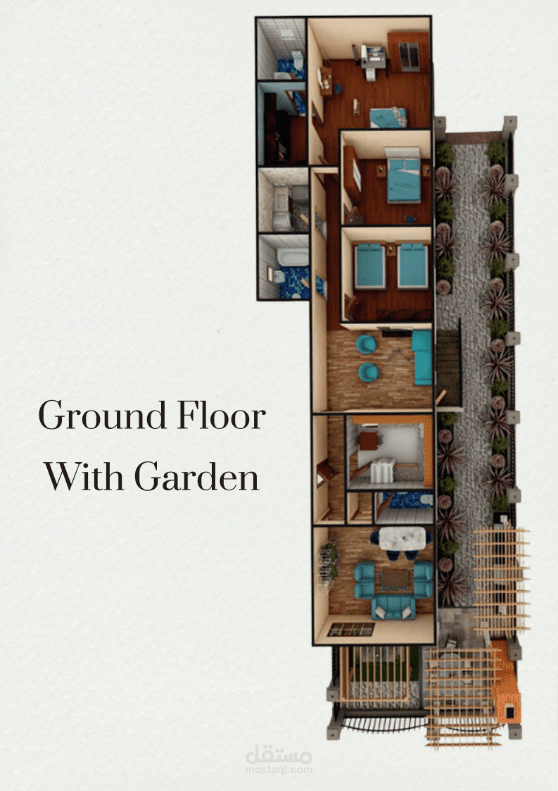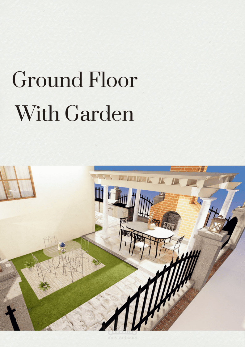 detailed 3D architectural visualization for a Ground Floor Unit with a Private Garden. The design includes functional zoning that separates private and public areas, featuring an open living and dining space connected directly to the garden through a shaded outdoor terrace. The visualization highlights natural light flow, landscape integration, and material harmony to create a comfortable and aesthetic living environment. The model was developed using Revit, SketchUp, and rendered in Lumion to achieve realistic presentation quality.