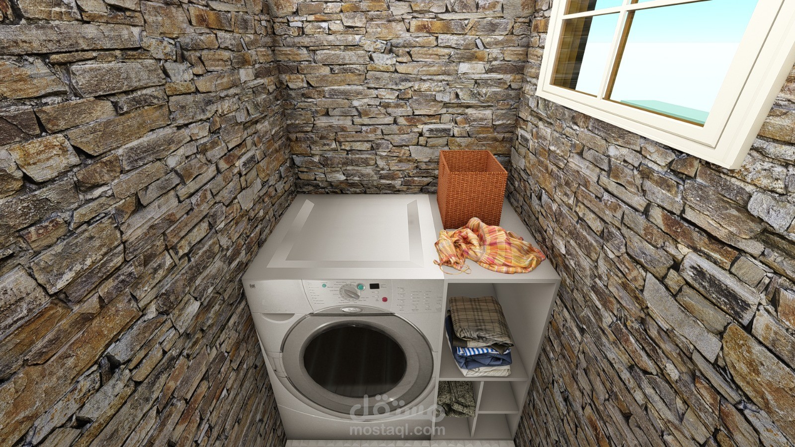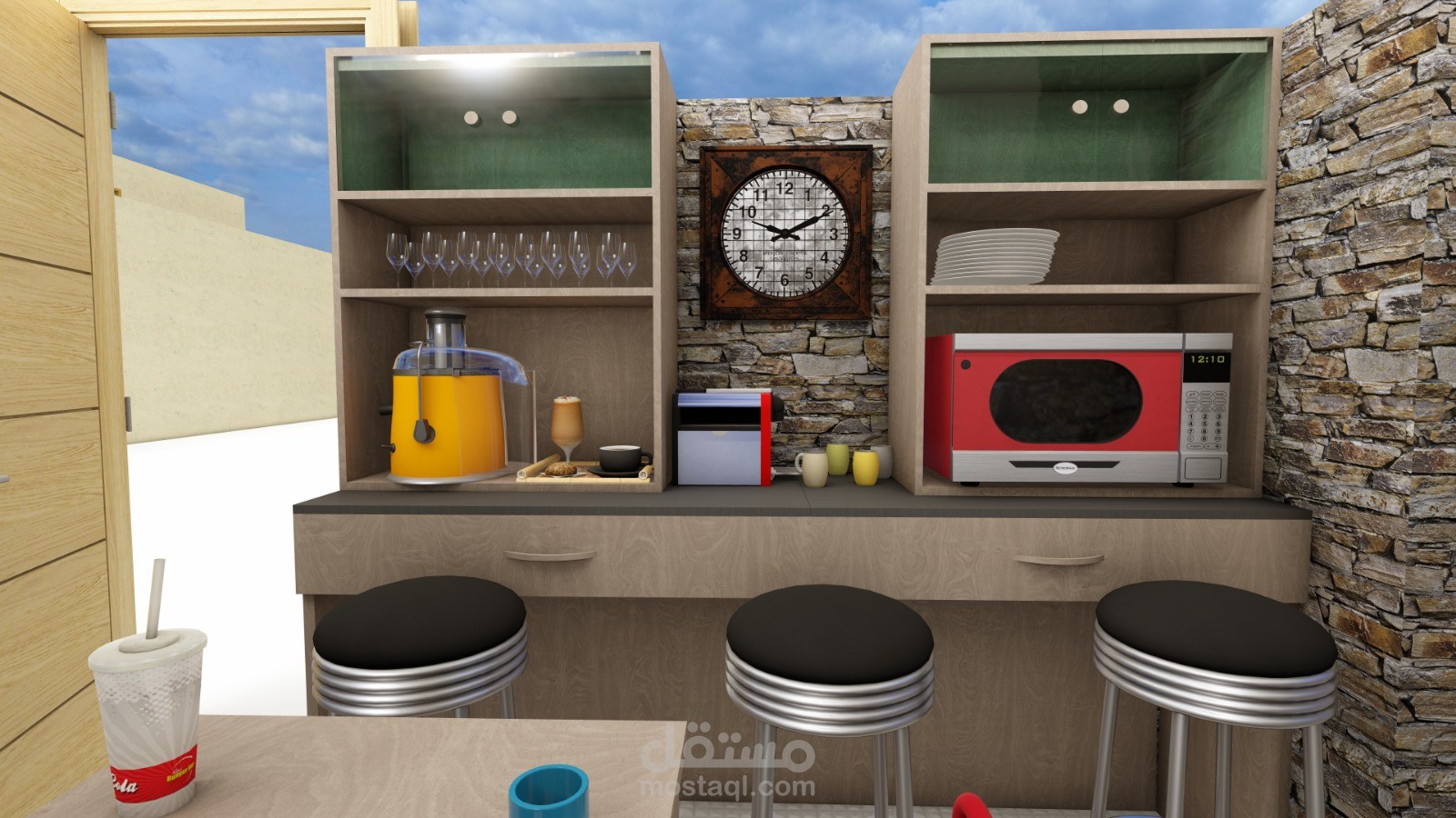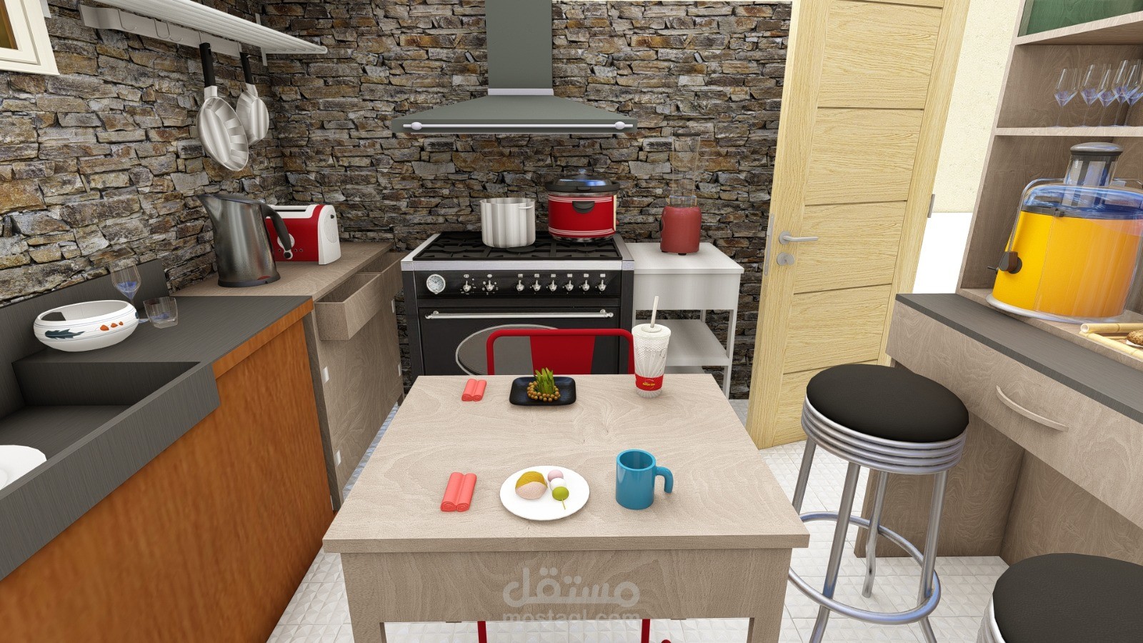an interior design for a modern kitchen that blends warmth and elegance through the use of soft lighting and a balanced color palette. The design focuses on creating a cozy and relaxing atmosphere, using warm tones and indirect lighting to enhance comfort. Functional furniture layout ensures efficient space utilization, while decorative elements and indoor plants add a touch of natural harmony. The design was modeled and rendered using Revit and Lumion to achieve a realistic visual presentation.