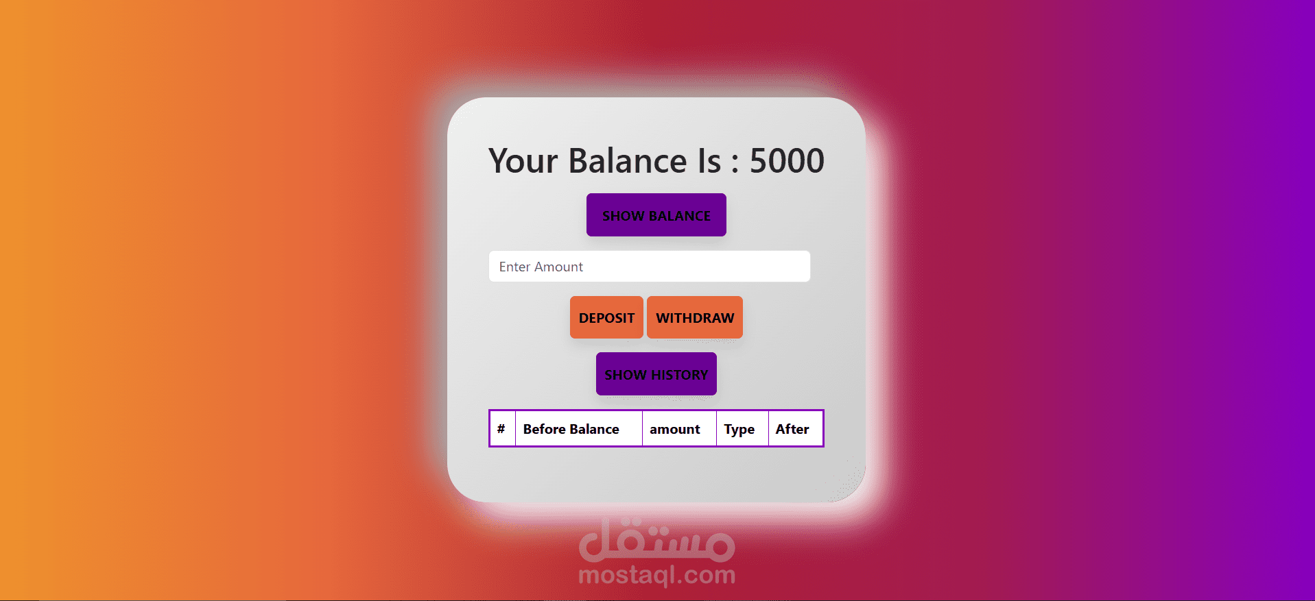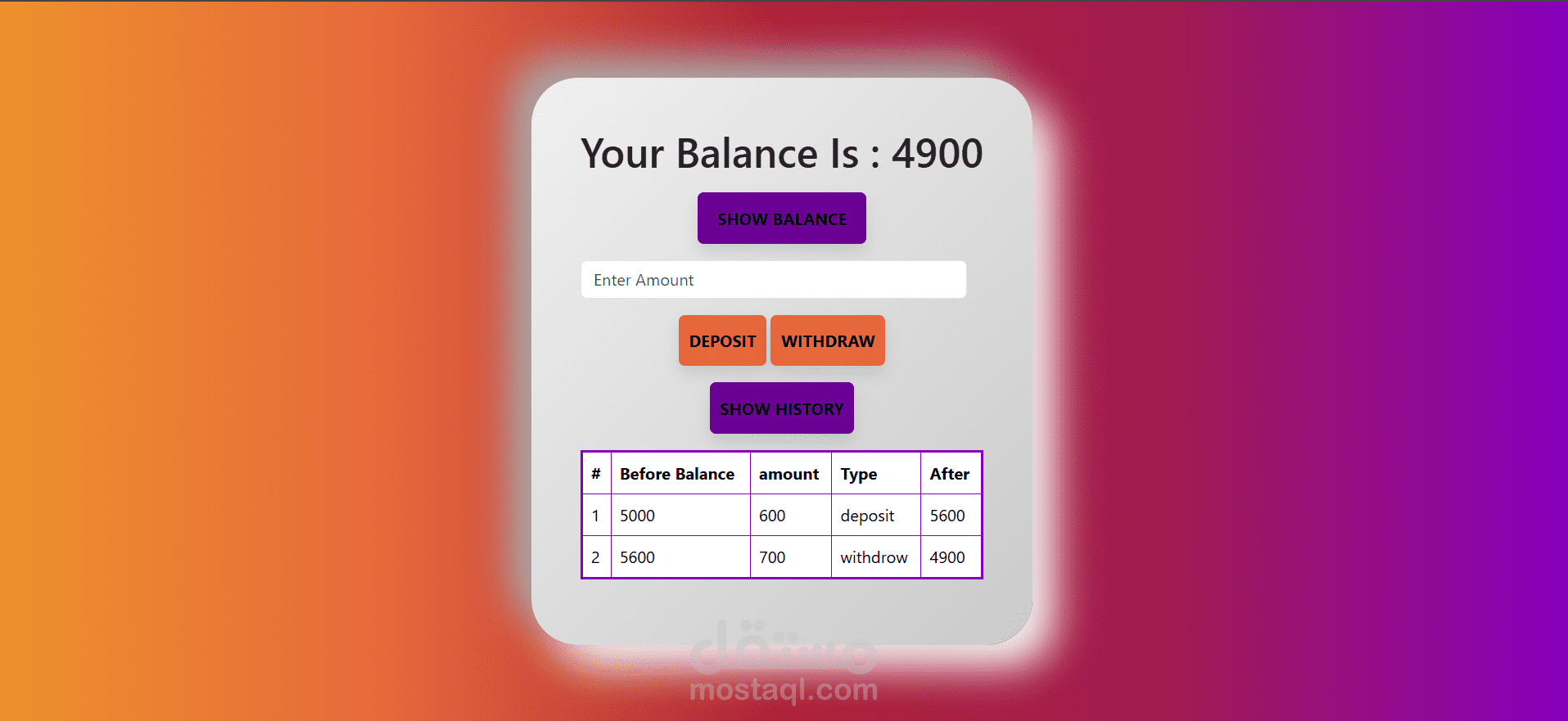 تطبيق بسيط مستوحى من فكرة InstaPay، يوضّح محاكاة لحساب مستخدم يحتوي على رصيد 5000 جنيه، مع إمكانية السحب أو الإيداع.