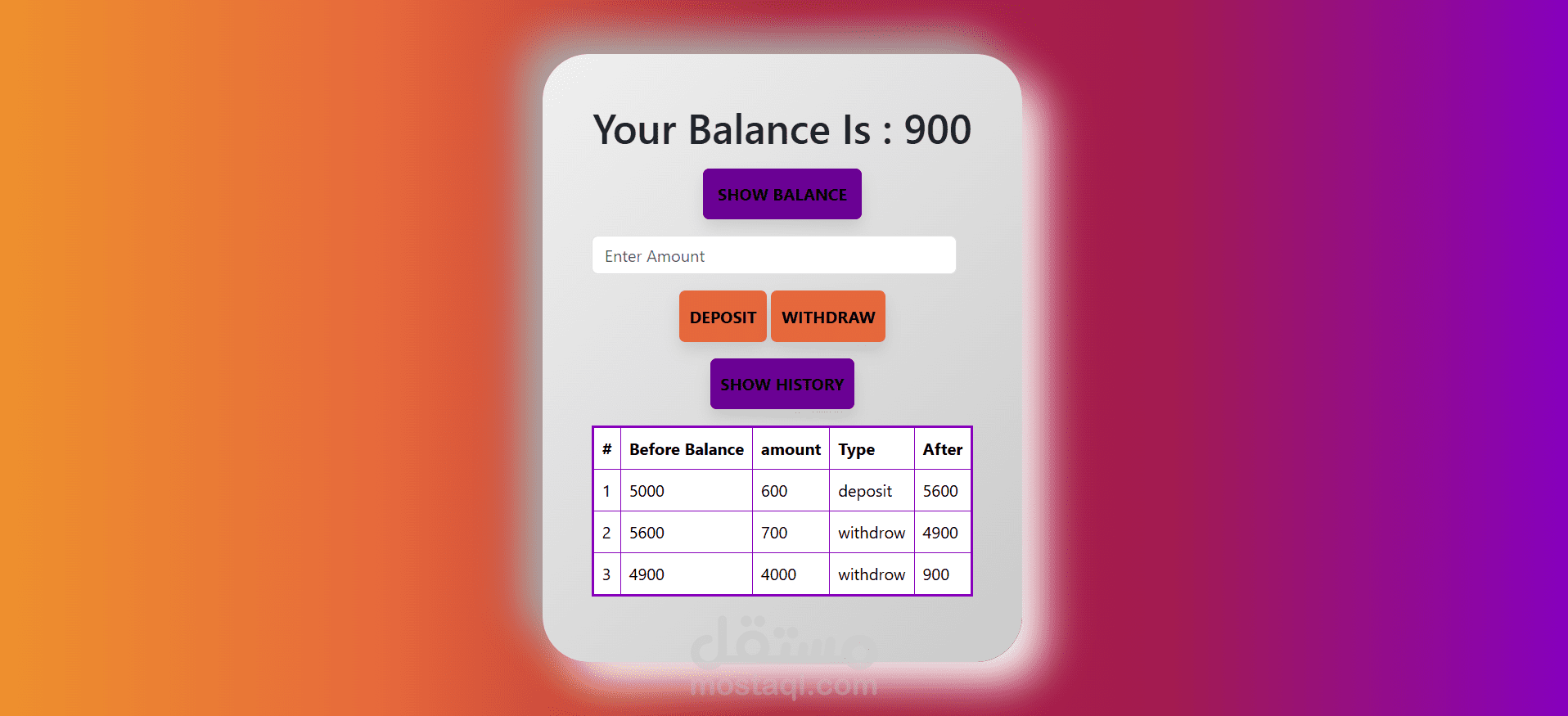 يتيح التطبيق للمستخدم متابعة رصيده الحالي ورؤية تاريخ المعاملات بطريقة مرتبة وسهلة الاستخدام.