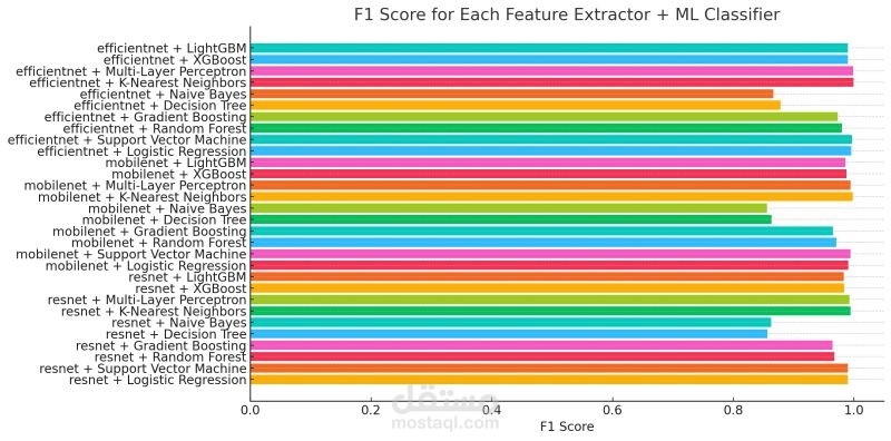 Training 10 machine learning algorithms on the extracted features, including SVM, Random Forest, XGBoost, and LightGBM.