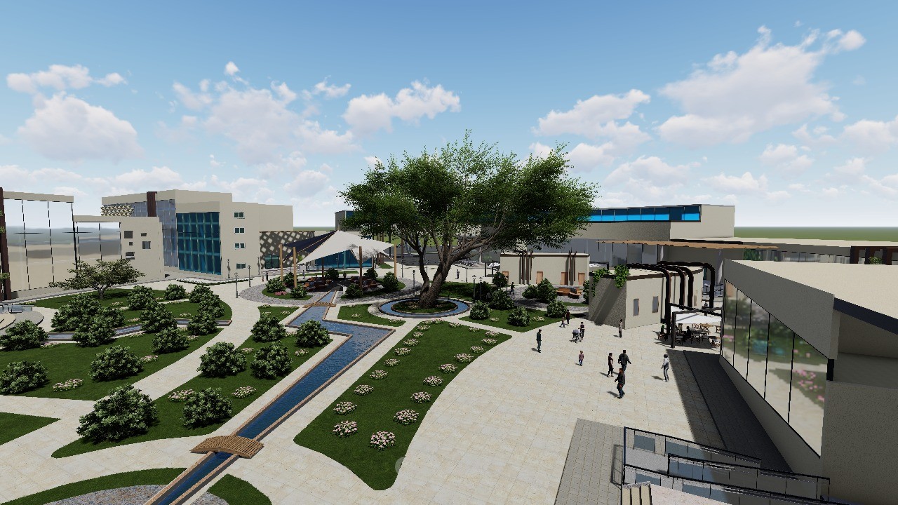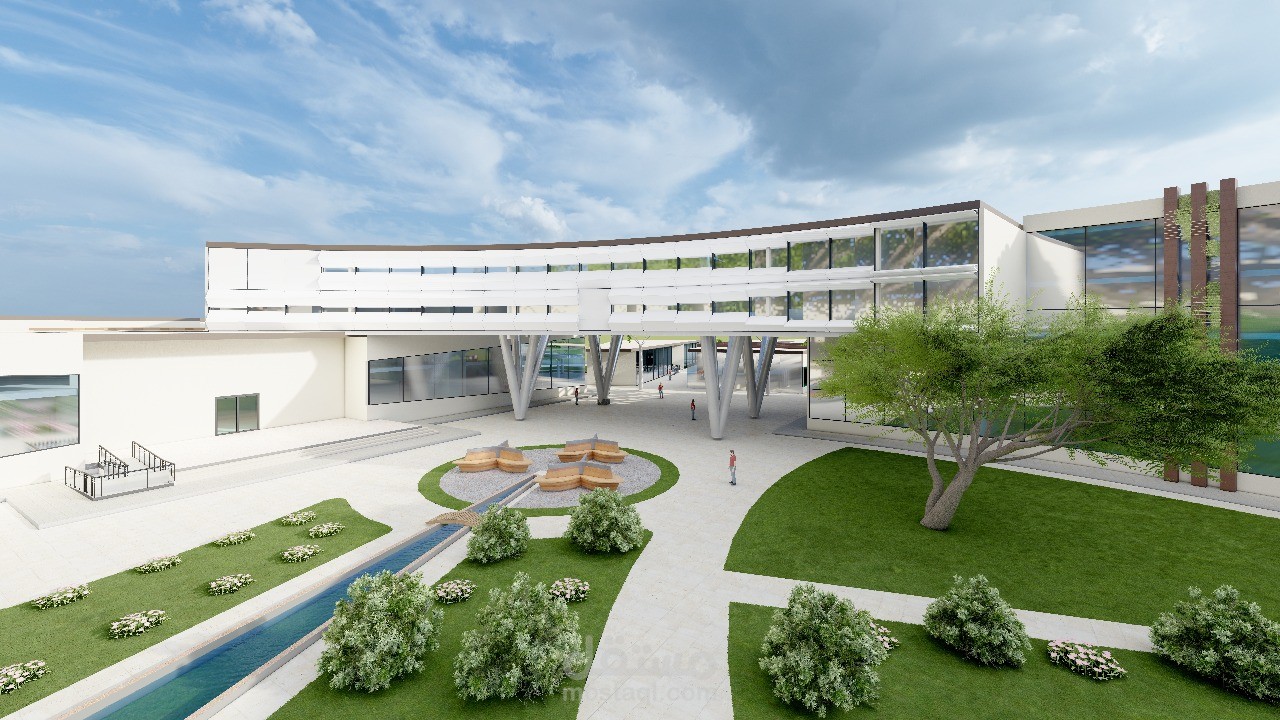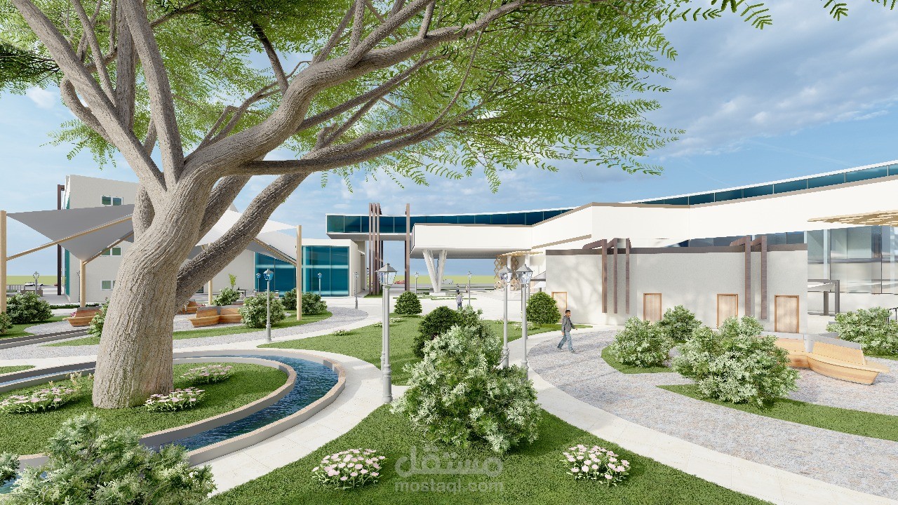 This project visualizes a modern architectural complex designed using Revit and rendered in Lumion. The design focuses on openness, light, and visual connection with the surrounding landscape. The curved building form embraces a central courtyard with green spaces, water features, and seating areas that encourage interaction and relaxation. Structural elements are highlighted through exposed supports, while the glass façades enhance natural lighting and transparency, creating a bright and welcoming environment.