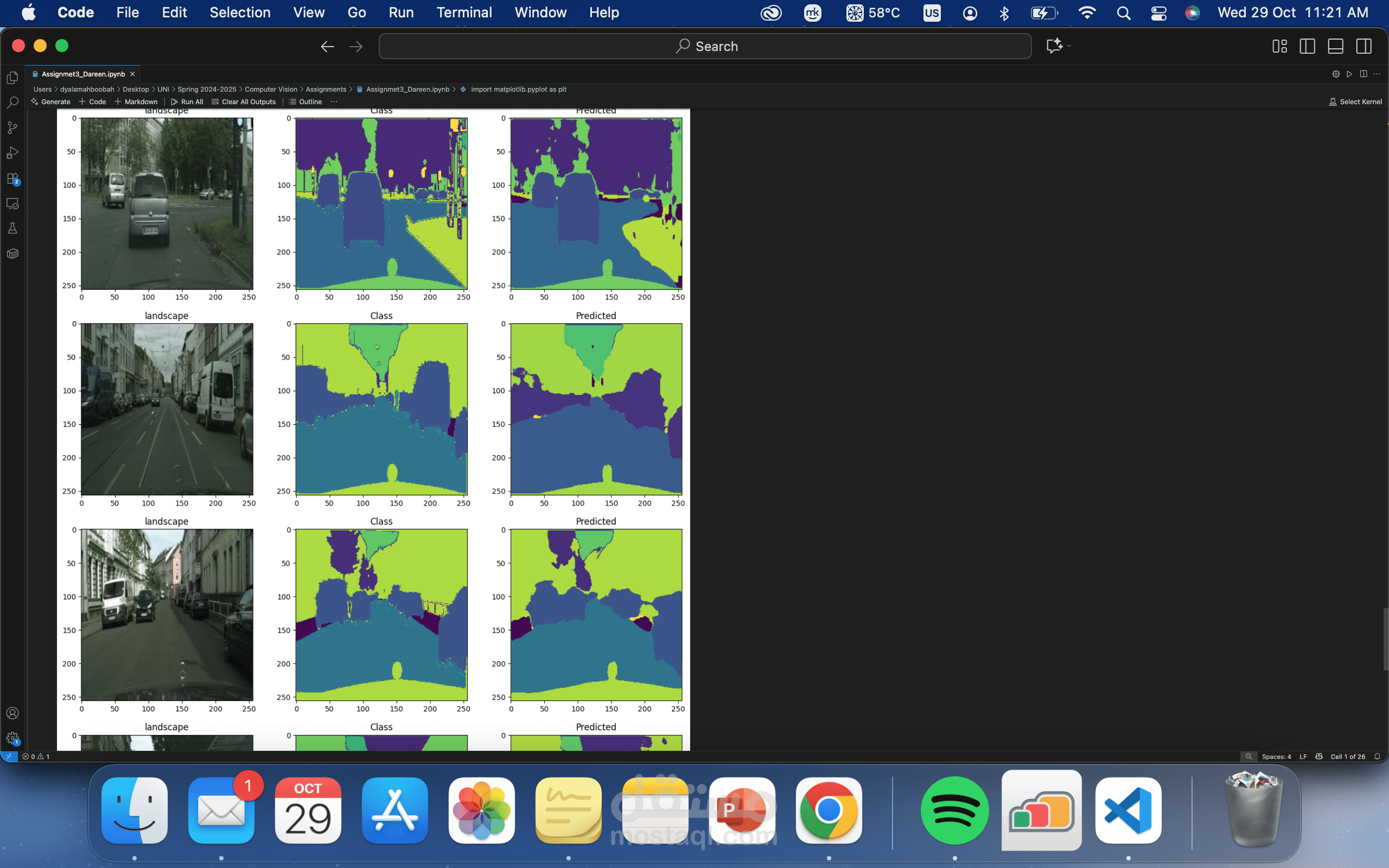 This project is a computer vision and deep learning assignment that uses the Cityscapes dataset, which contains urban scene images, to perform image segmentation or clustering. The code first imports essential libraries like PyTorch, NumPy, and Matplotlib for building and training neural networks, processing images, and visualizing results. It then extracts the dataset from a ZIP file and prepares it for use. The project likely involves creating a custom PyTorch dataset, applying image transformations, and using models or clustering techniques (like K-Means) to analyze or segment images into meaningful regions. Overall, the code aims to automate understanding of city scenes by grouping pixels or features that represent different objects such as roads, cars, or buildings.