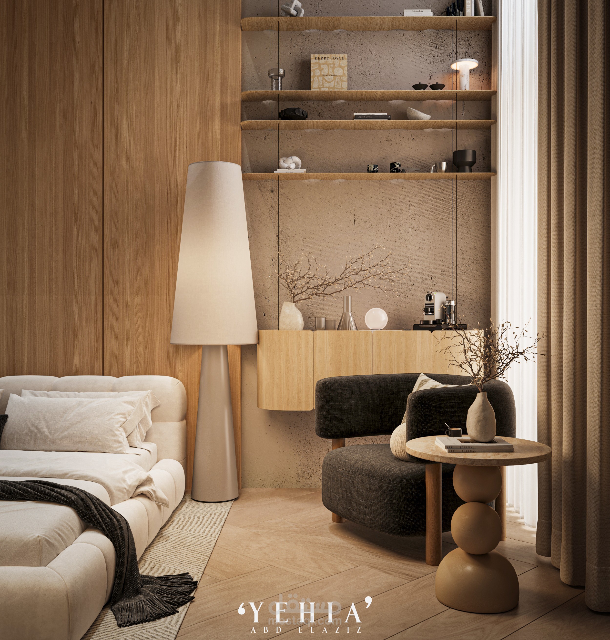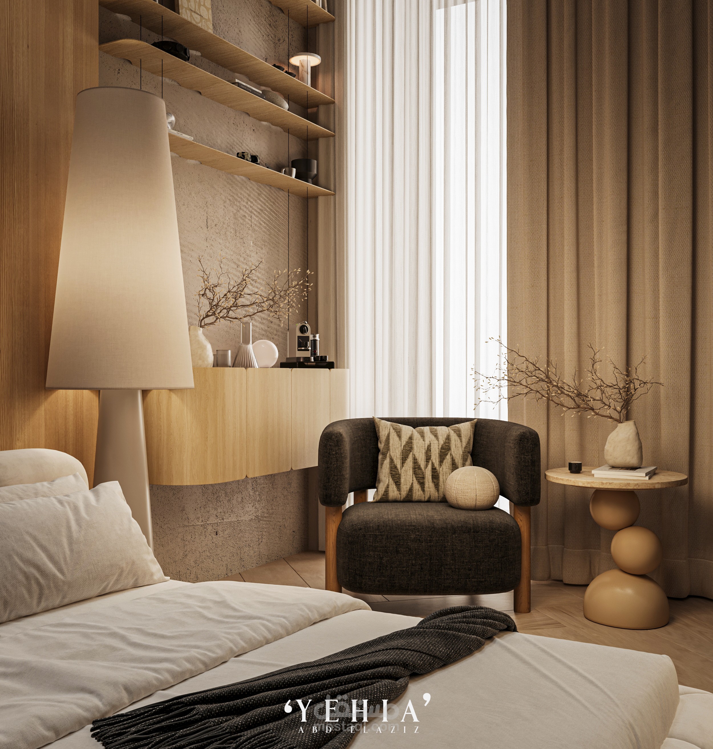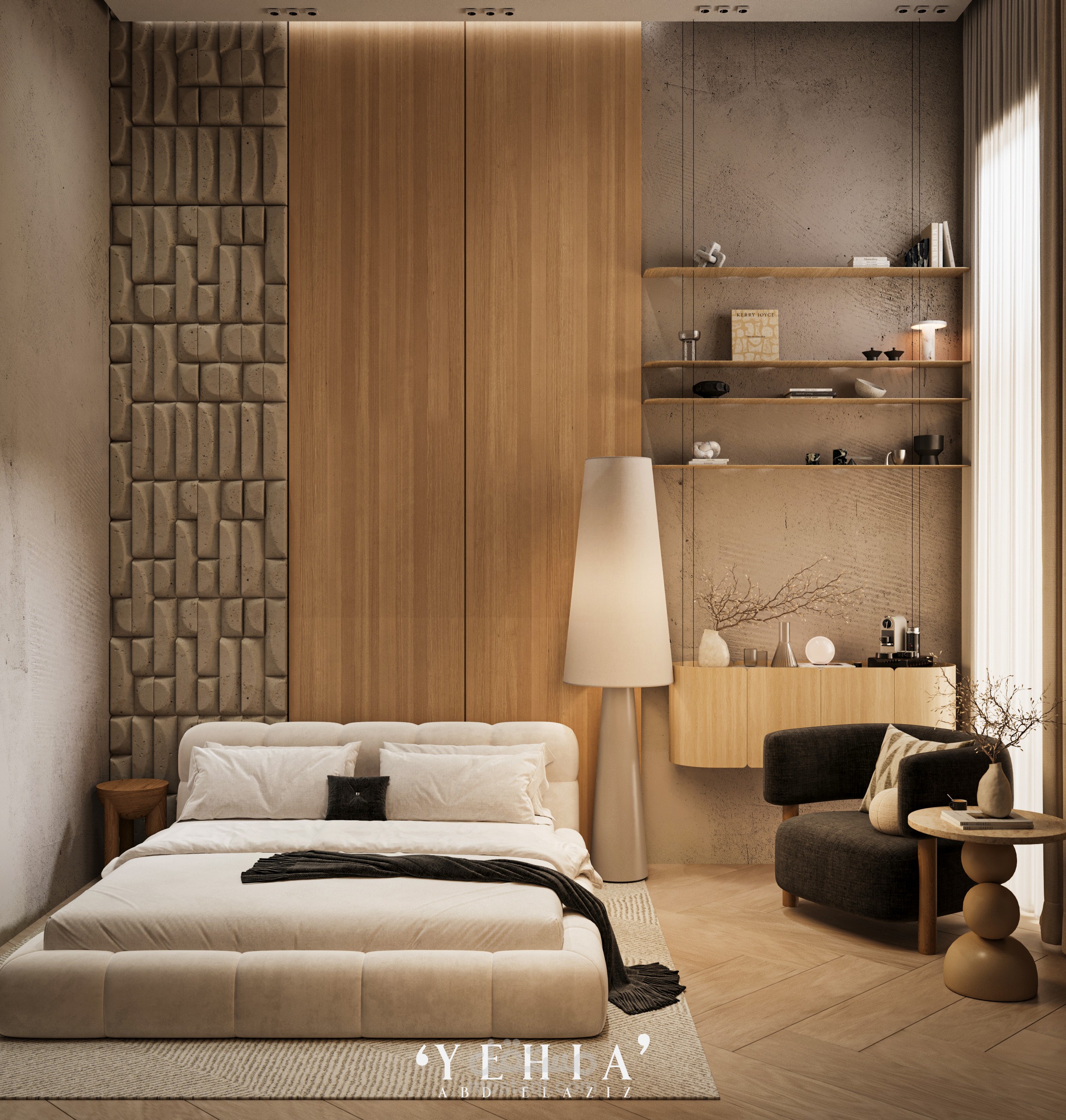 تصميم داخلي لغرفة نوم بتفاصيل هادئة وأنيقة تجمع بين الخشب الطبيعي، الإضاءة الدافئة، والخامات الناعمة لخلق أجواء مريحة ومترفة.