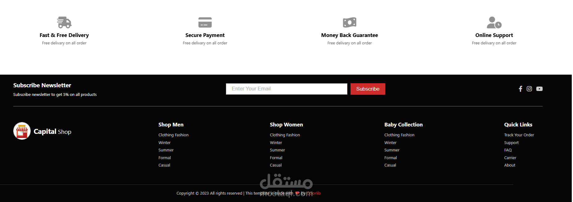 موقع إلكتروني متكامل لمتجر ملابس بيعرض تشكيلات متنوعة للرجال والنساء والأطفال بشكل احترافي وواضح. الهدف منه يكون بسيط وسهل لأي زائر يدخل يلاقي القطع اللي تناسب ذوقه، يشوف تفاصيل المنتج، يختار المقاس واللون، ويقدر يضيفها للسلة ويكمل طلبه بخطوات بسيطة.