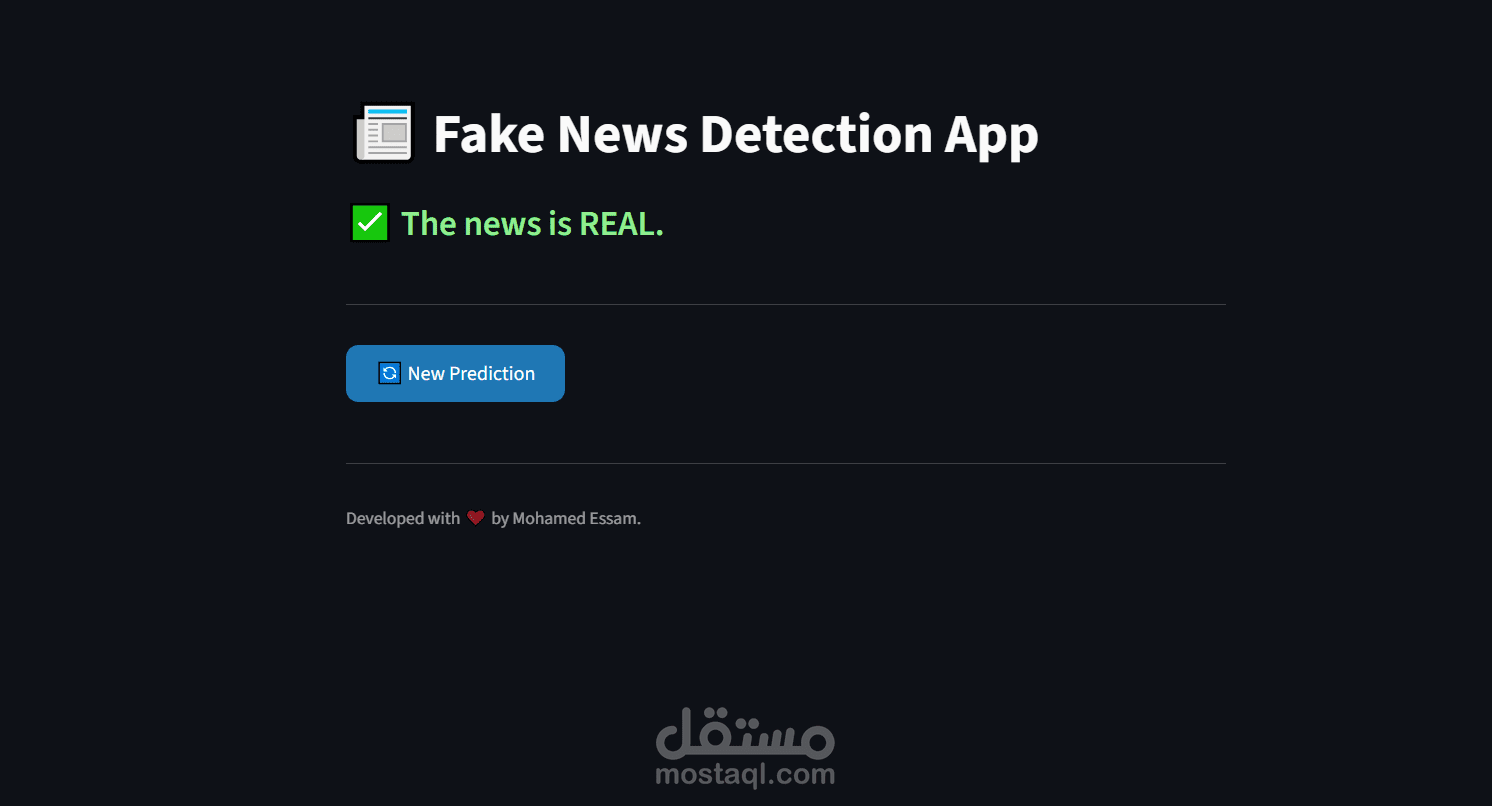 Usage: Enter a news title and content, click “ Predict”, and instantly see whether the article is real or fake — with the option to start a new prediction anytime.