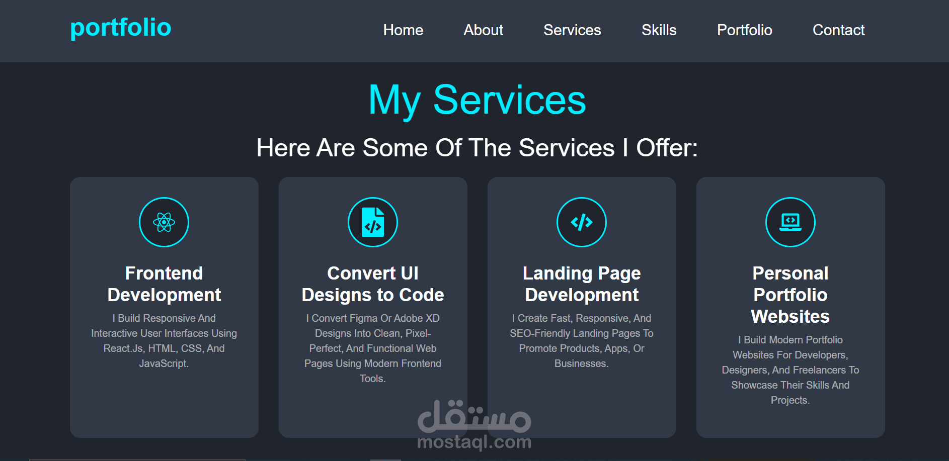 هذا مشروع موقع بورتفوليو شخصي قمت بتصميمه وتطويره باستخدام React.js وTailwind CSS.