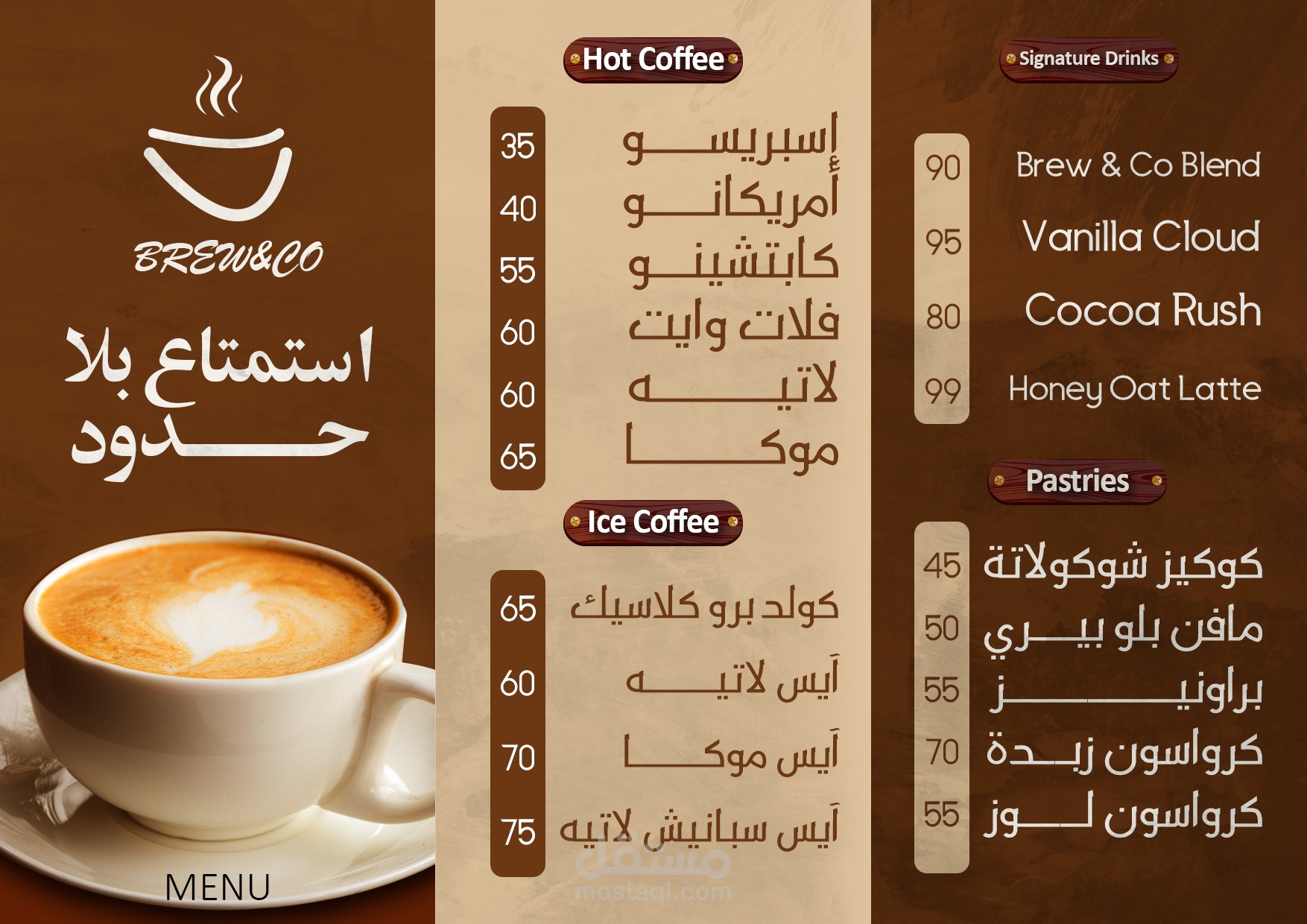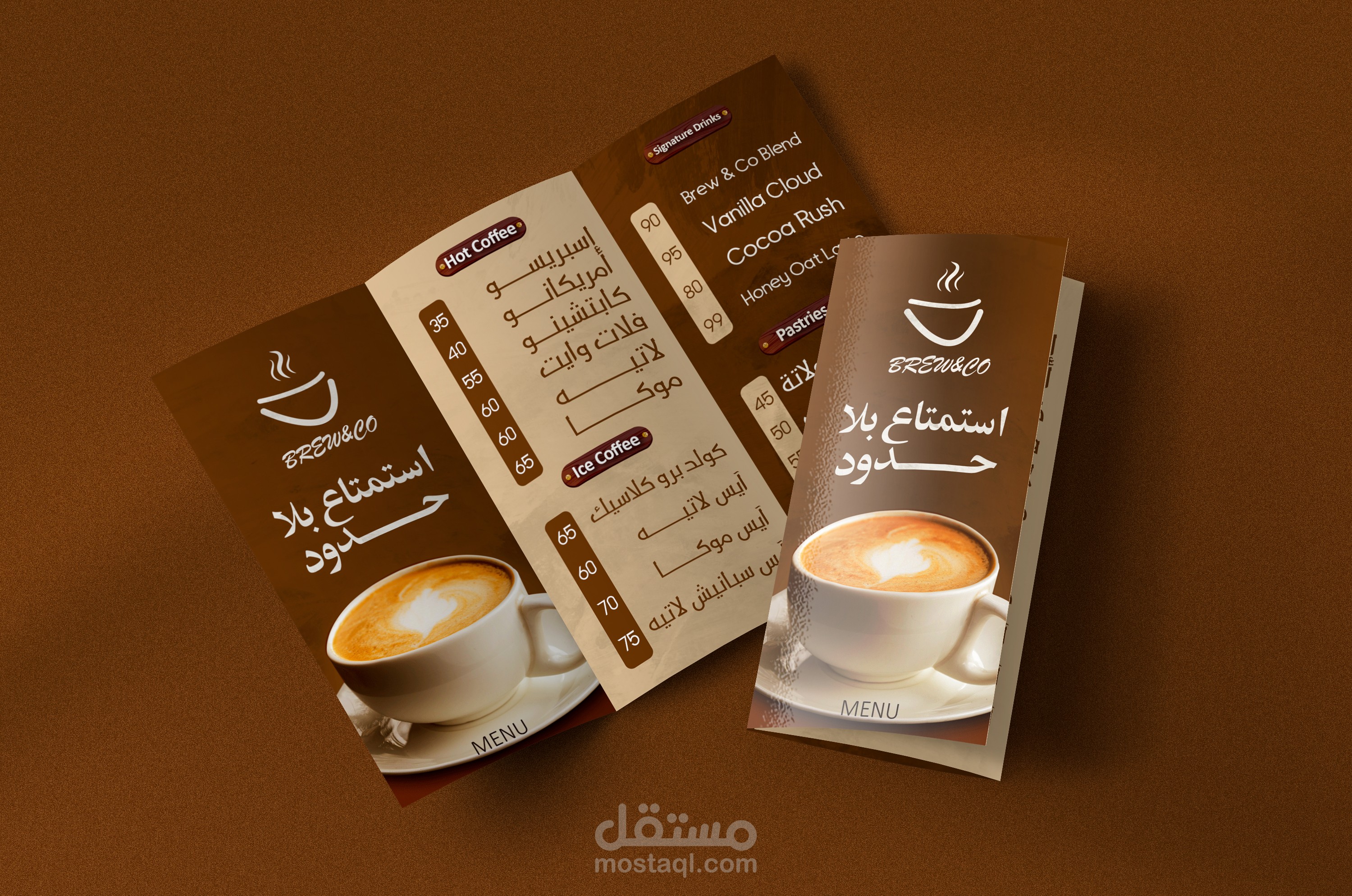 مشروع Brew & Co هو براند متخصص في القهوة المختصة، تم العمل عليه بشكل متكامل بدءًا من بناء الهوية البصرية وحتى التصميمات التسويقية.