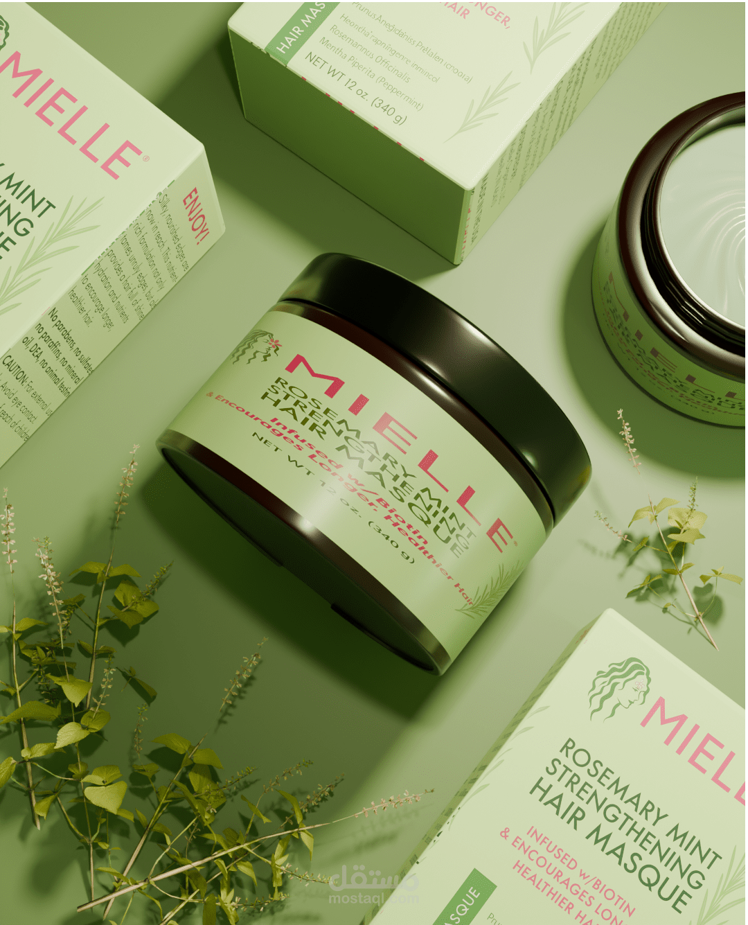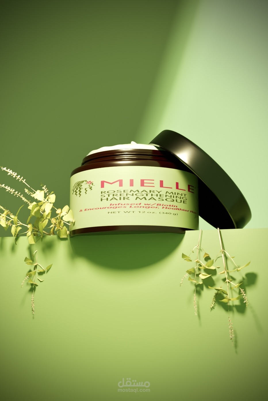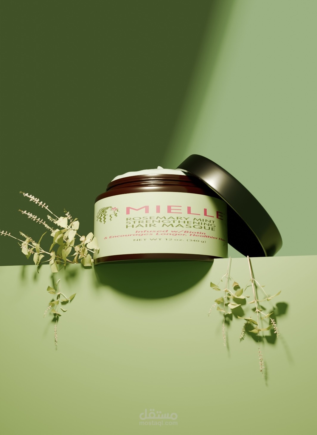 نموذجة علبة كريم Mielle بشكل واقعي باستخدام Blender، ثم وضعها داخل تصميم بصري بسيط يشبه صورة إعلانية.