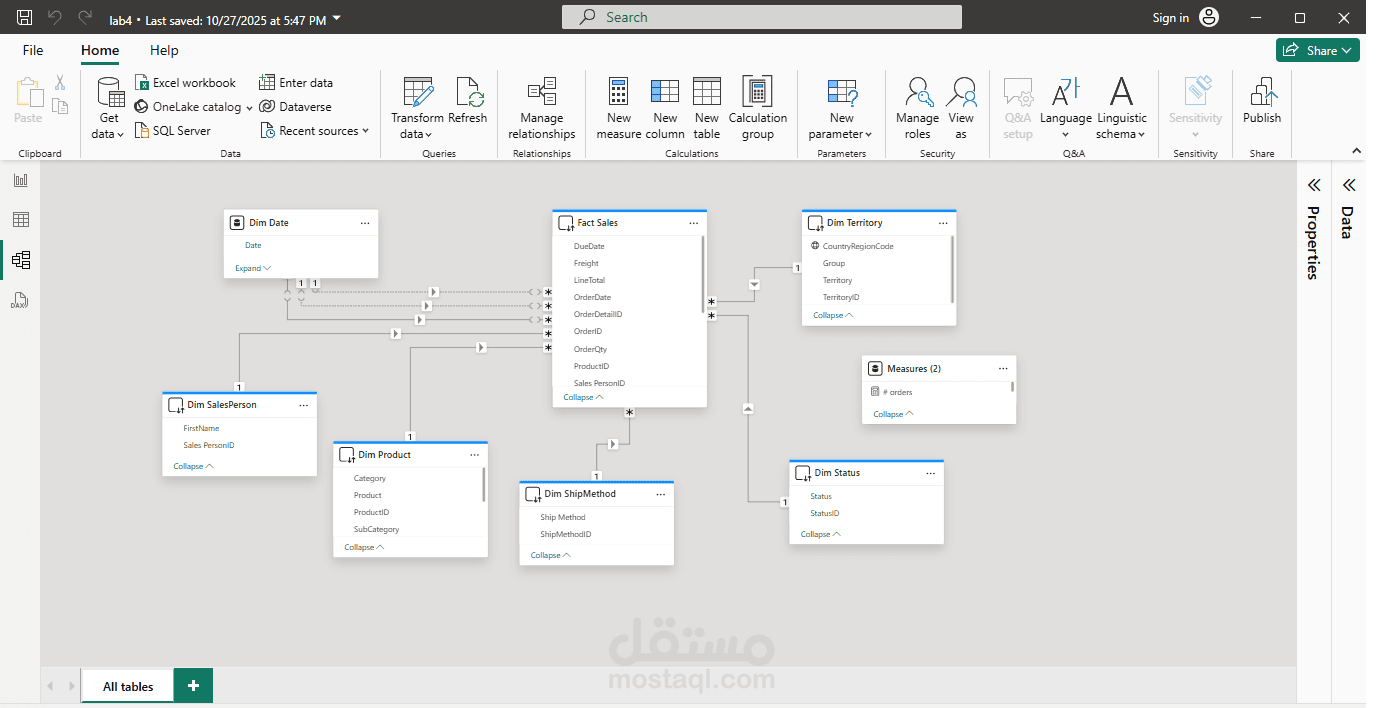 إعداد نموذج بيانات تحليلي يحتوي على جدول وقائع (Fact_SalesOrder) وجداول أبعاد (المنتجات – العملاء – المندوبين – المناطق – الوقت).