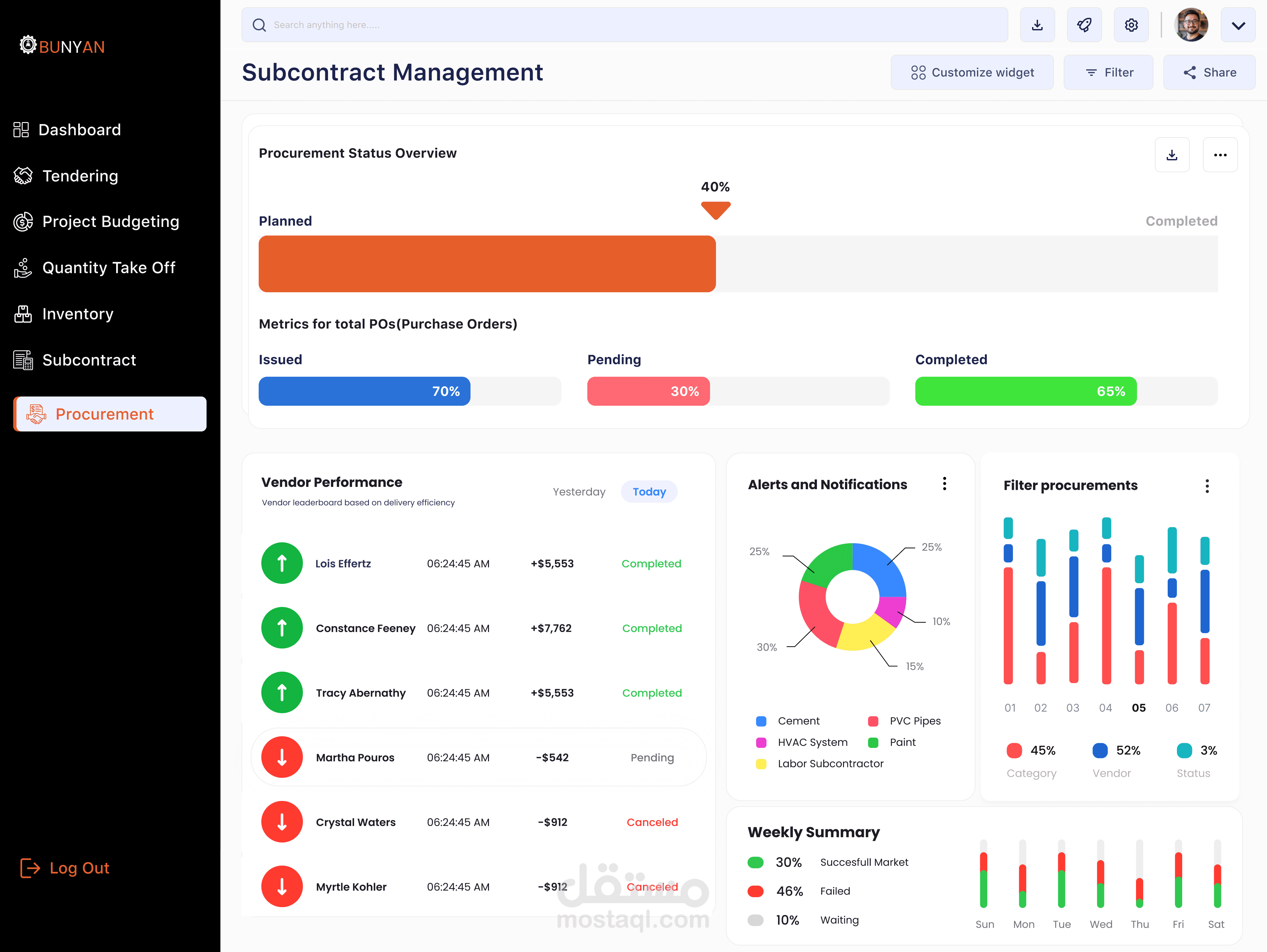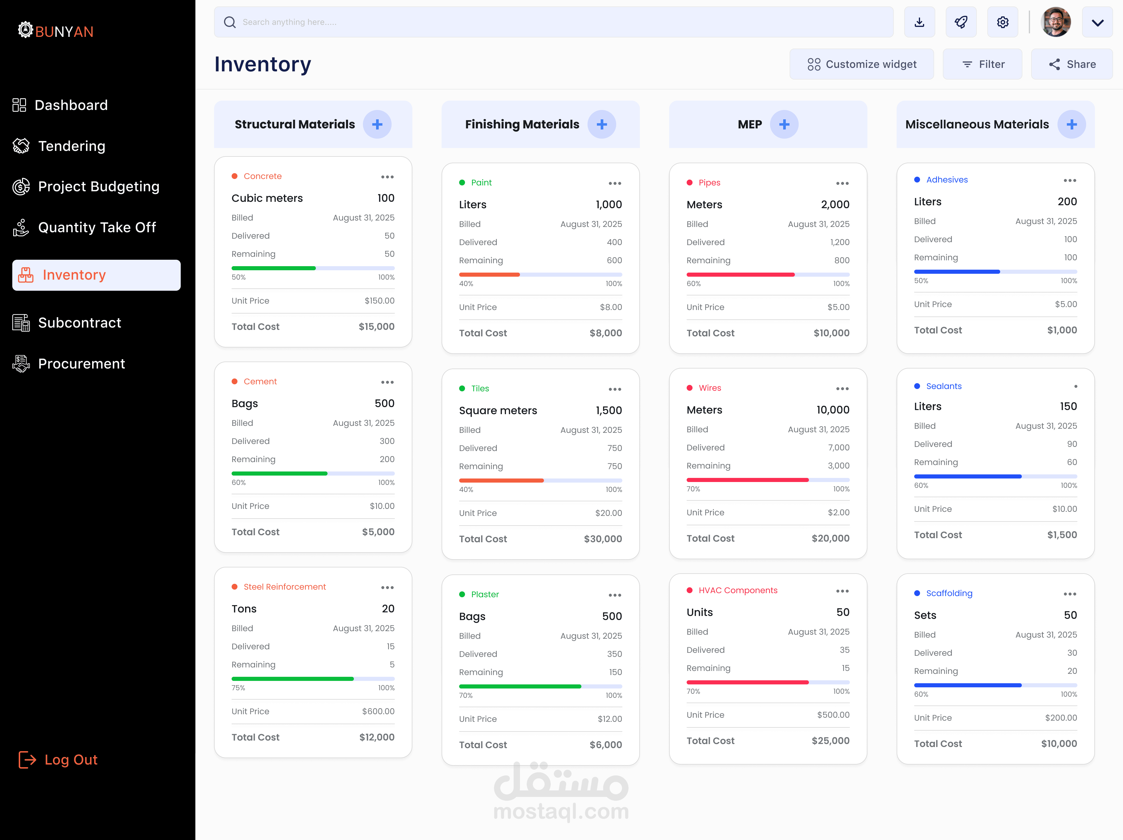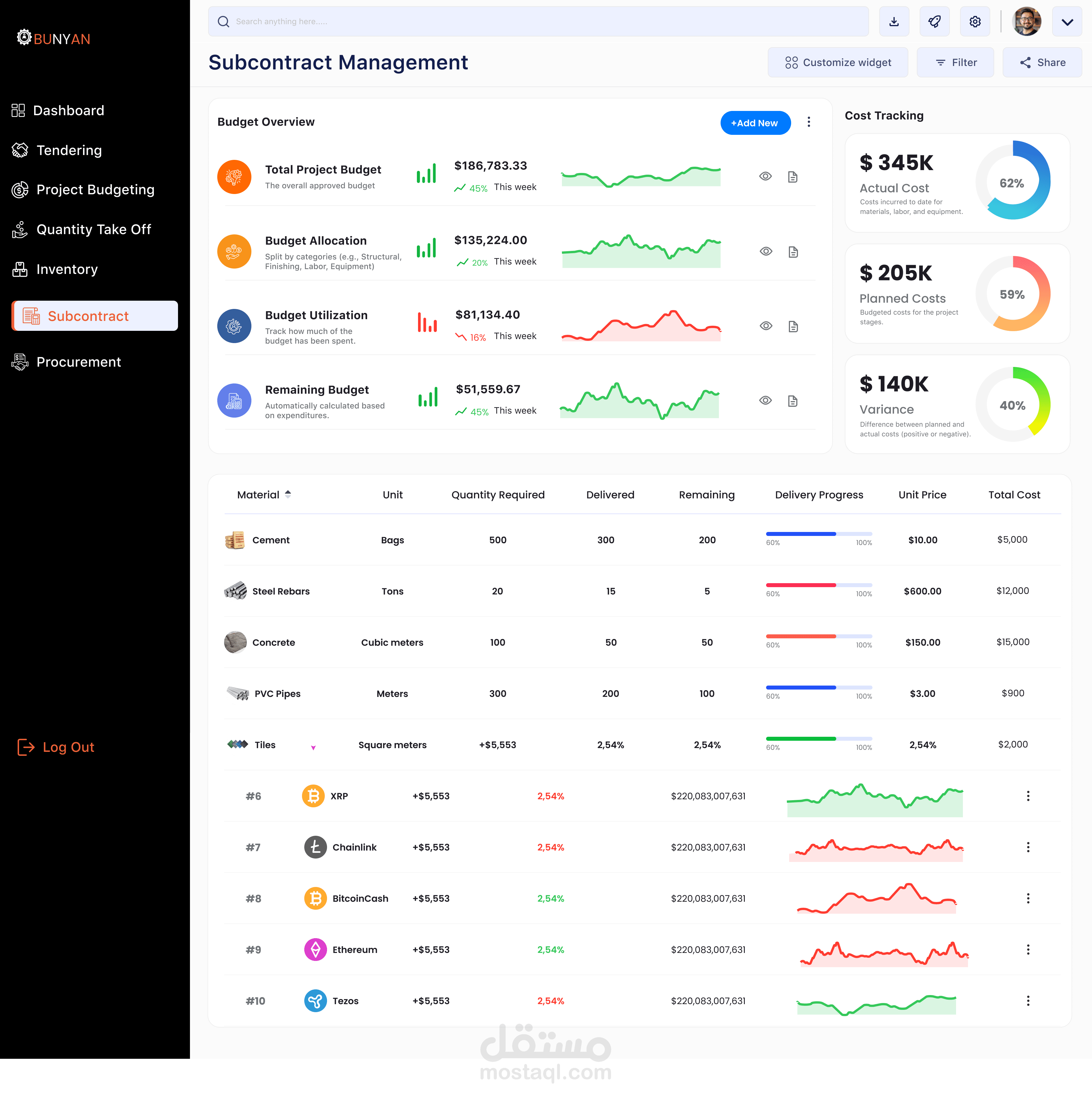 The BUNYAN Construction ERP System UI/UX project was aimed at developing a centralized, intuitive, and comprehensive platform for construction companies to manage the entire lifecycle of their projects. It was designed to streamline key operations including tendering, project budgeting, quantity take-off, subcontract management, and procurement. The primary goal was to enhance usability, improve operational efficiency, and provide clear data visualizations through an intuitive dashboard, enabling project managers to make informed decisions quickly and effectively.