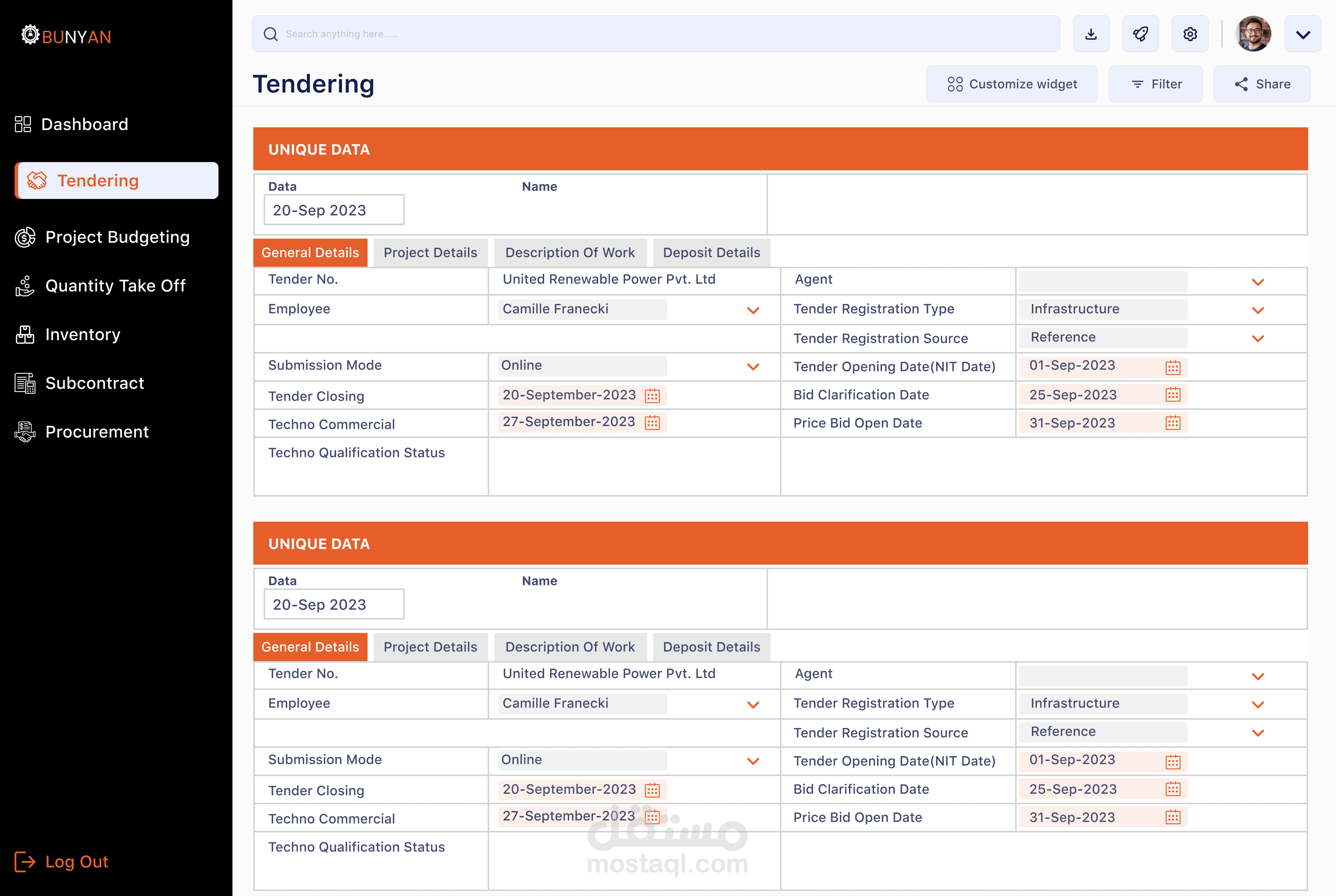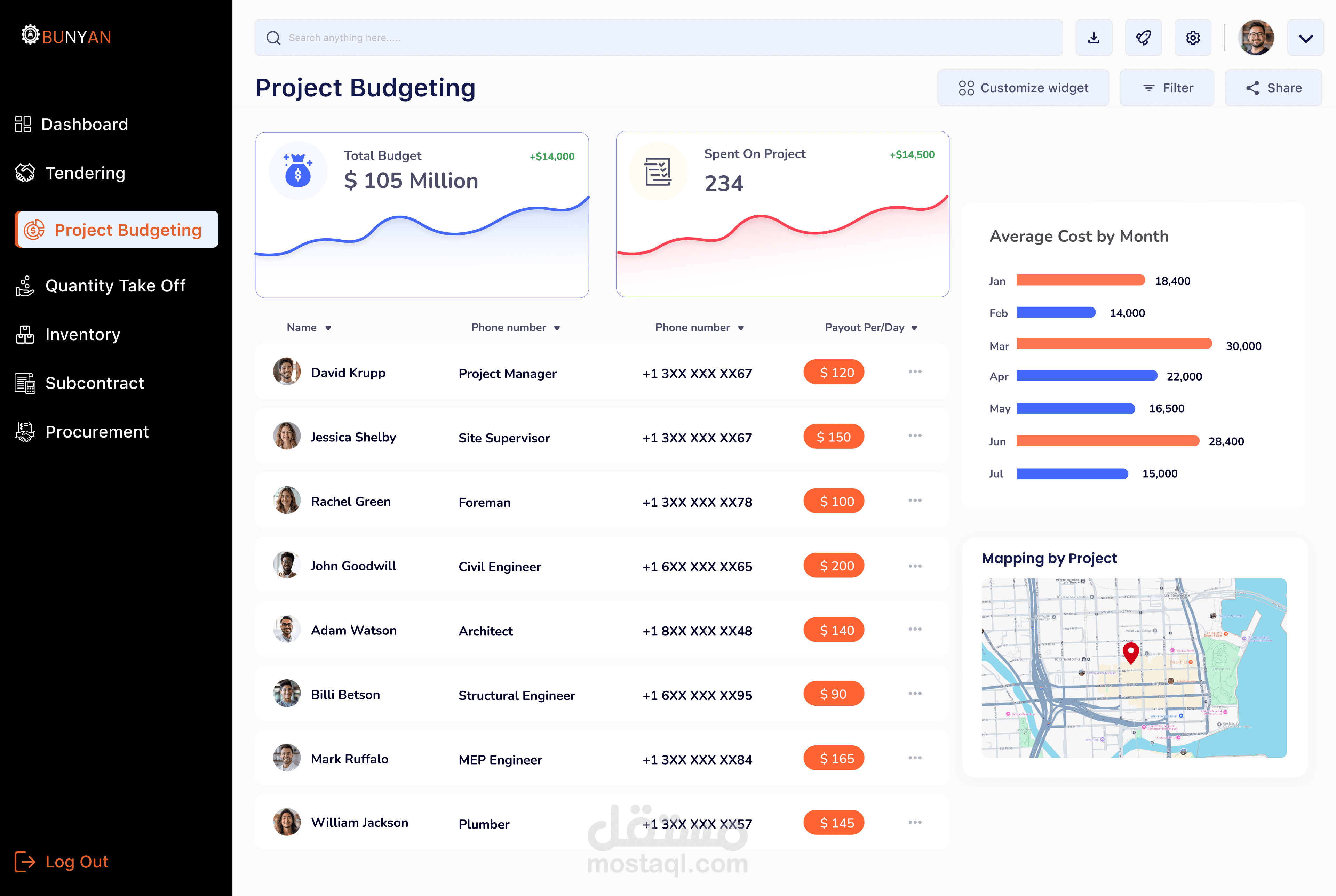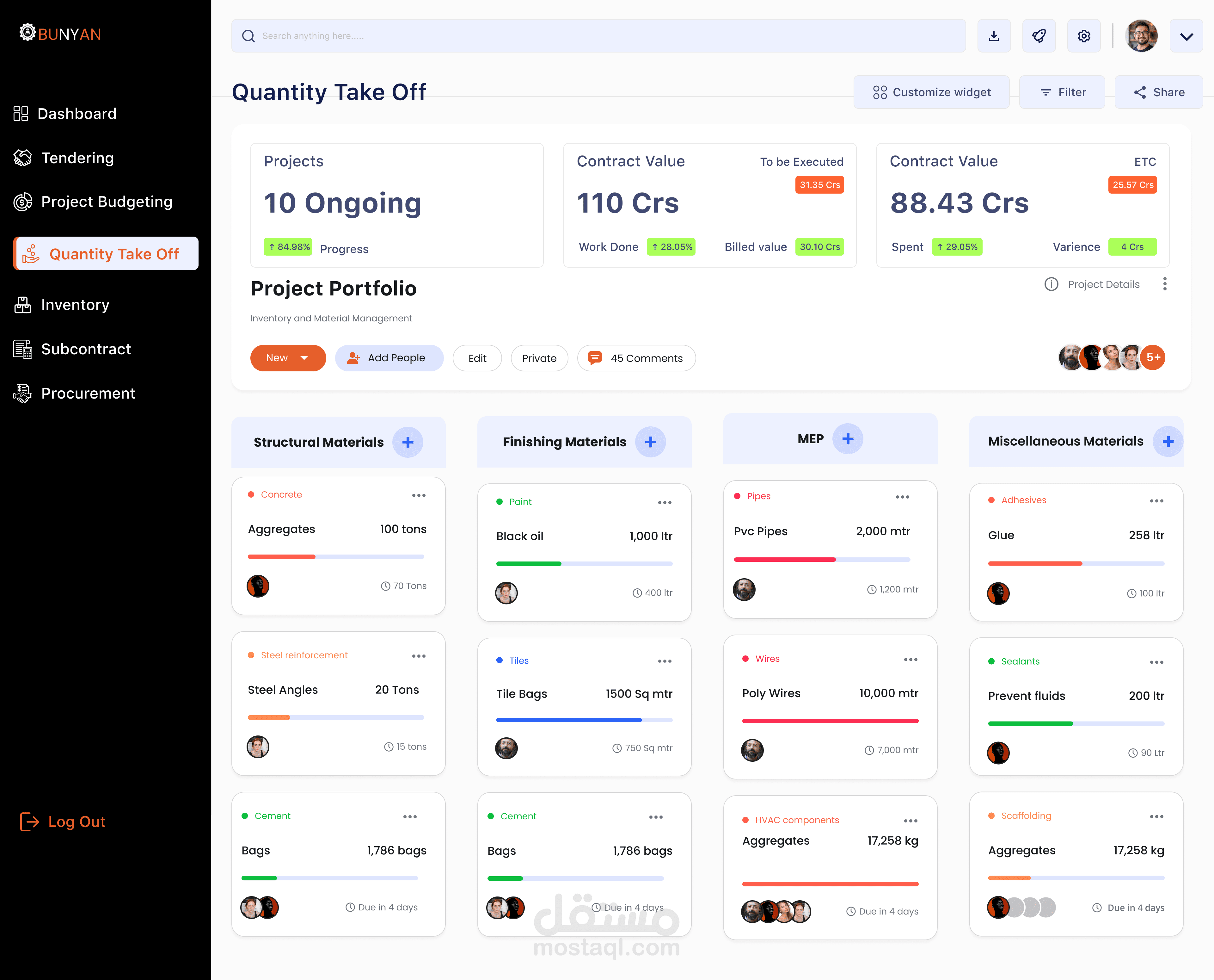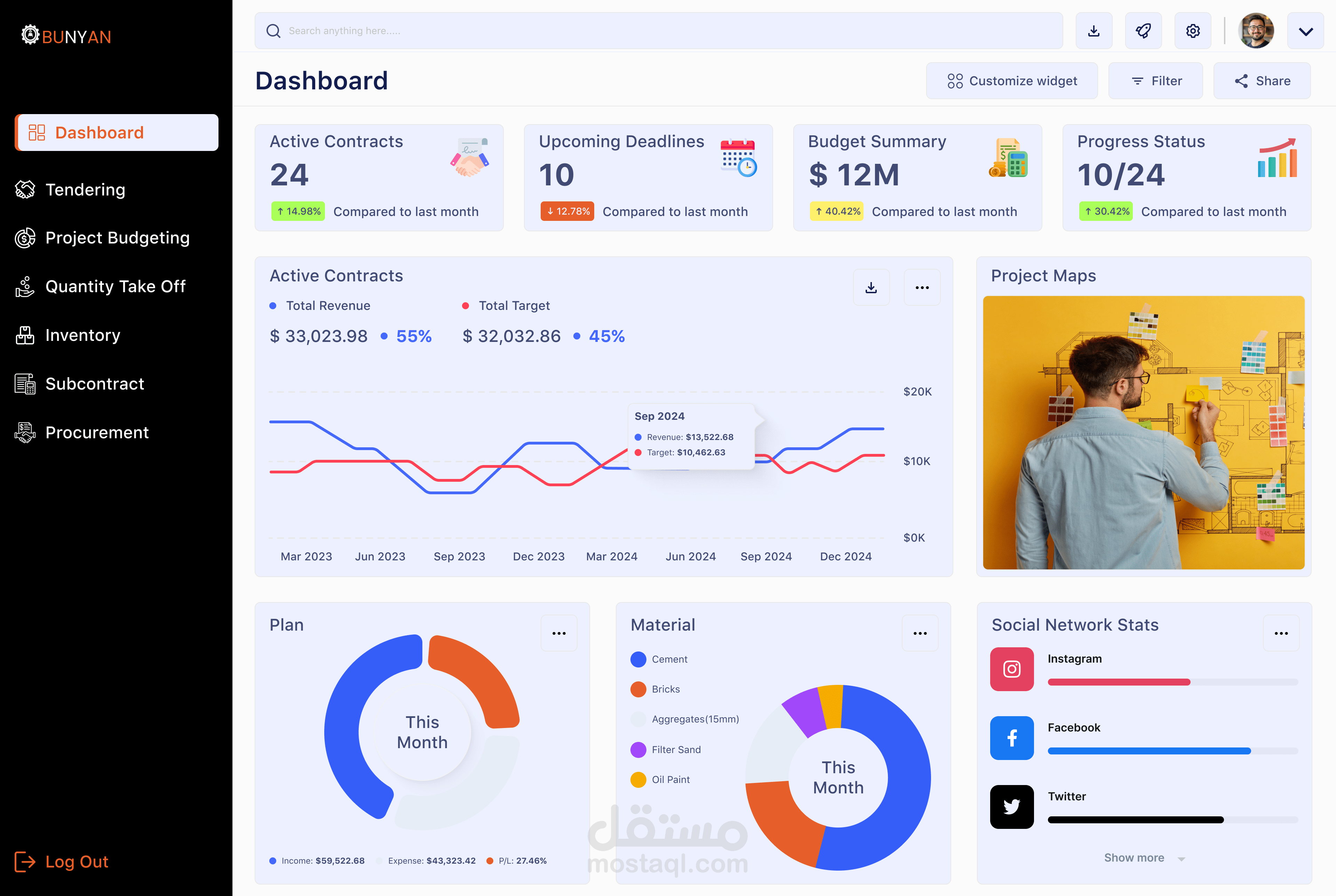 The BUNYAN Construction ERP System UI/UX project was aimed at developing a centralized, intuitive, and comprehensive platform for construction companies to manage the entire lifecycle of their projects. It was designed to streamline key operations including tendering, project budgeting, quantity take-off, subcontract management, and procurement. The primary goal was to enhance usability, improve operational efficiency, and provide clear data visualizations through an intuitive dashboard, enabling project managers to make informed decisions quickly and effectively.