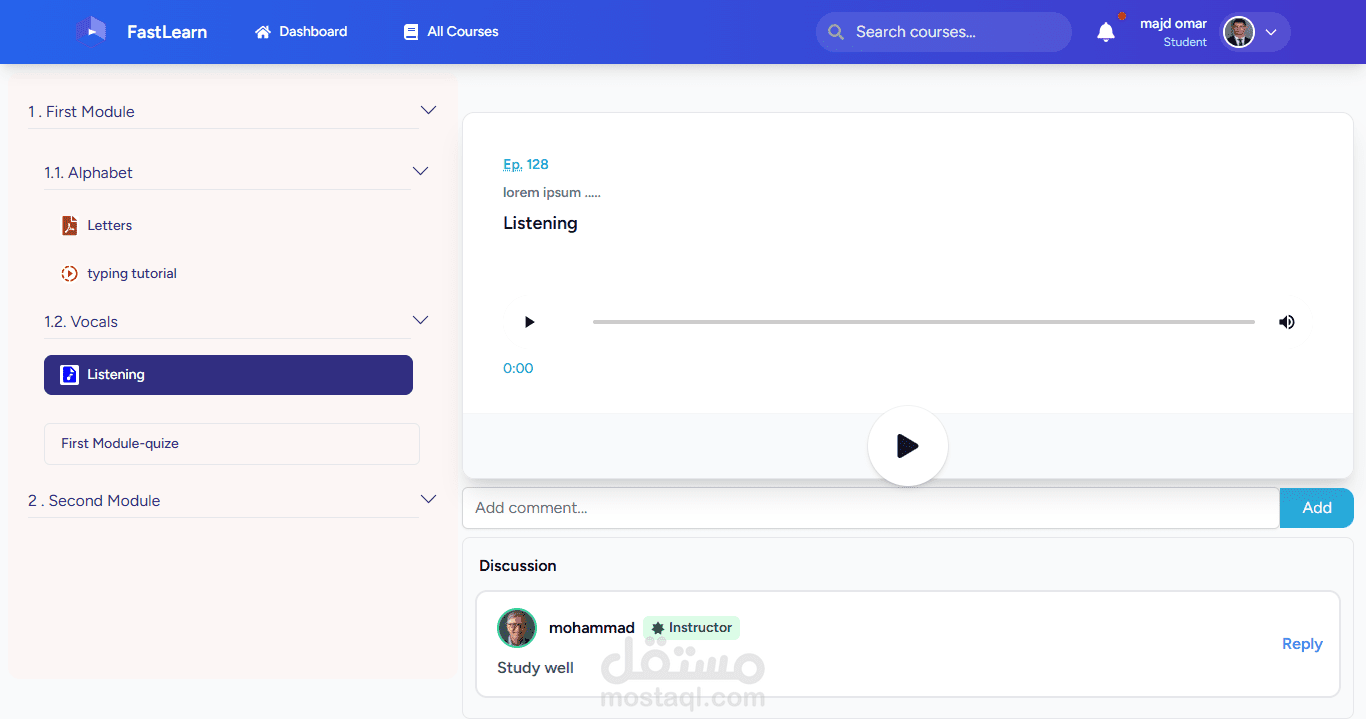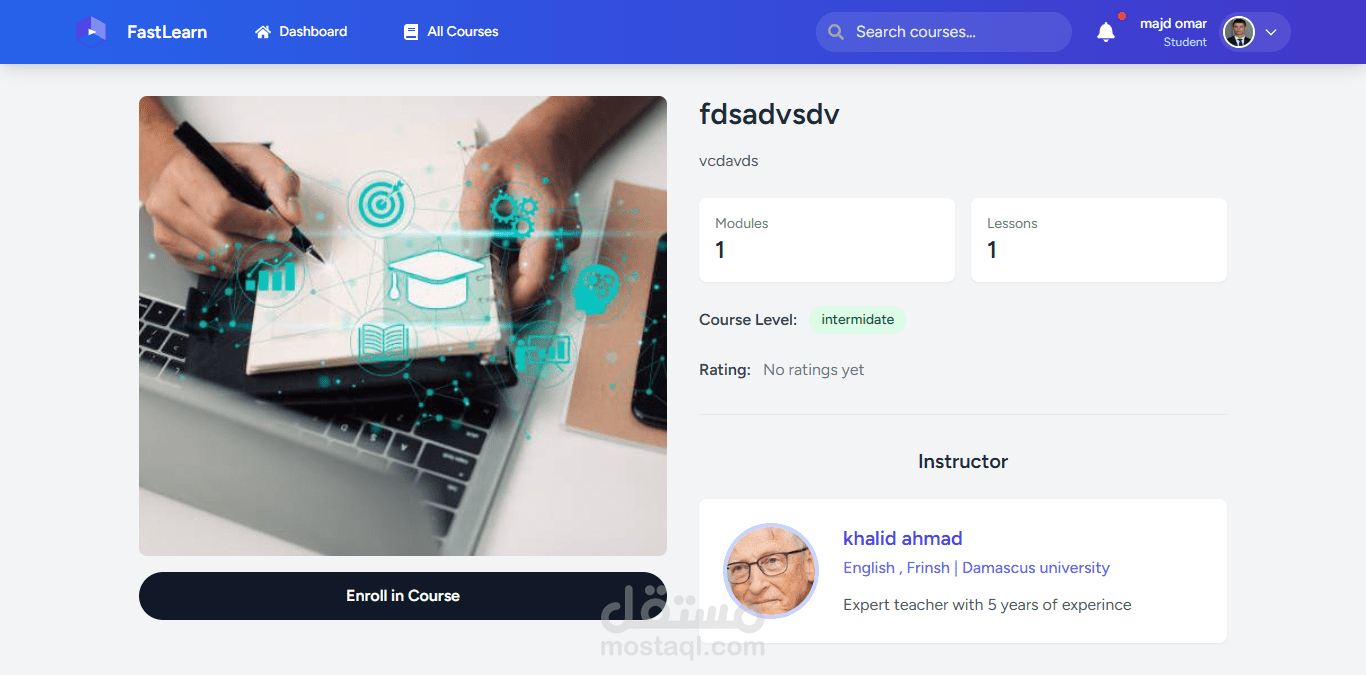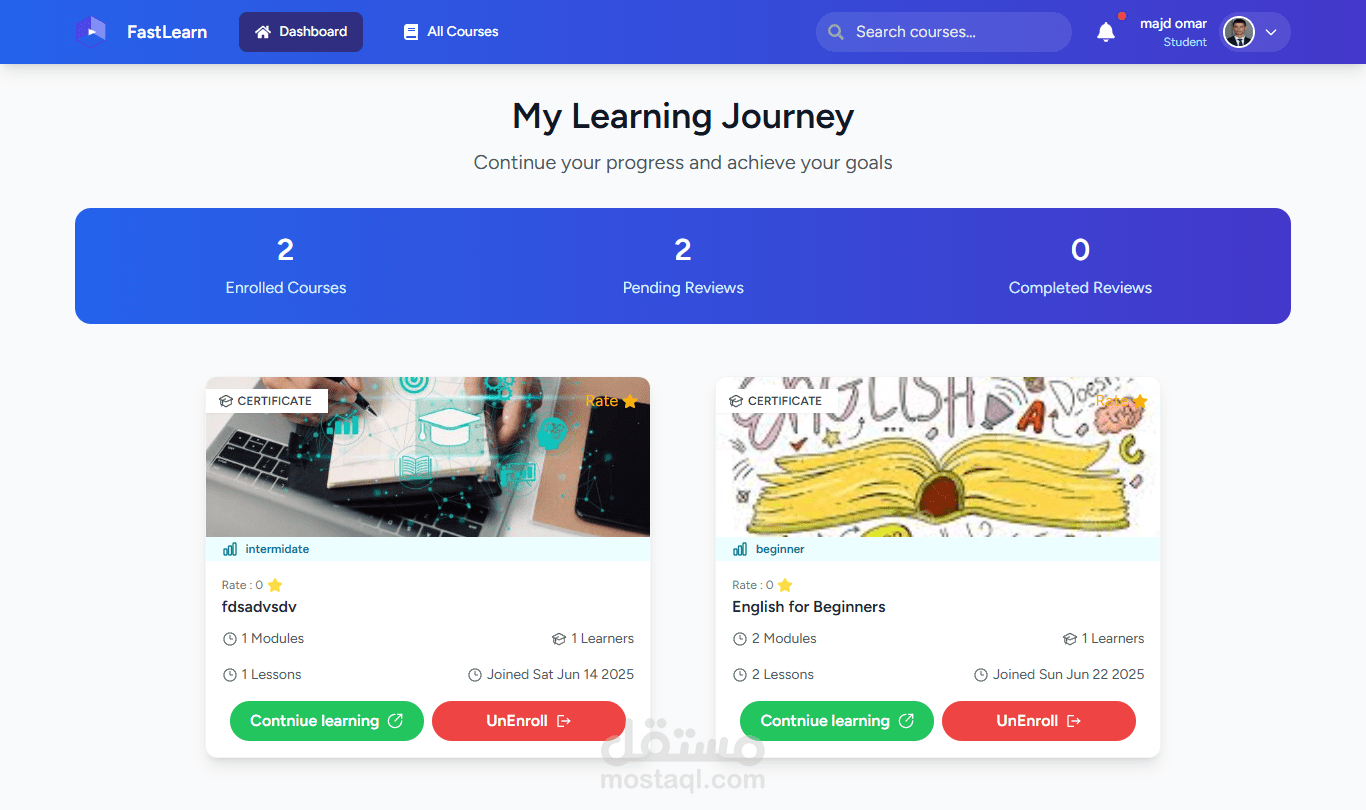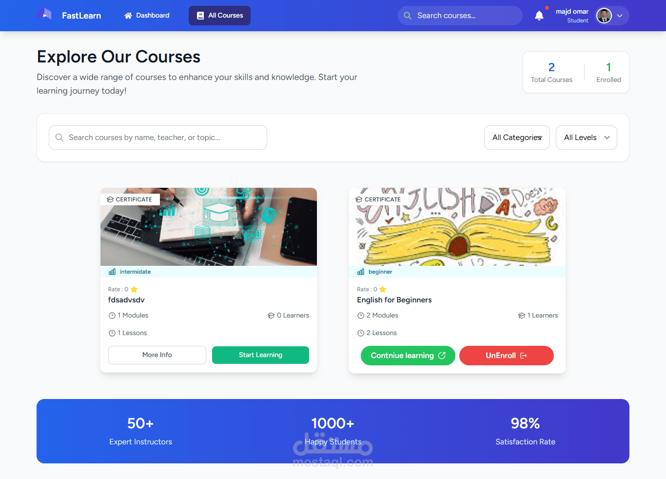 الطالب يمكنه استعراض الكورسات المتاحة في الموقع وعرض تفاصيلها والاشتراك بها , عند الاشتراك يمكنه البدء بالتعلم وحل الاختبارات .