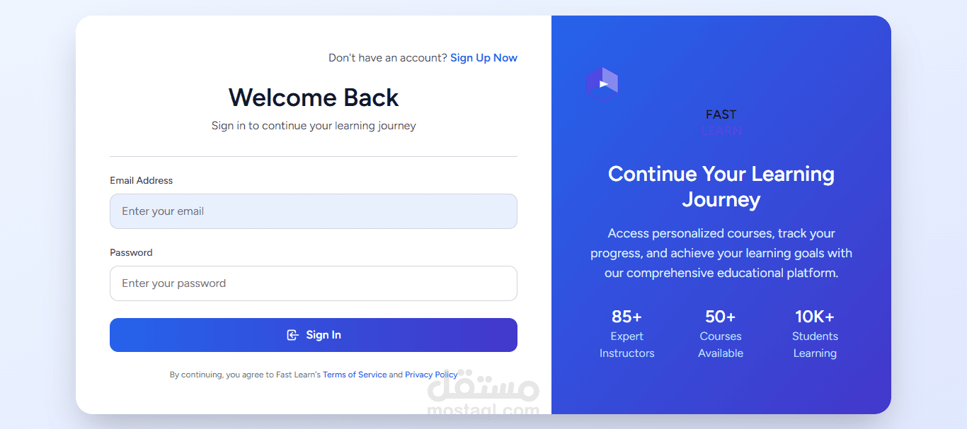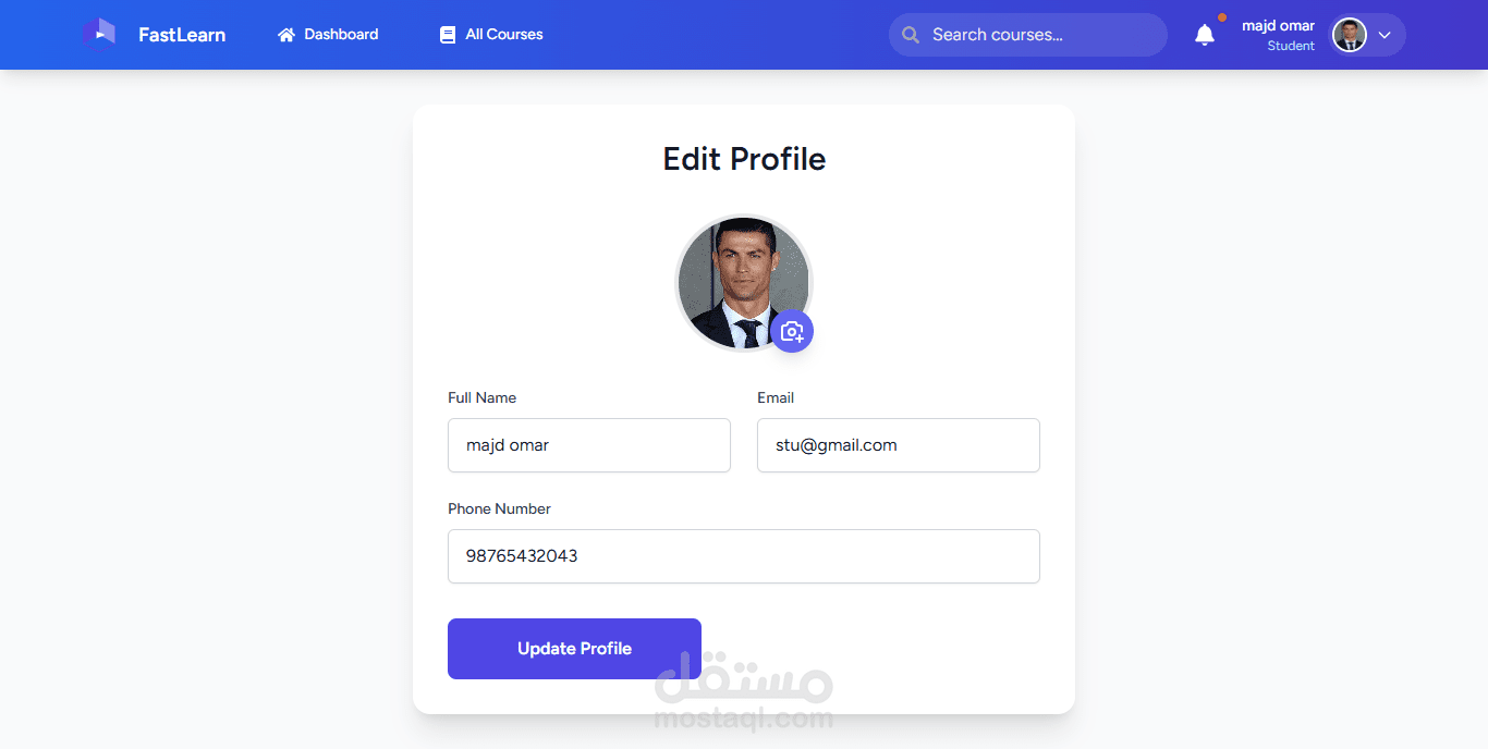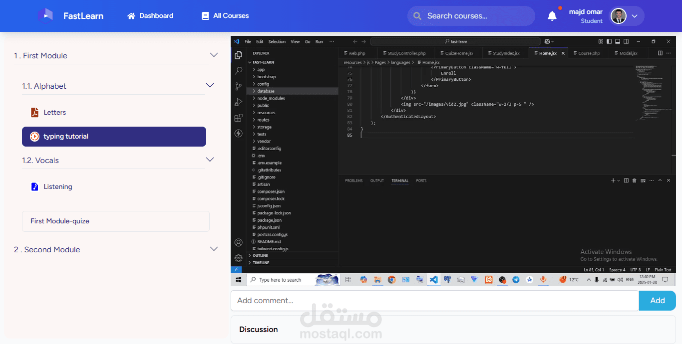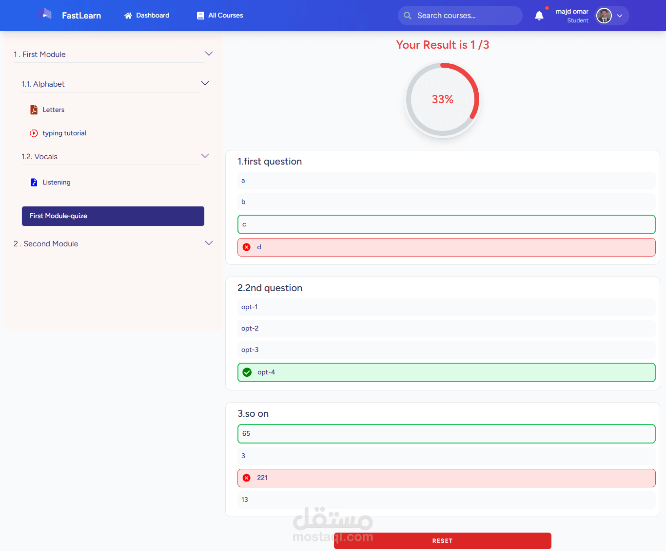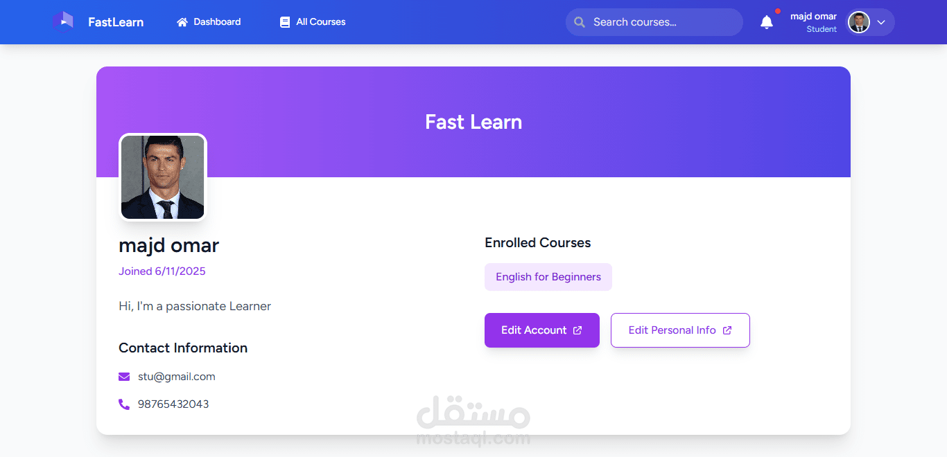 الطالب يمكنه استعراض الكورسات المتاحة في الموقع وعرض تفاصيلها والاشتراك بها , عند الاشتراك يمكنه البدء بالتعلم وحل الاختبارات .