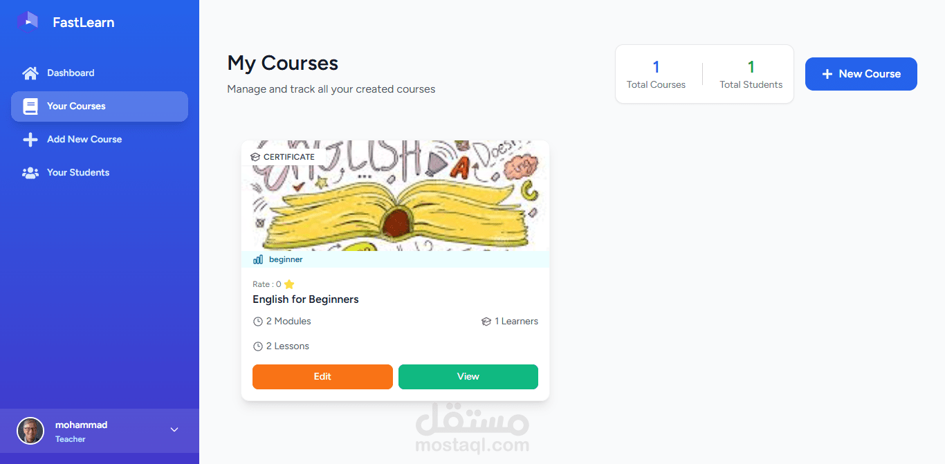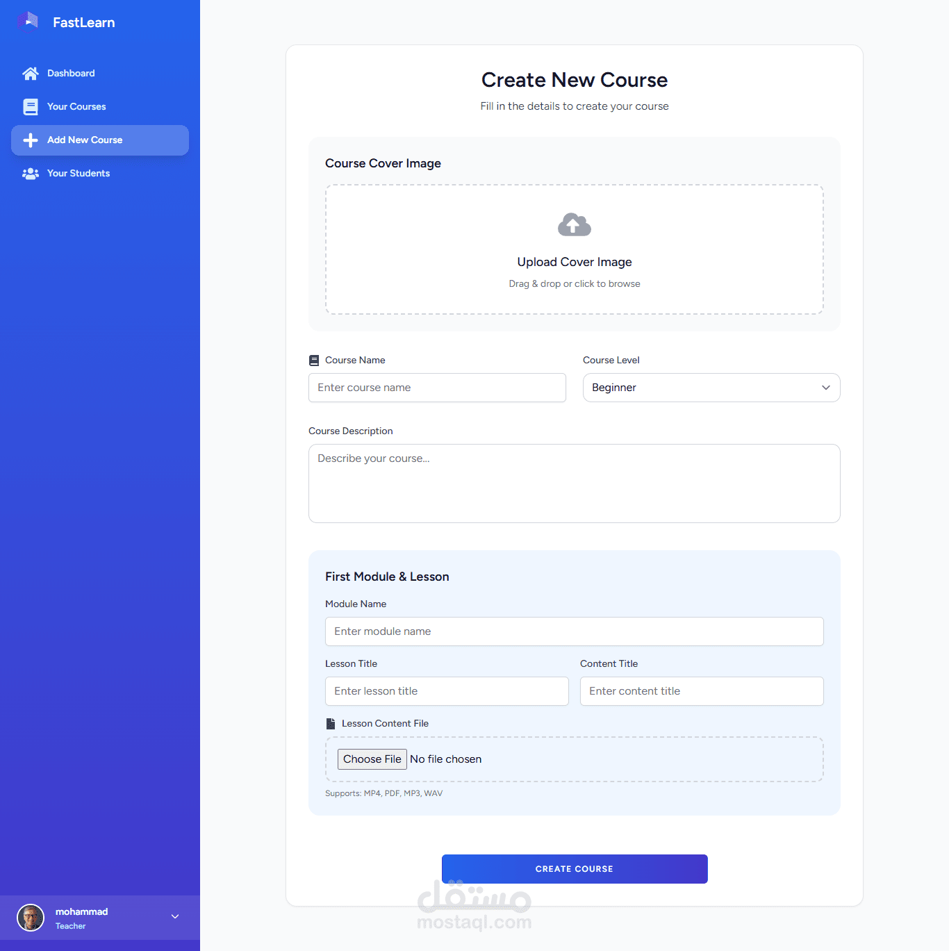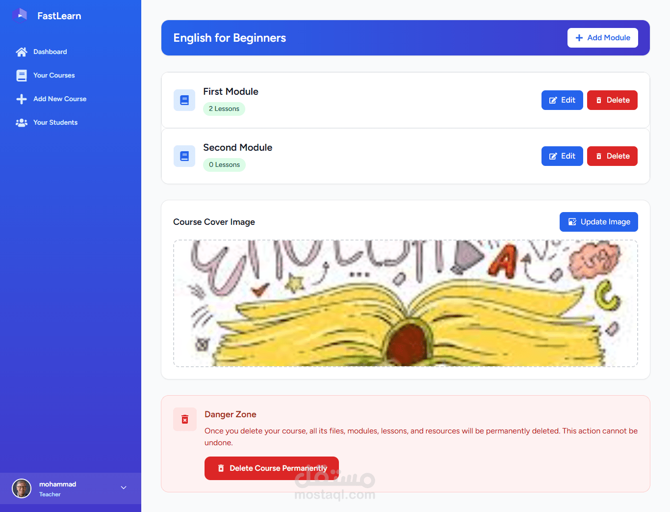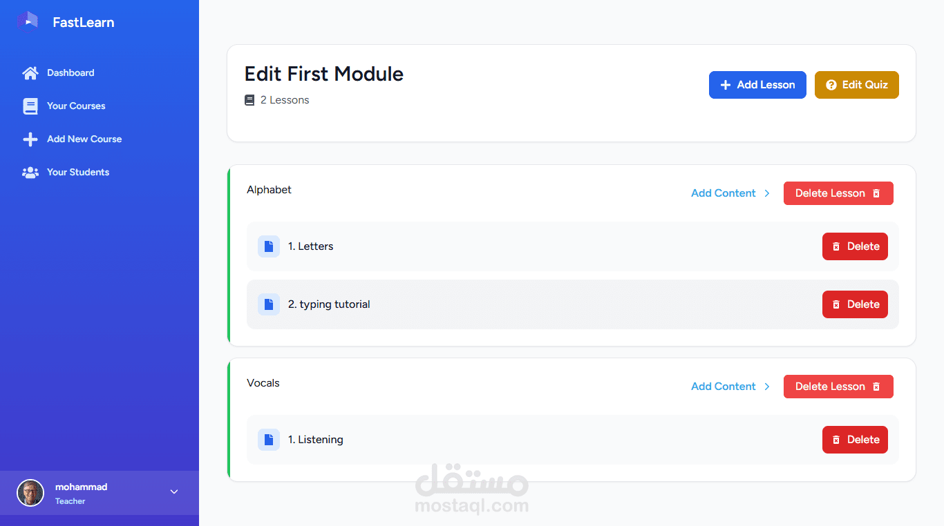 المدرس يمكنه اضافة كورسات حيث كل كورس يحوي اقسام وكل قسم يحوي دروس وفي نهايته اختبار , كل درس يحوي محتويات متعددة يمكن ان تكون ملفات فيديو أو ملفات صوتية أو ملفات pdf .