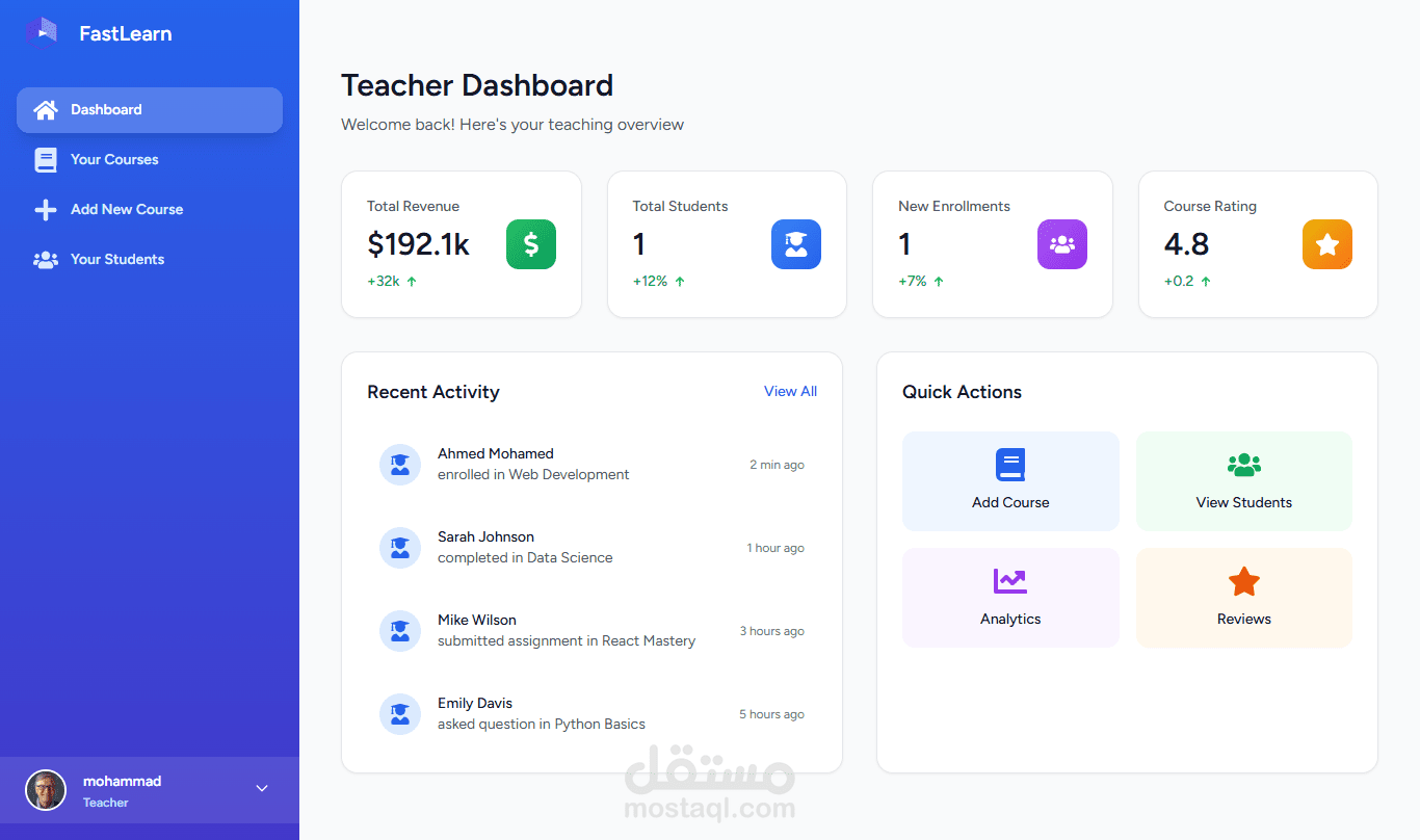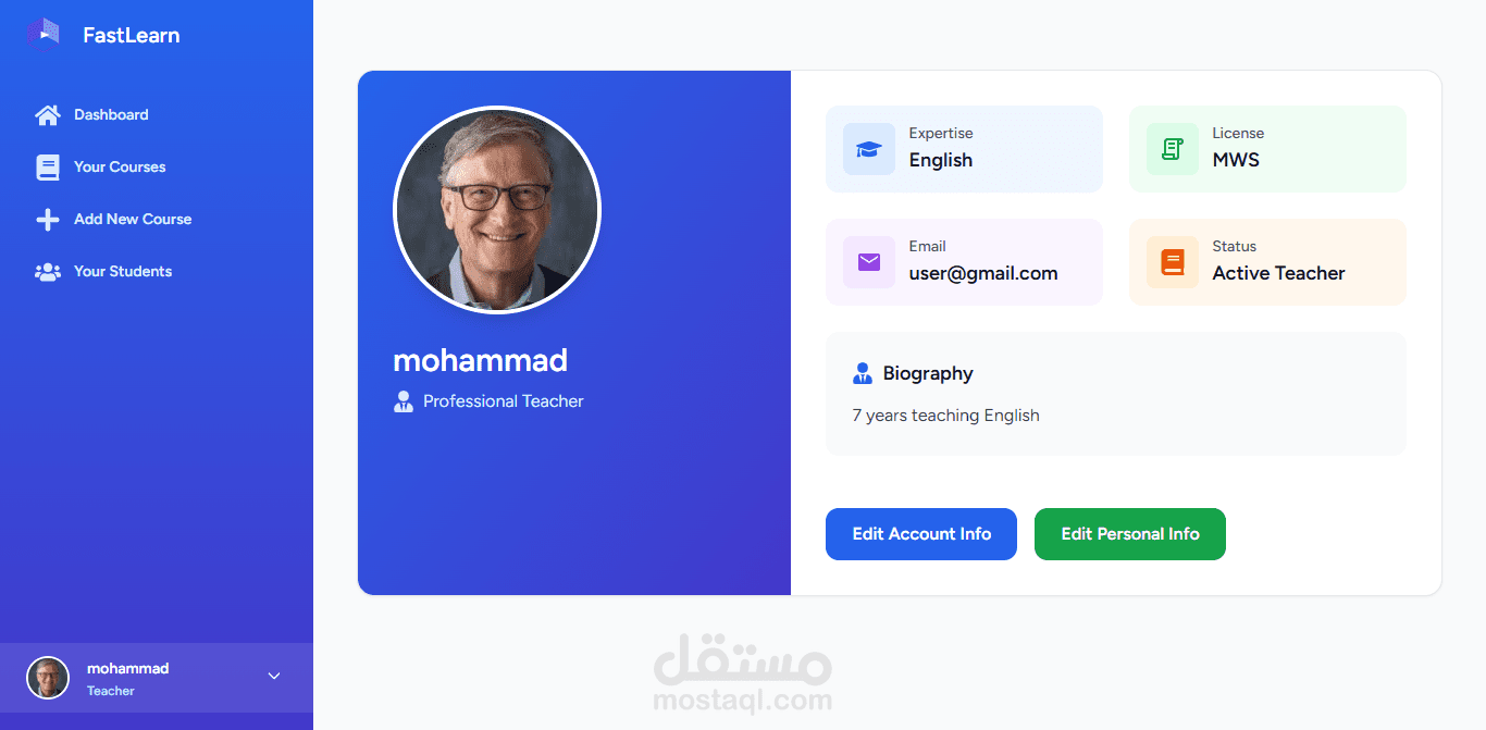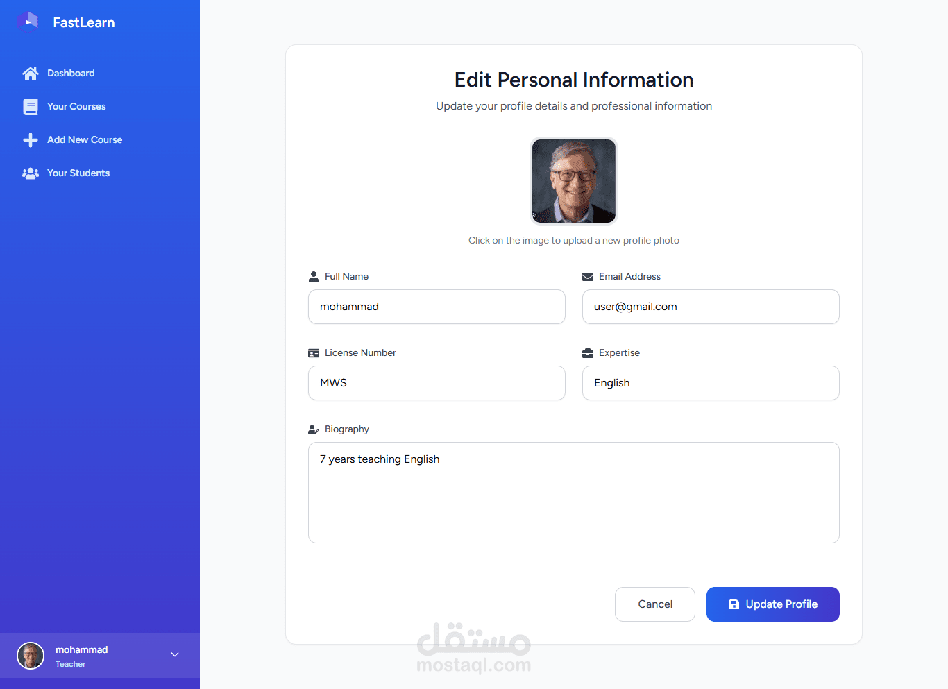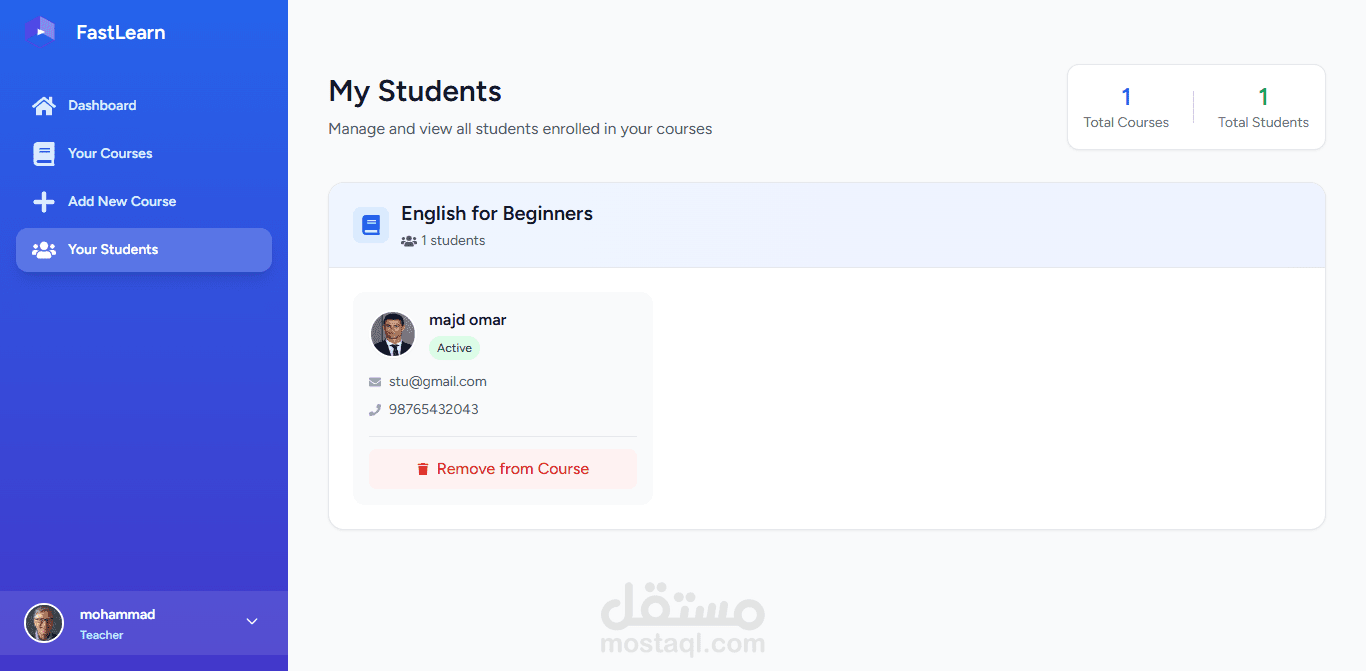 المدرس يمكنه اضافة كورسات حيث كل كورس يحوي اقسام وكل قسم يحوي دروس وفي نهايته اختبار , كل درس يحوي محتويات متعددة يمكن ان تكون ملفات فيديو أو ملفات صوتية أو ملفات pdf .