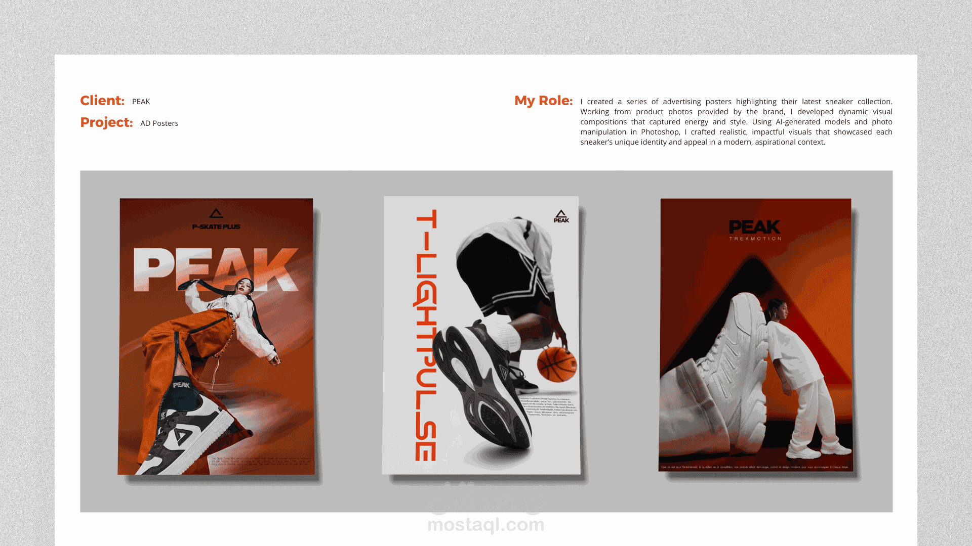 I created a series of advertising posters highlighting their latest sneaker collection. Working from product photos provided by the brand, I developed dynamic visual compositions that captured energy and style. Using AI-generated models and photo manipulation in Photoshop, I crafted realistic, impactful visuals that showcased each sneaker’s unique identity and appeal in a modern, aspirational context.