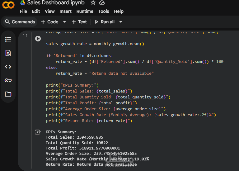 إجمالي المبيعات، إجمالي الكمية المباعة، إجمالي الأرباح، معدل النمو، معدل الإرجاع، ومتوسط حجم الطلب.