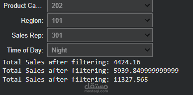 تُمكّن المستخدم من تصفية البيانات حسب: الفئة، المنطقة، مندوب المبيعات، الشهر، وفترة اليوم.